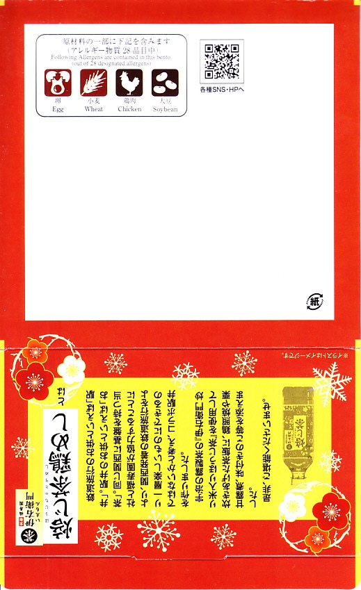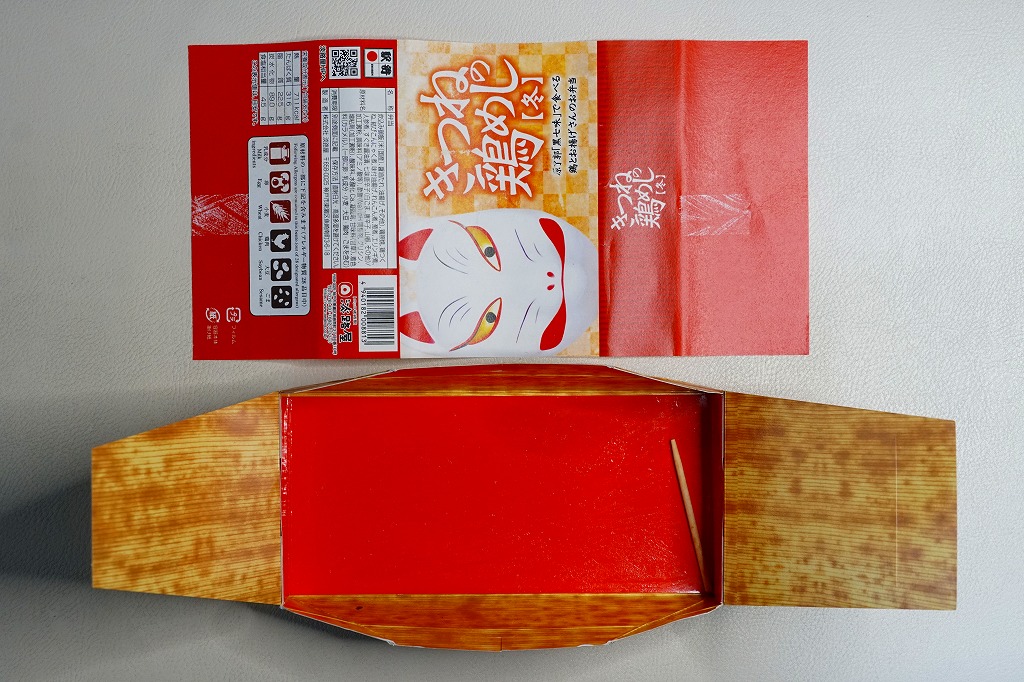 2020(令和2)年の12月に発売。人気の新神戸駅弁「きつねの鶏めし」について、2020(令和2)年9月に初めて季節の商品「秋」を発売、続いて春が来た。竹皮柄のボール紙製容器にキツネ顔の掛紙を巻くのは、従前の「きつねの鶏めし」と同じ。掛紙の背景で油揚げの市松模様が暖かい。