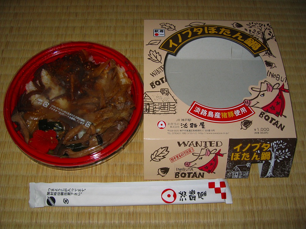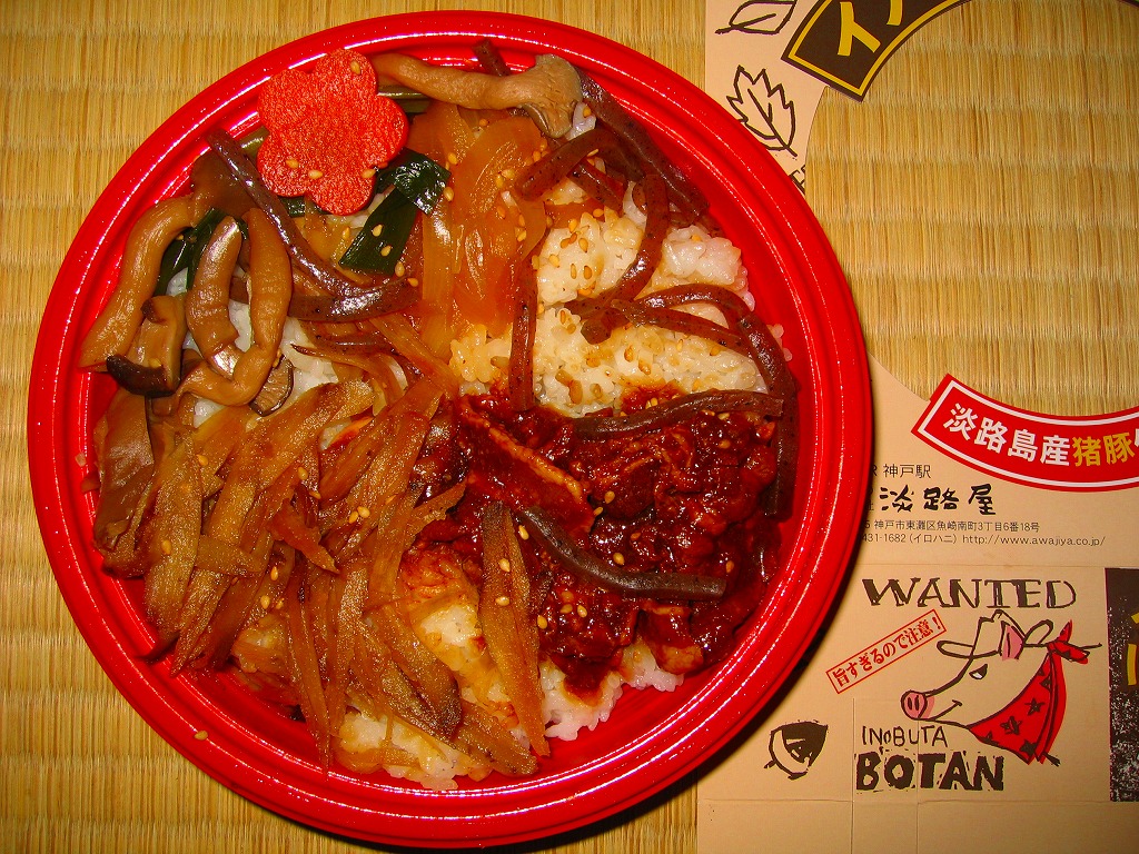 イノシシ年な2007(平成19)年の、1月12日に発売か。ふたが透明な円形のプラ製の惣菜容器を、なんとなくウェスタン風に商品名や景色等を描くボール紙の枠にはめる。中身は白御飯の上に淡路島産のイノブタを味噌煮でちょっぴり載せて、ごぼう、タマネギ、こんにゃく、しめじなどを添える。