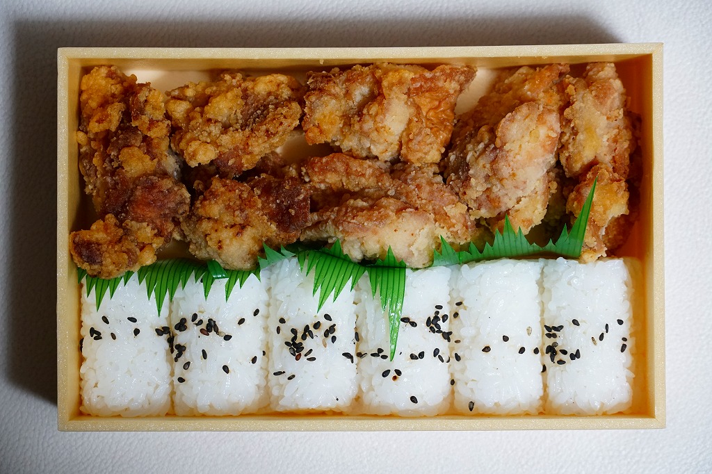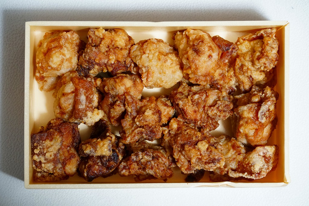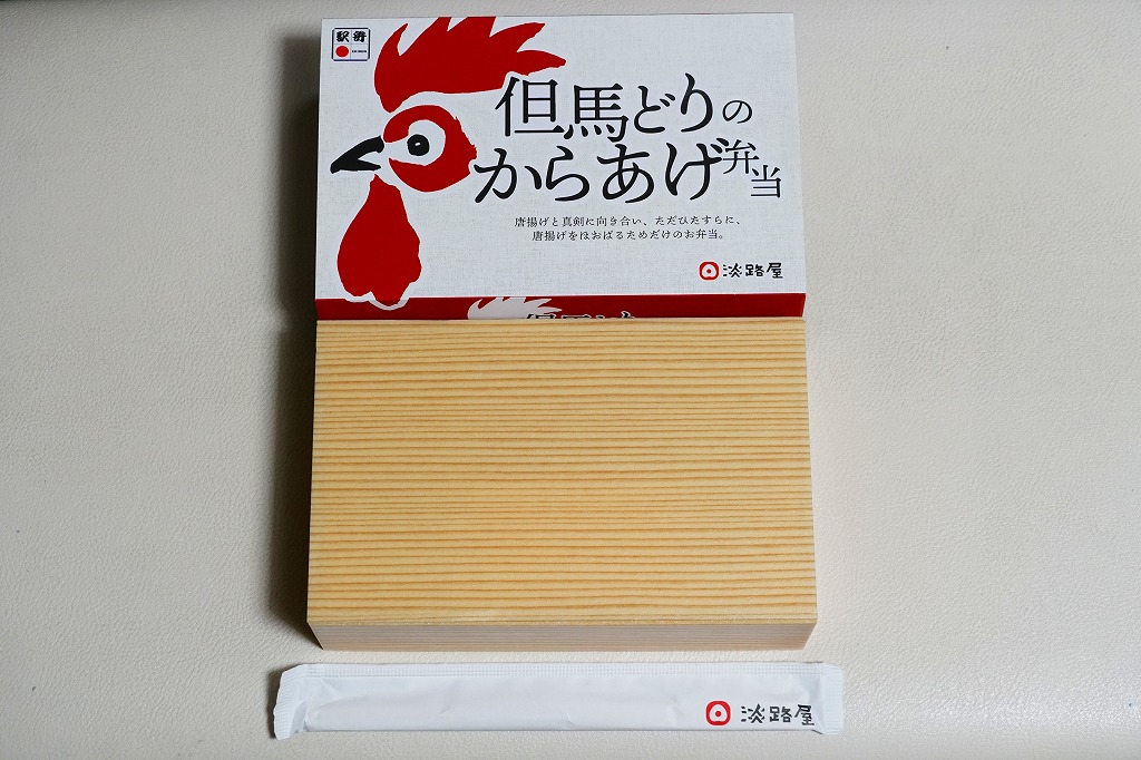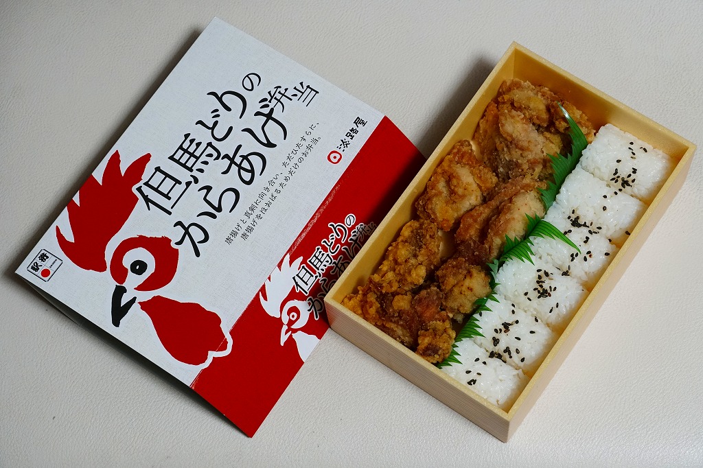 2020(令和2)年の8月に発売。従前の「からあげべんとう」のリニューアルか。ニワトリの頭と足跡と赤色でデザインしたスリーブに収めた、長方形の容器に俵飯を並べ、但馬どりの兵庫県産鶏肉を特製濃厚漬けダレに浸したという鶏唐揚を詰められるだけ詰めて、長いバランで仕切る。「唐揚げと真剣に向き合い、ただひたすらに、唐揚げをほおばるためだけのお弁当。」を名乗るとおり、原材料名が白飯、鶏唐揚、ごまの3品だけで済んでいる、漬物も醤油も何も添付しない、まったく無駄もスキもない鶏唐揚弁当。神戸あるいは京阪神では駅弁売店で様々な駅弁を選べるので、そんな中での唐揚弁当であればこんなシンプルな内容があってよい。価格は2020年の発売時で950円、2023年時点で980円、2024年時点で1,200円、2025年時点で1,250円。