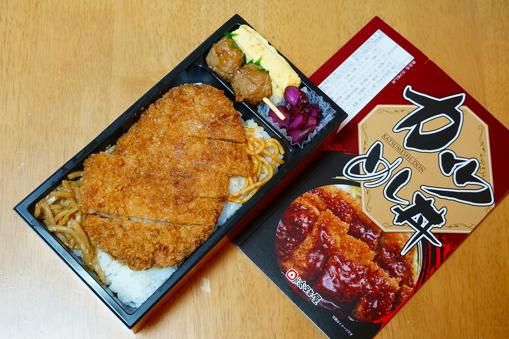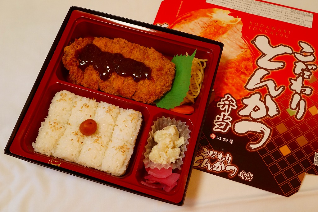 この名前と内容では2014(平成26)年のみの販売か。日の丸俵飯にトンカツ1枚、スパゲティ、ポテトサラダ、ニンジン煮、大根漬物という、見事に典型的なとんかつ弁当。このデパ地下商品を駅で売るかは分からないが、見た目は駅弁で、定評ある駅弁屋の味なので、常温で締まる。