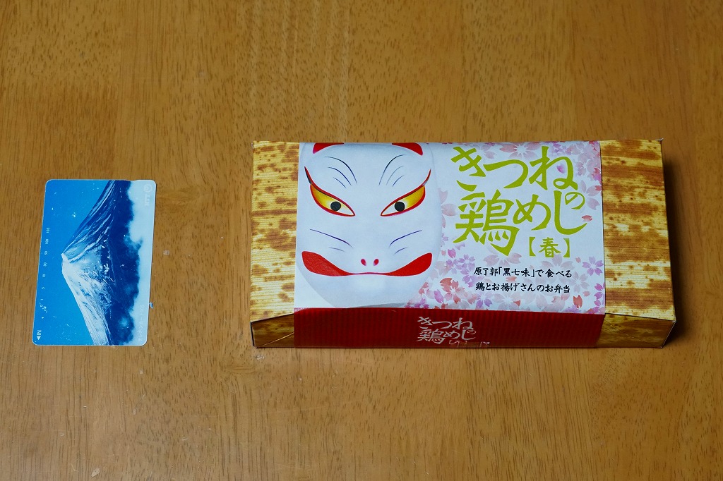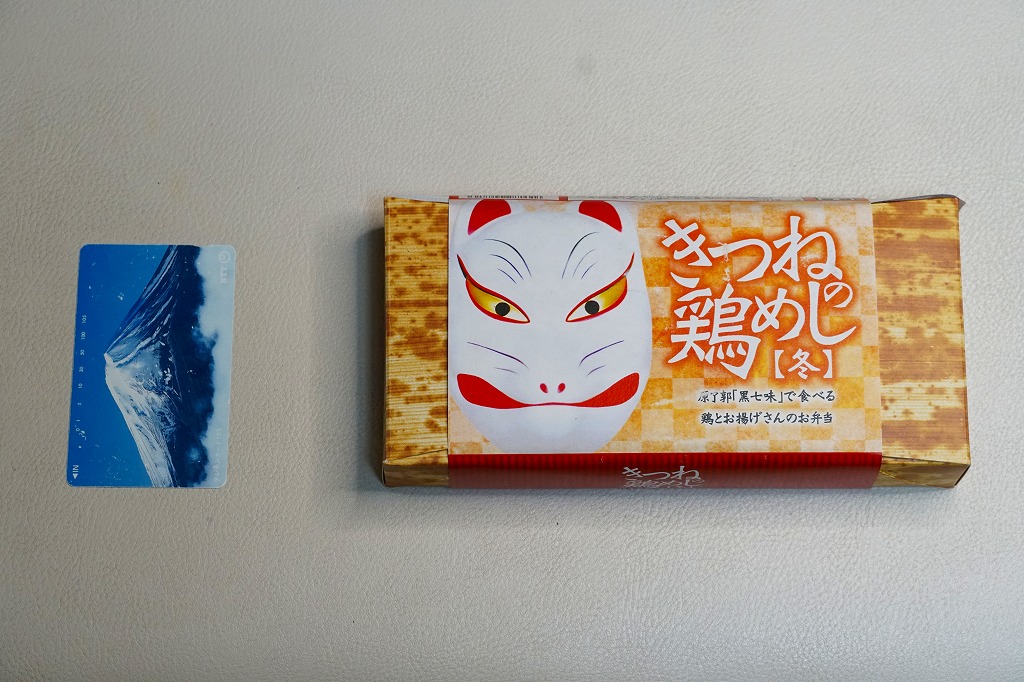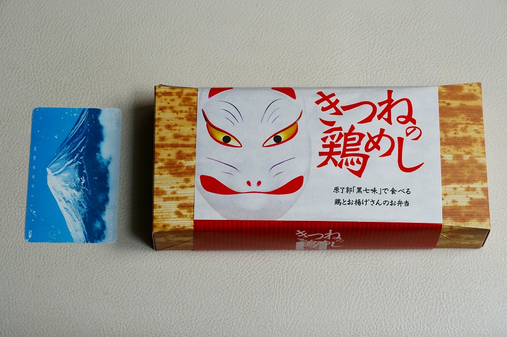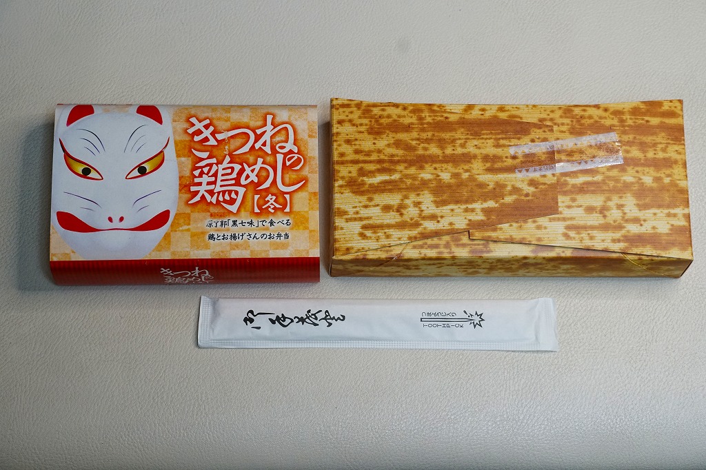 上記の駅弁「きつねの鶏めし」の、2017(平成29)年時点での姿。上記の2025年のものと比べて、掛紙での記載事項が増えた以外、変わらない。当時は通年で同じものが売られた。
