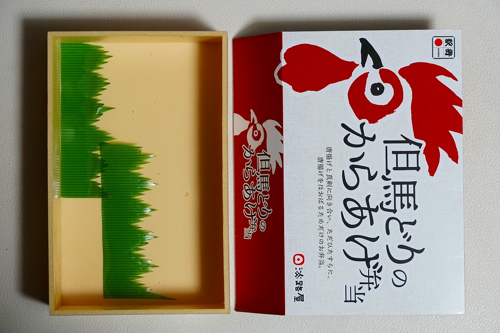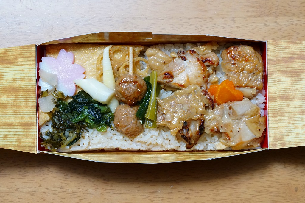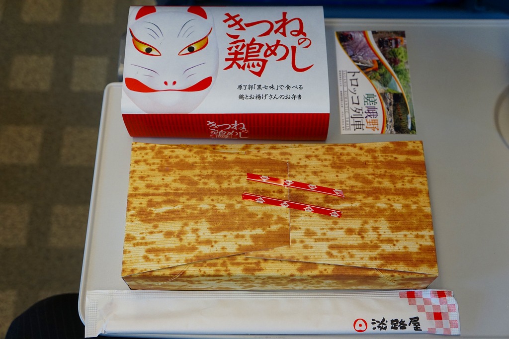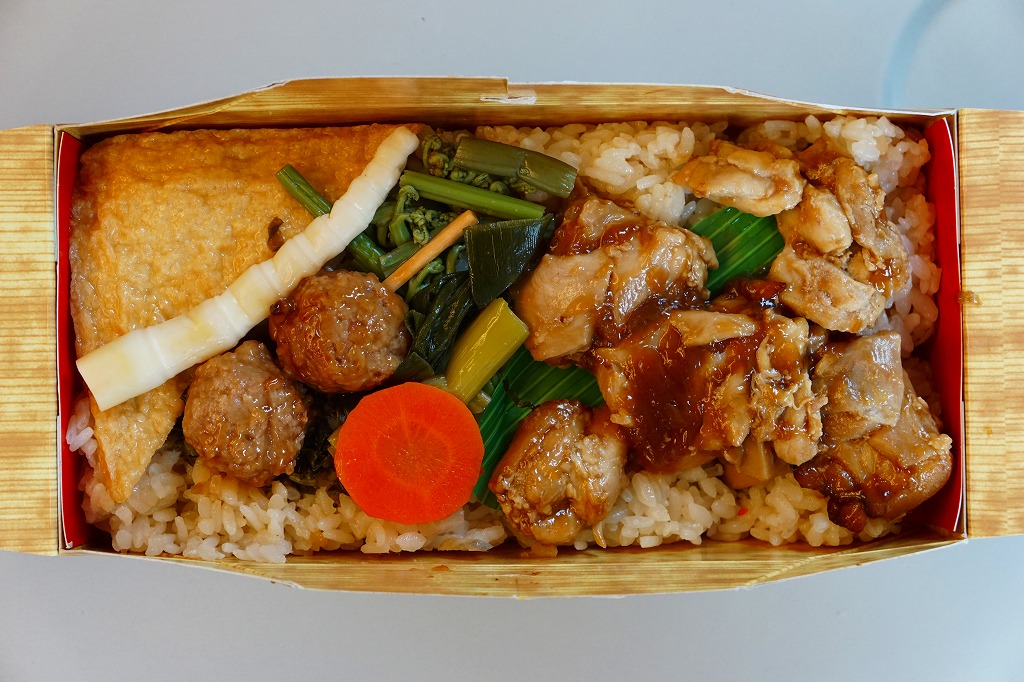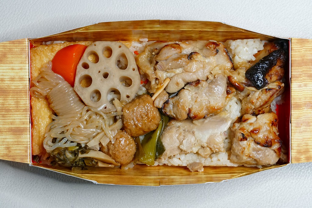 2016(平成28)年7月2日の発売。調製元と嵯峨野トロッコ列車とのコラボで京都をイメージした駅弁とのことで、神戸エリアに加えて嵯峨野観光鉄道トロッコ嵯峨駅でも売り出したそうな。竹皮柄のボール紙箱に油揚げの炊込飯を詰め、鶏照焼、油揚げ、鶏つくね、わらび、姫竹、すぐき、ネギ、ニンジンを散らし、原了郭の黒七味を添付する。観光列車の旅を彩るというよりもむしろ、飾らなくとも旅の飯になりうる新幹線駅向け鶏飯駅弁ではないかと思った。