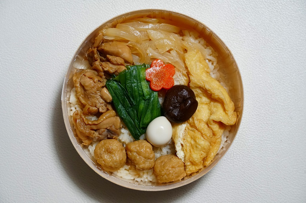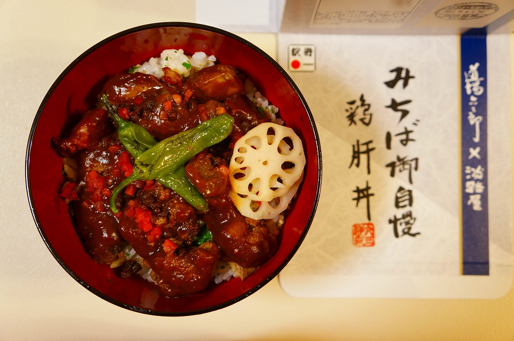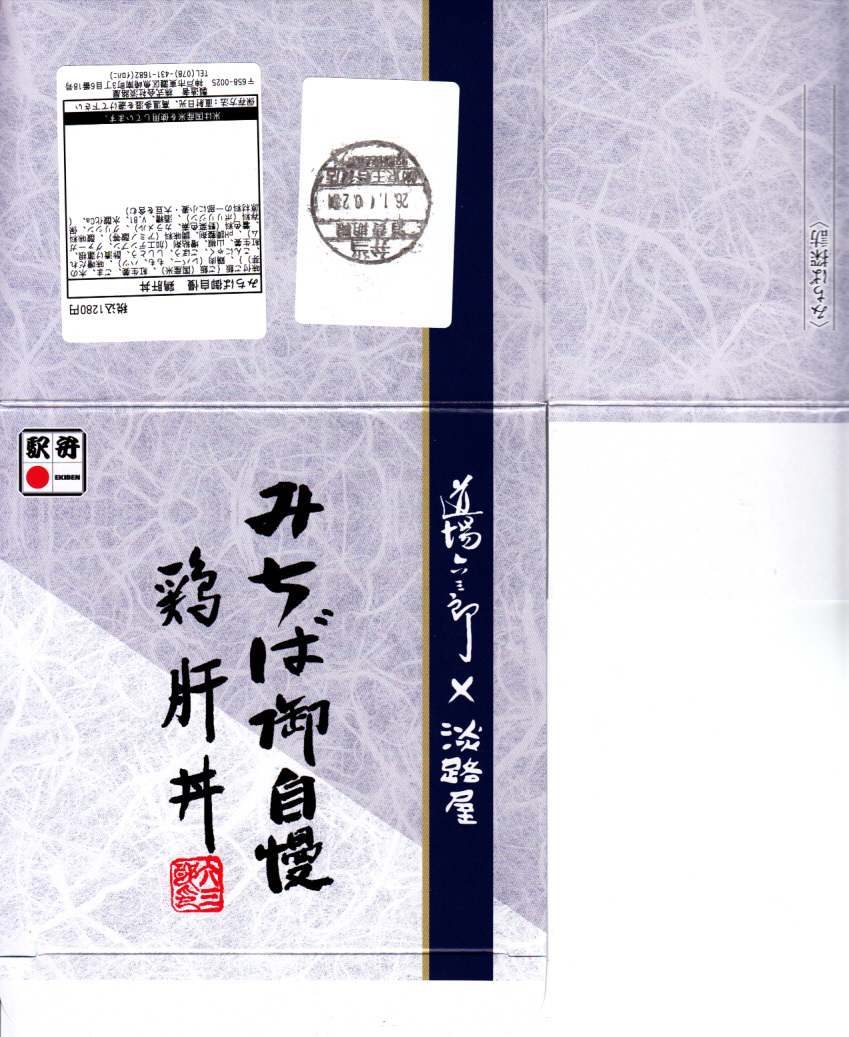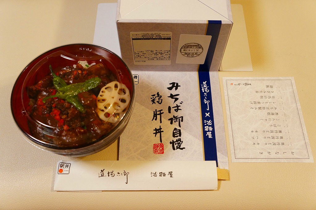 2016(平成28)年7月2日の発売。調製元と嵯峨野トロッコ列車とのコラボで京都をイメージした駅弁とのことで、神戸エリアに加えて嵯峨野観光鉄道トロッコ嵯峨駅でも売り出したそうな。竹皮柄のボール紙箱に油揚げの炊込飯を詰め、鶏照焼、油揚げ、鶏つくね、わらび、姫竹、すぐき、ネギ、ニンジンを散らし、原了郭の黒七味を添付する。観光列車の旅を彩るというよりもむしろ、飾らなくとも旅の飯になりうる新幹線駅向け鶏飯駅弁ではないかと思った。