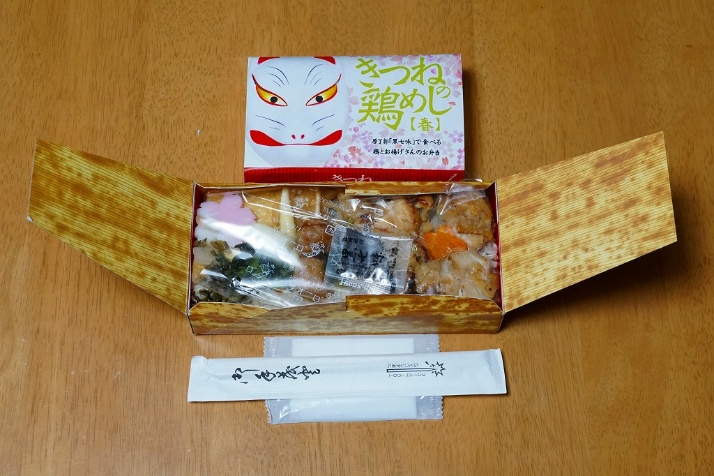 2021(令和3)年の2月に発売。人気の新神戸駅弁「きつねの鶏めし」について、2020(令和2)年9月に初めて季節の商品「秋」を発売、12月に「冬」になり、年が明けて春が来た。竹皮柄のボール紙製容器にキツネ顔の掛紙を巻くのは、従前の「きつねの鶏めし」と同じ。掛紙の背景に桜の花びらが散る。