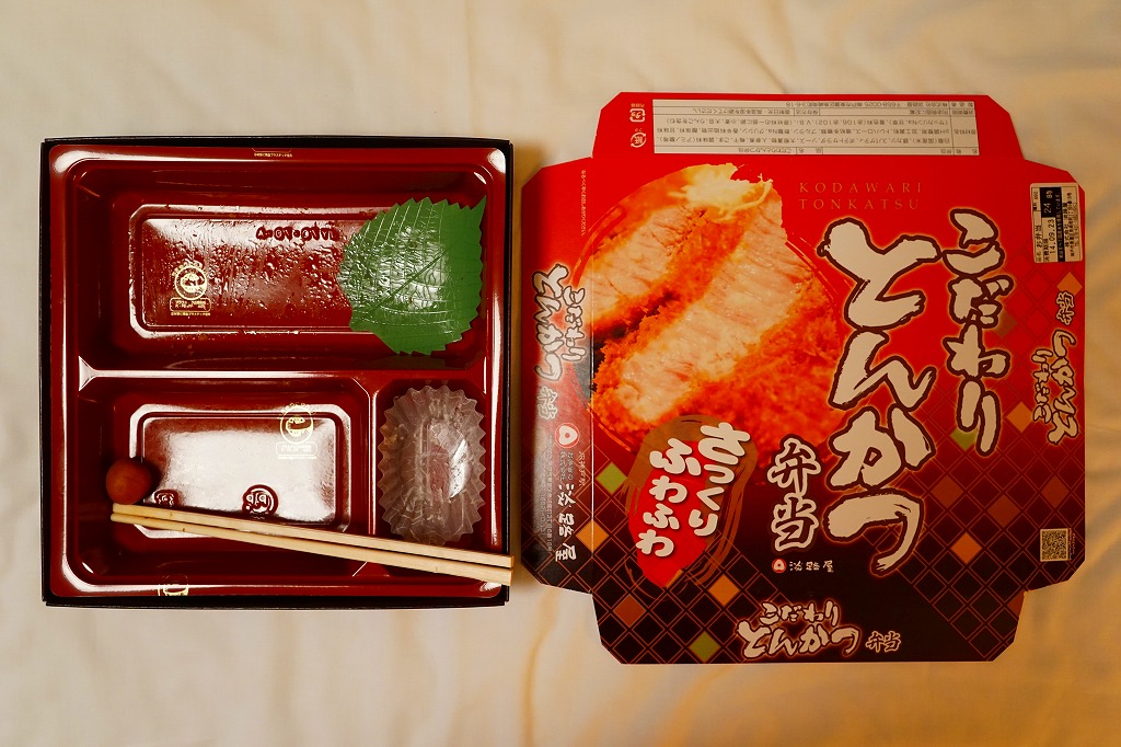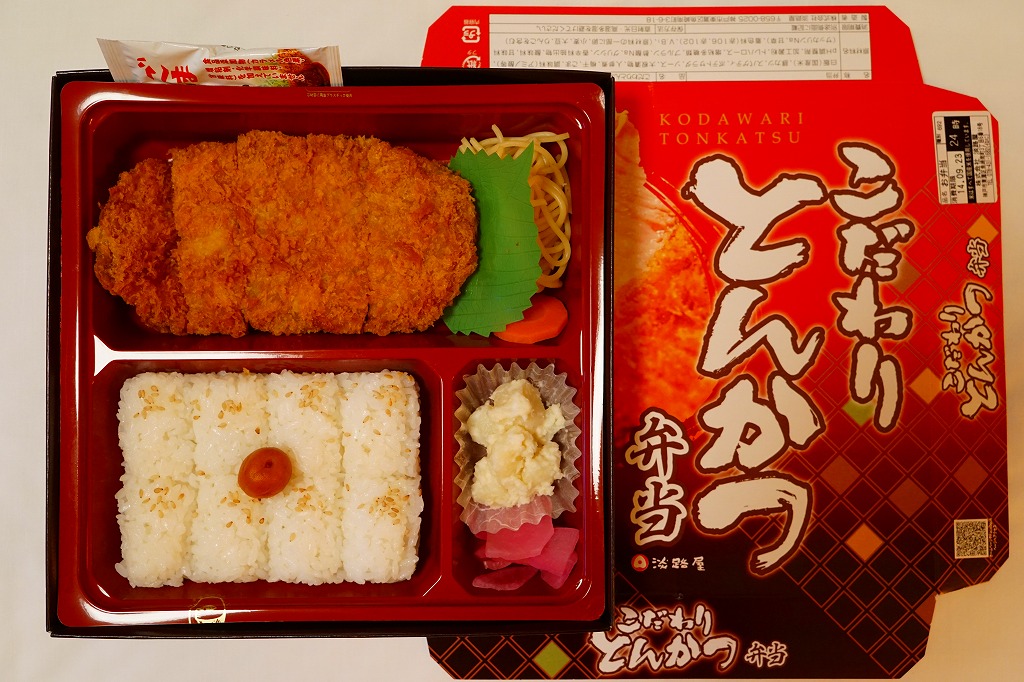 2018(平成30)年の発売か。ふたが透明な長方形のプラ容器に、白飯を詰め、薄くて平たいトンカツで覆い、きんぴらとスパゲティも載せ、玉子焼と鶏つくね串と柴漬けを添える。シンプルで、ガツガツ食べ進む内容。神戸に限らず、あるいは神戸の駅弁売店でなく、関西エリアで手広く売られる商品である模様。価格は2018年時点で650円、2020年の購入時で750円、2022年時点で780円。2023年頃までの販売か。