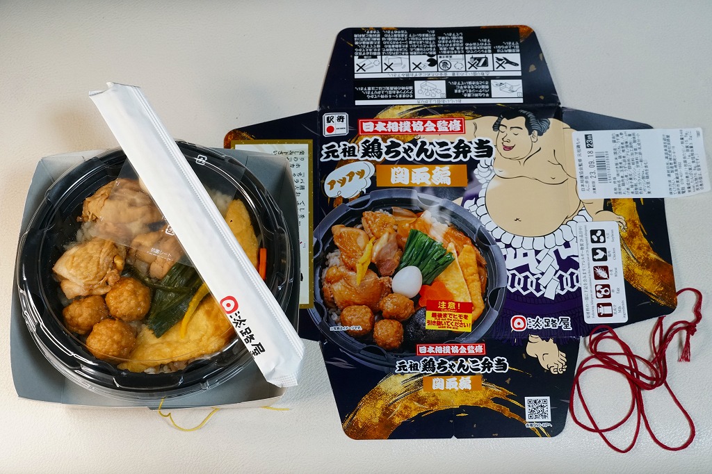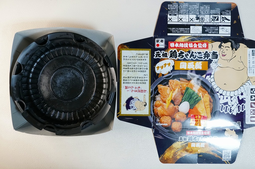 丸くて黒い加熱機能付き容器を収める紙箱には、力士の絵柄と中身の写真を大きく掲載。この容器に味付き飯を詰め、鶏肉、鶏つくね、お揚げ、タマネギ、うずら卵、にら、しいたけ、ニンジンなどを並べて覆う。鶏鍋のような、そうでないような。