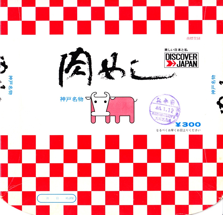 1973(昭和48)年1月12日の調製と思われる、昔の神戸駅弁の紙箱。デザインは上記のものと変わらないが、記載事項がシンプルだったようにみえる。