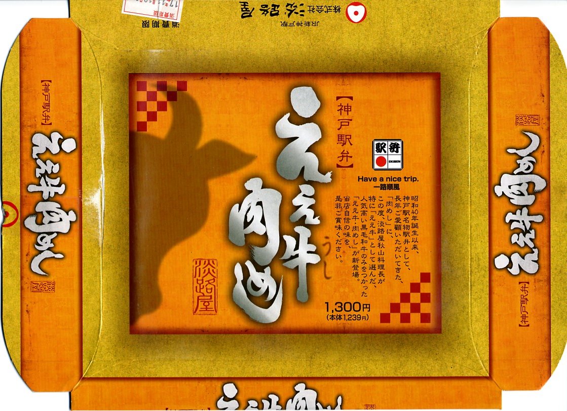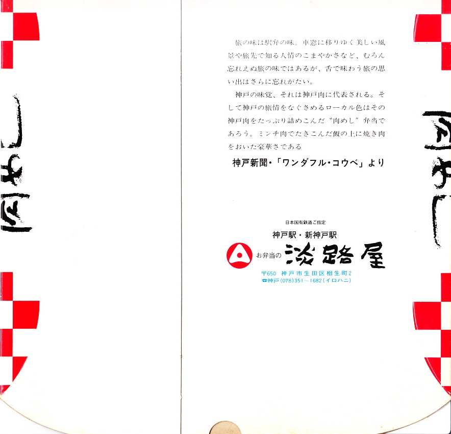 入手状況から1993(平成5)年1月28日11時の調製と思われる、昔の新神戸駅弁の掛紙の一部。絵柄は21世紀に現存するものと変わらない。宣伝文の内容は、2002年当時のものと変わらない。