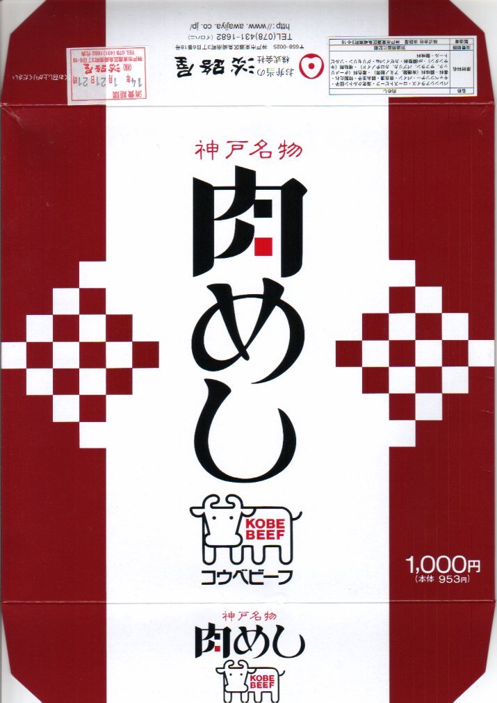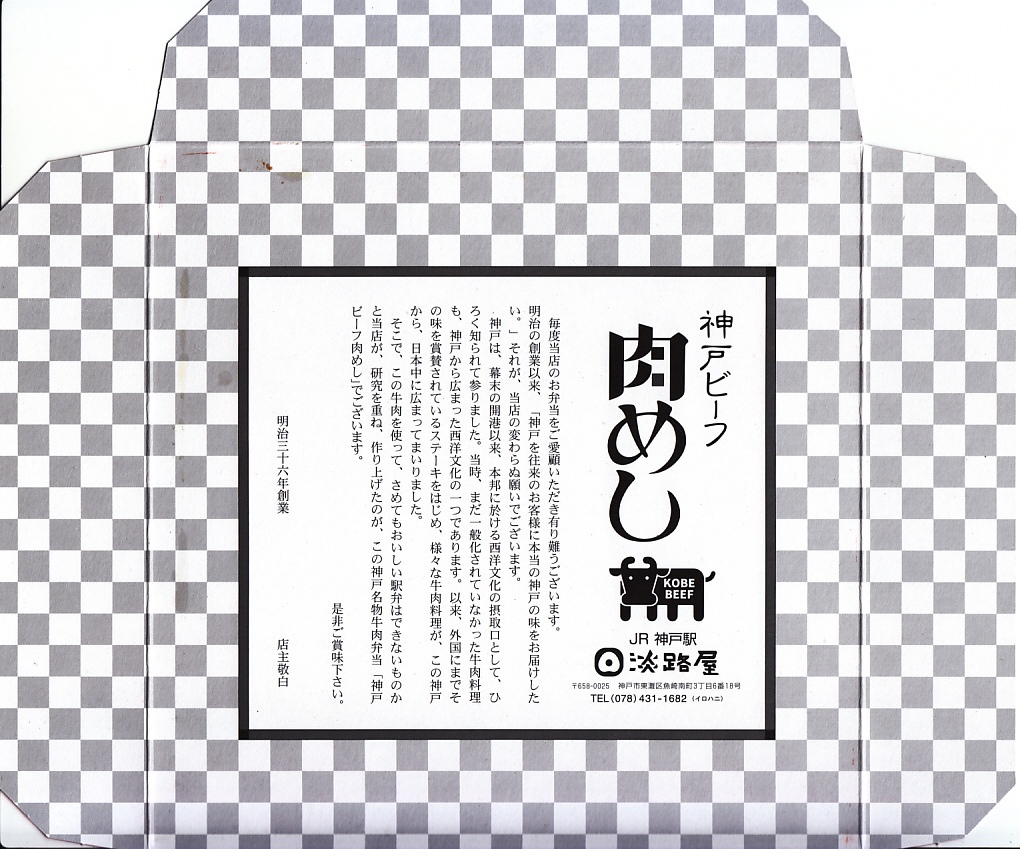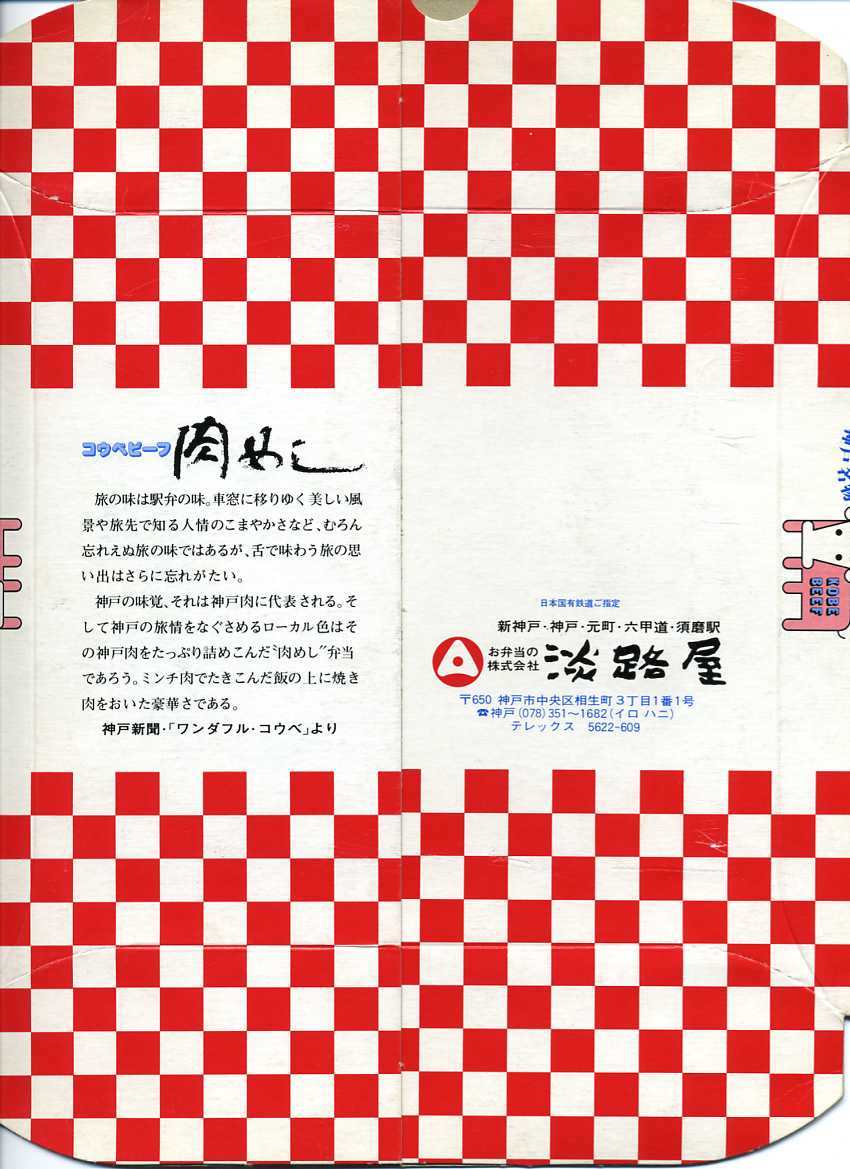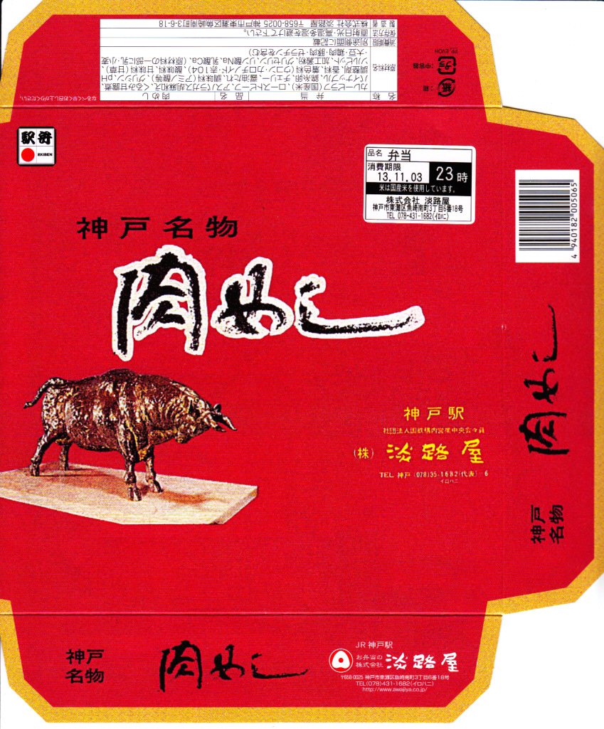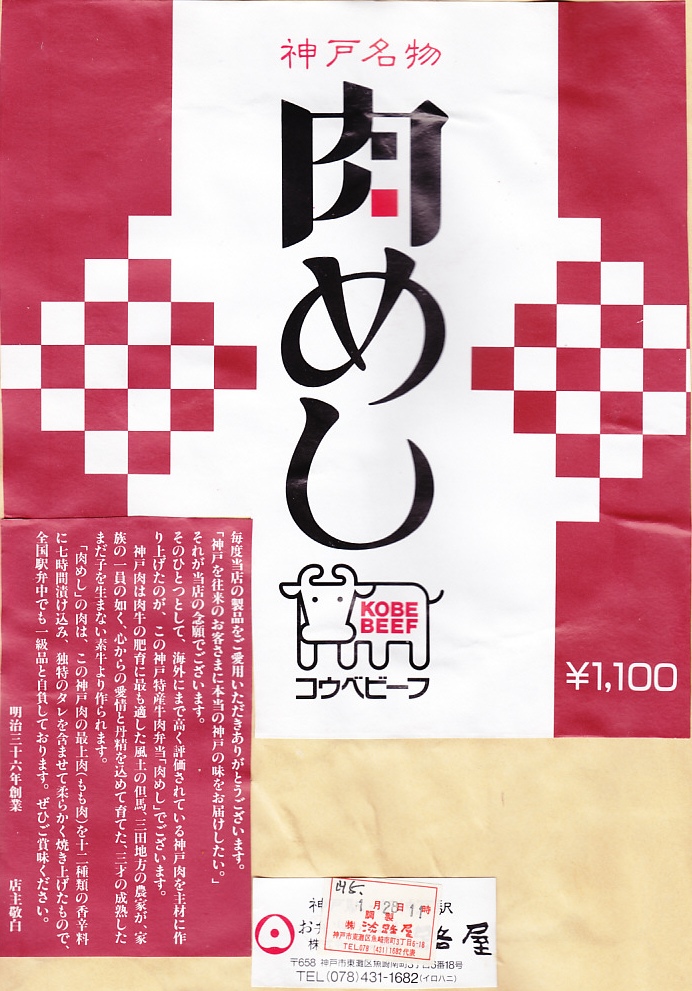 神戸の名物駅弁の、パッケージの復刻版。1965(昭和40)年当時のカラーコピーなのだろう、神戸市の調製元の市内局番がまだ2桁である。山陽新幹線も新神戸駅も、その頃はまだ存在していない。中身と価格は、2013年当時で現行のものと同じ。