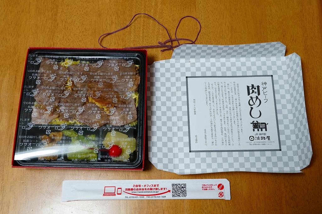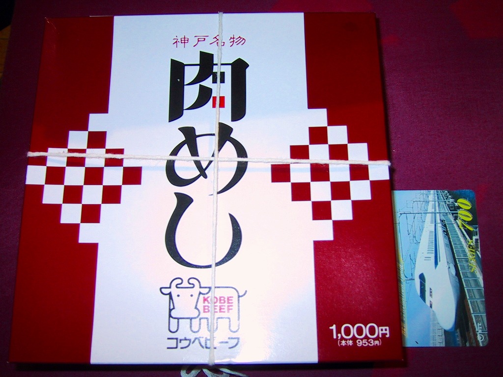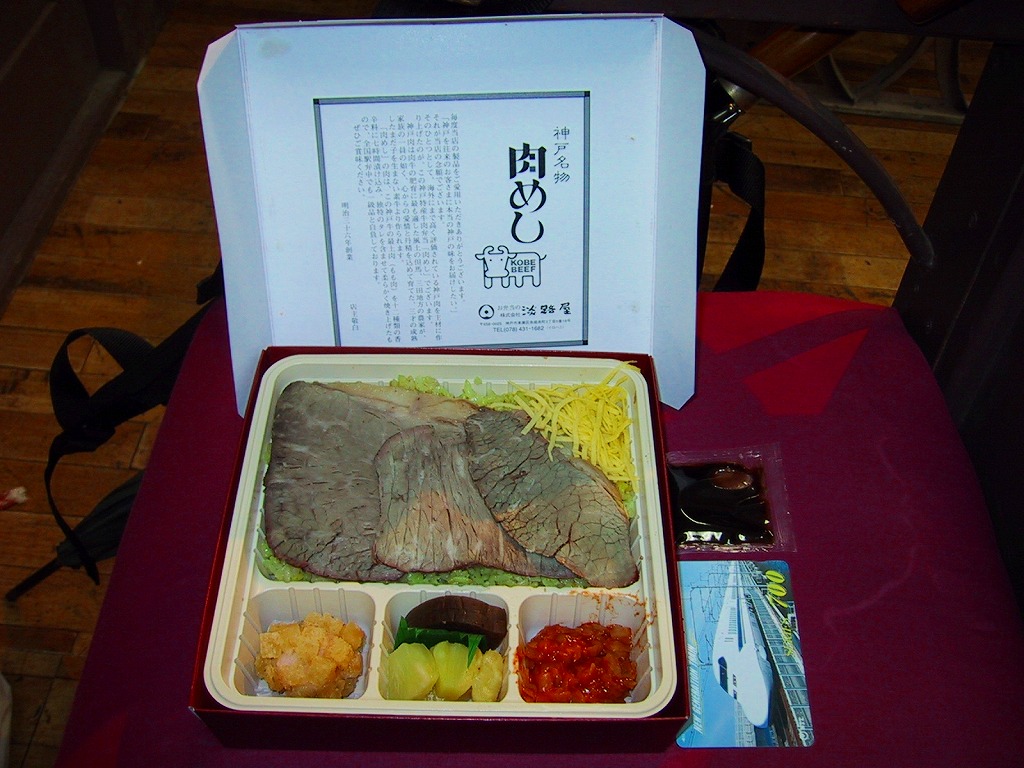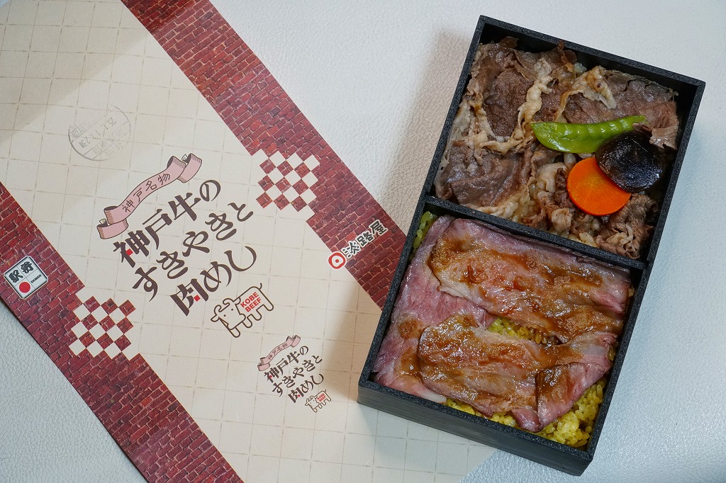 2021(令和3)年1月の発売。神戸の名物駅弁「肉めし」の、牛肉を神戸ビーフにした高級版。それでは通常版と見分けが付かないためか、中身を収めるプラ製トレーの色を白から黒に変え、ふたの表面と裏面の市松模様を広くとり、駅弁の名前のところの「神戸名物」を「神戸ビーフ」に変えている。そんな姿と味はむしろ、リニューアル前の通常版「肉めし」に似ている。薄く平たく広いローストビーフは、赤身とスパイスの味わい。1年間ちょっとの販売か。