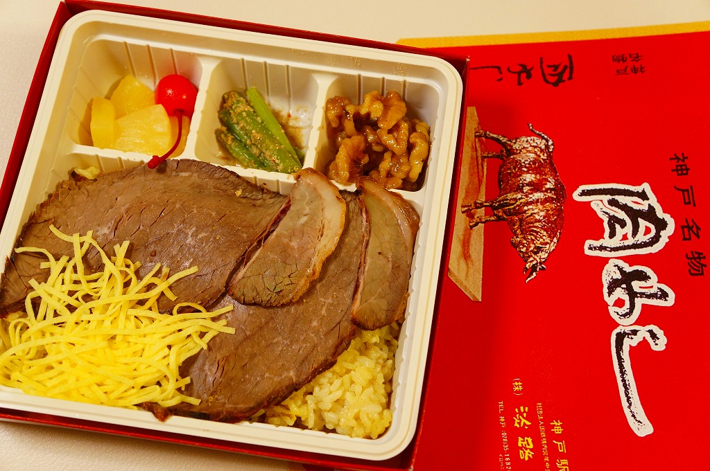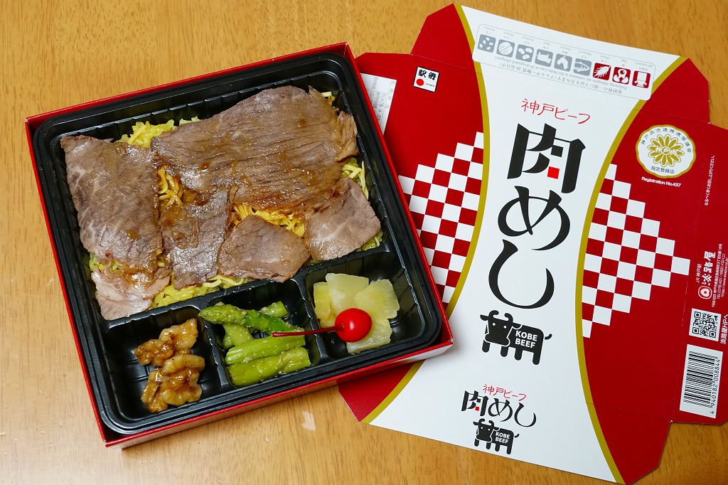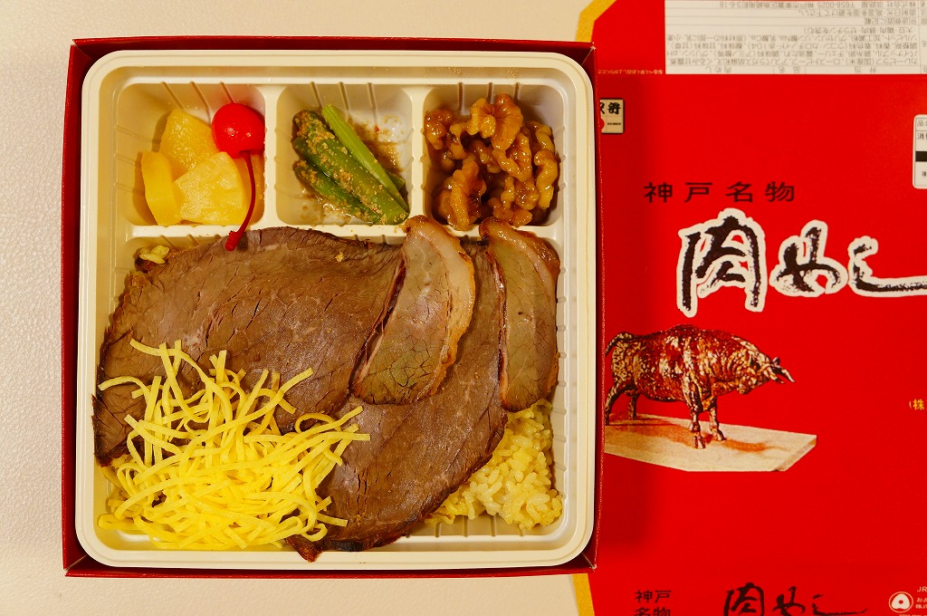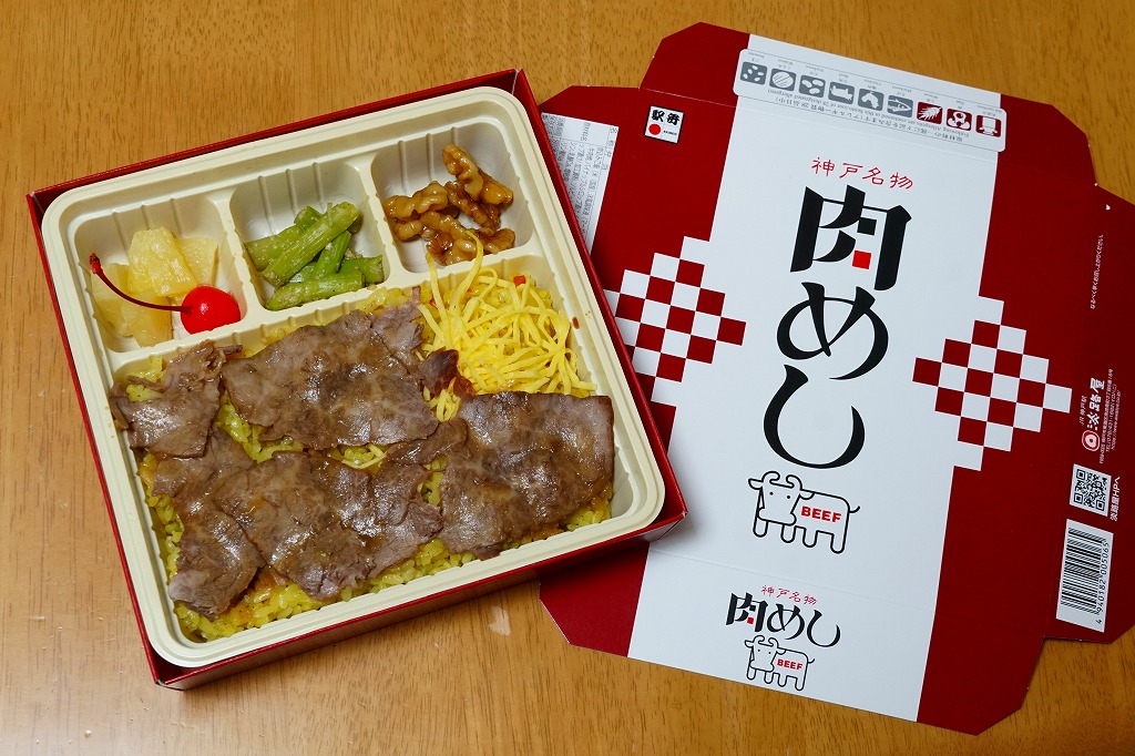 1965(昭和40)年10月14日の鉄道記念日に神戸駅で発売。2021(令和3)年1月1日にリニューアル。「牛めし」でなく「肉めし」。牛もも肉を特製のタレに漬け込んだ後に、焼いてスライスしたローストビーフで、カレー風味の黄色いバレンシアライスを覆い、錦糸卵、くるみ甘煮、アスパラガスのごま和え、パインとさくらんぼを添える。霜降り黒毛和牛の薄造りが、口の中で香る。発売当時にその名をとどろかせ、今も類例を見ない、上質のローストビーフ丼。価格は2021年の購入時で1,100円、2022年3月から1,200円、2023年時点で1,250円、2024年時点で1,350円、2025年時点で1,380円。