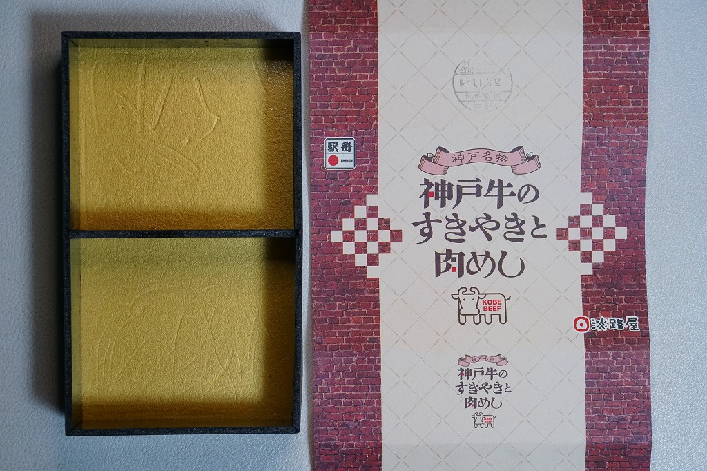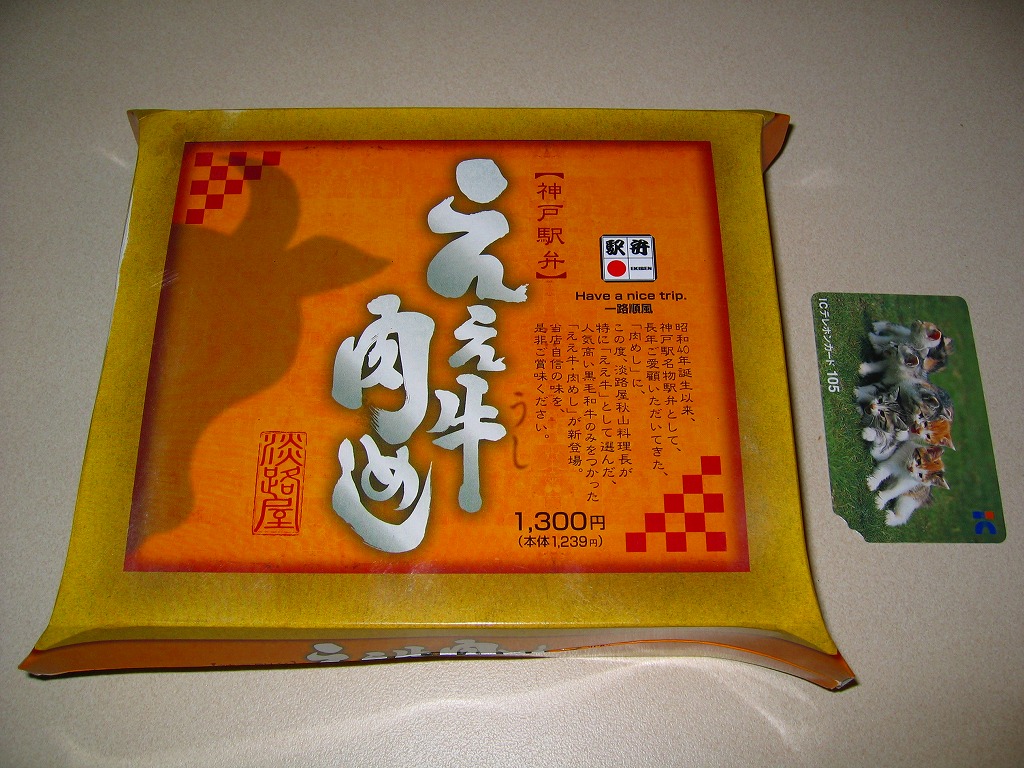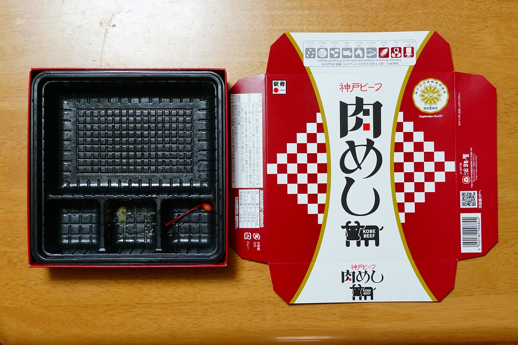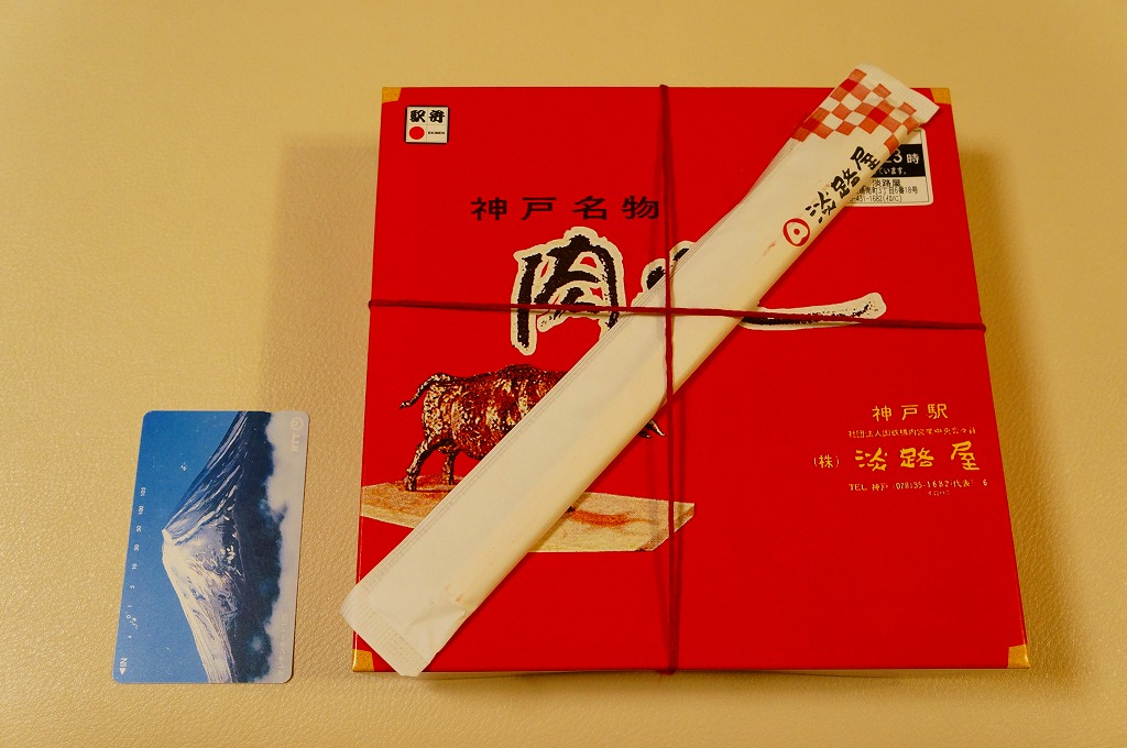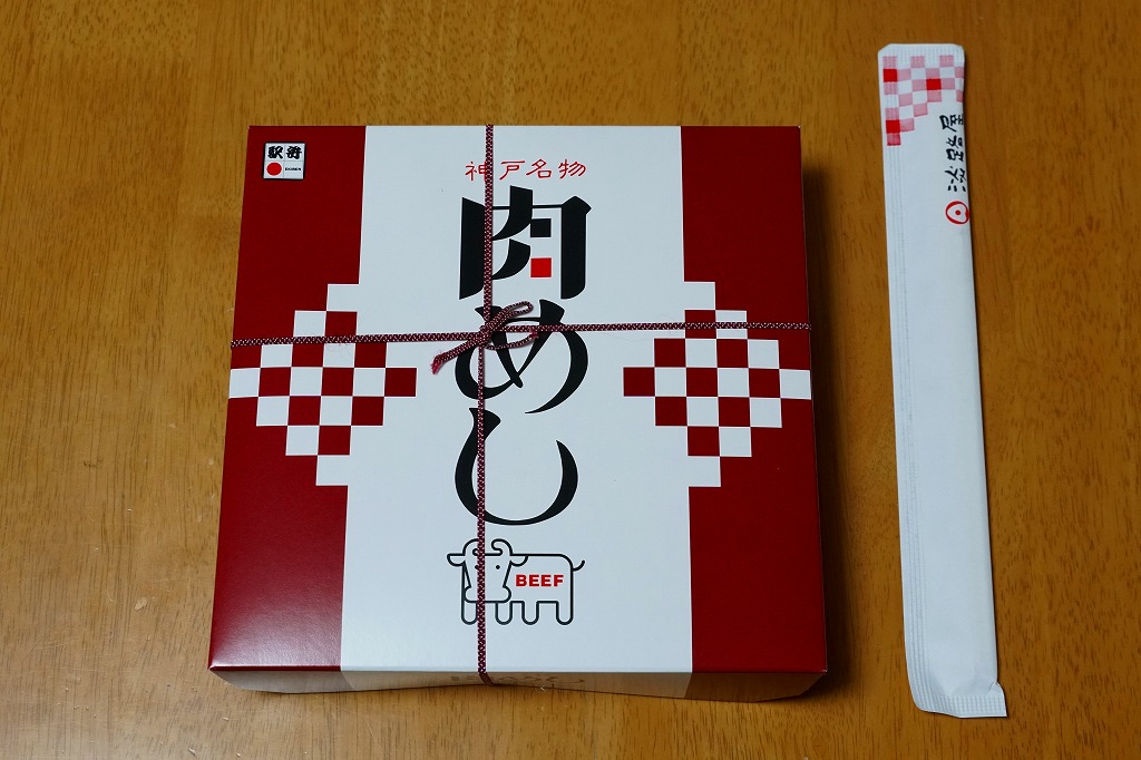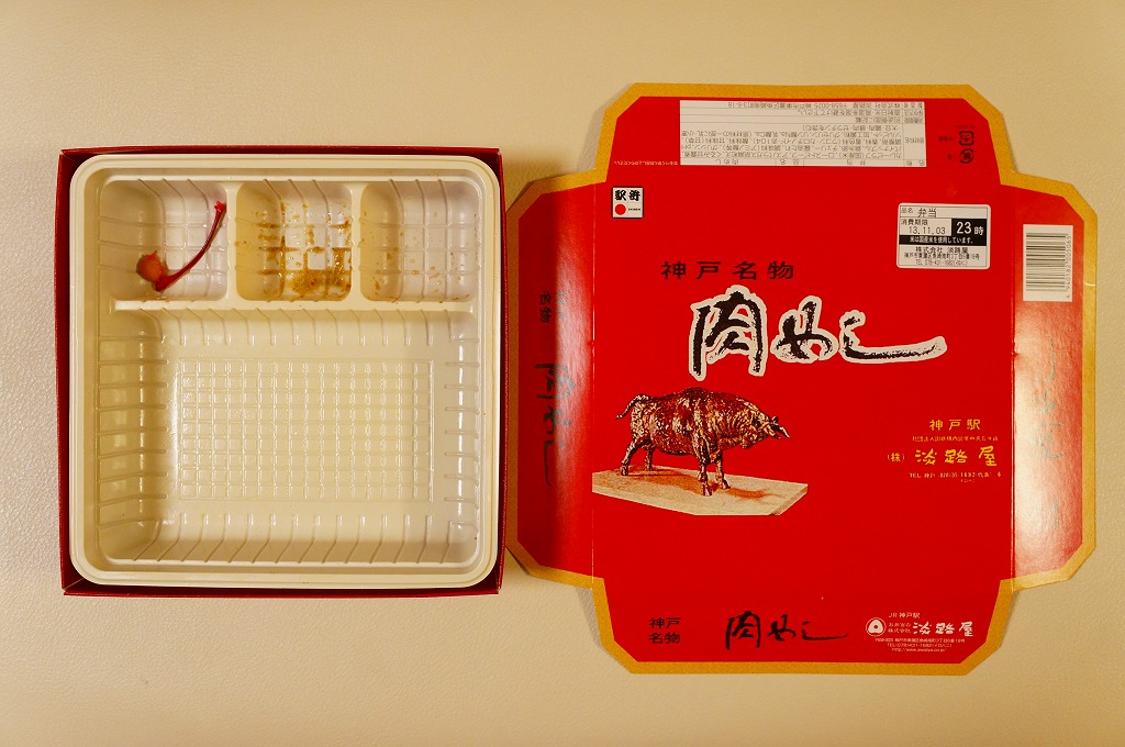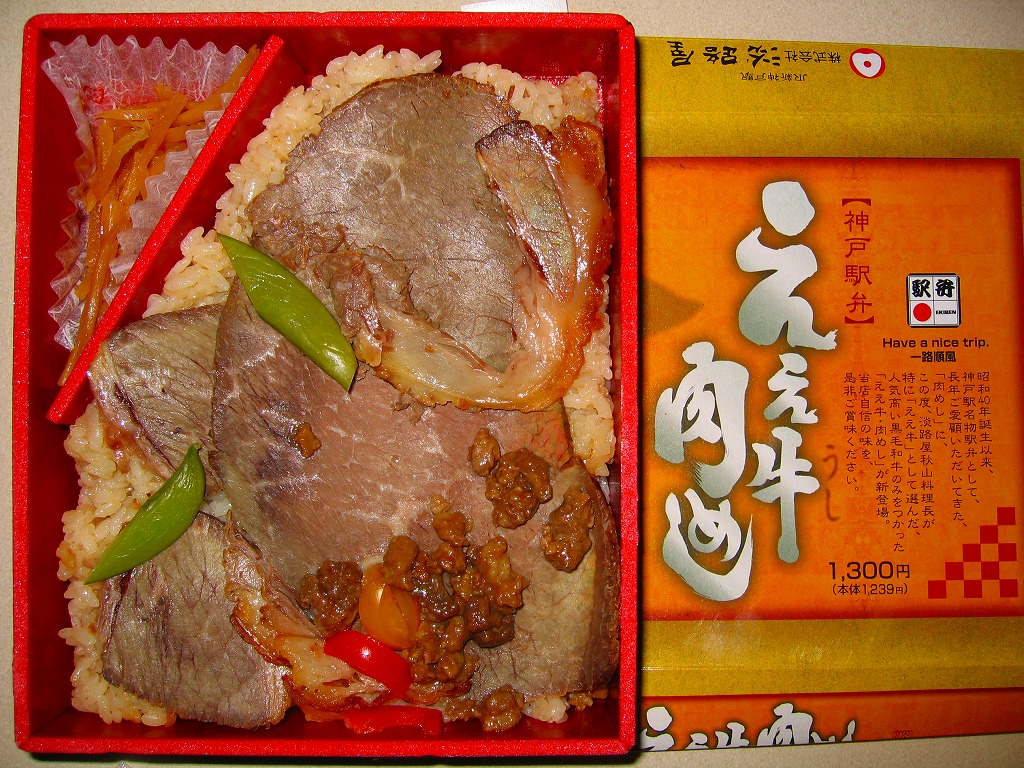 有名な神戸駅弁「肉めし」の上等版で、商品名は「ええ牛・肉めし」と区切って読む。無印な肉めし自体が肉も風味もええものなので、何度も食べるか並べて消費しないと品質差を感じにくいような。今回添付のつぶ塩とコショウをかけると、ぐっと味が締まる。