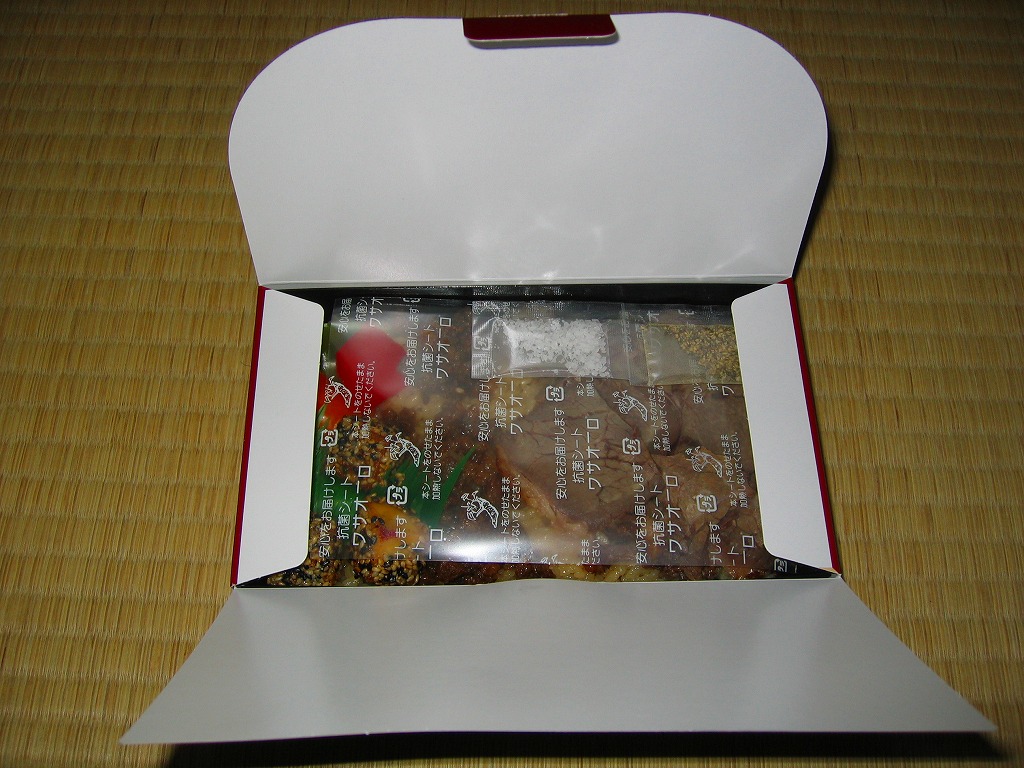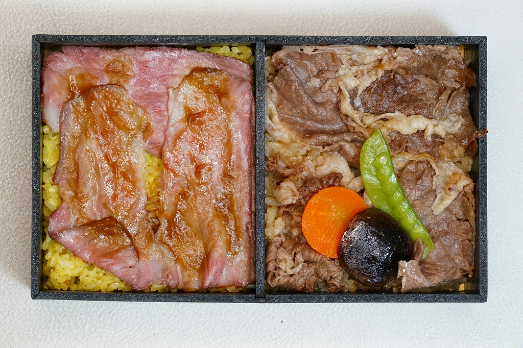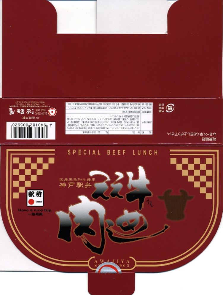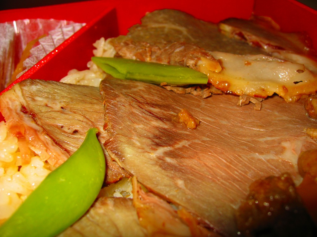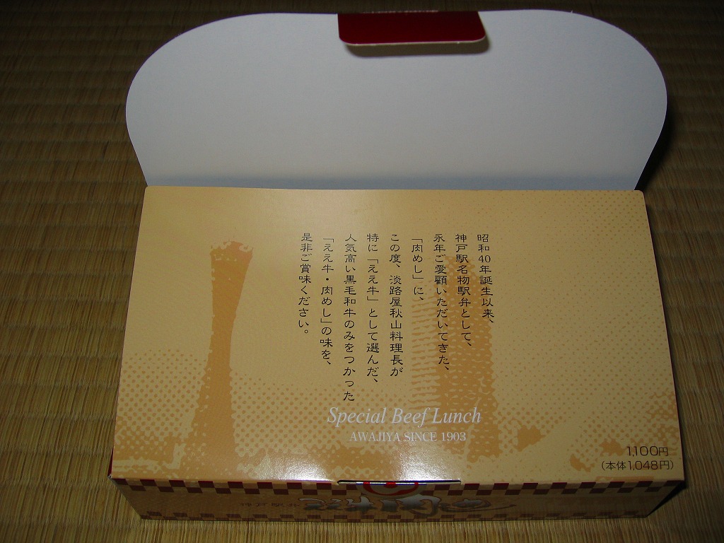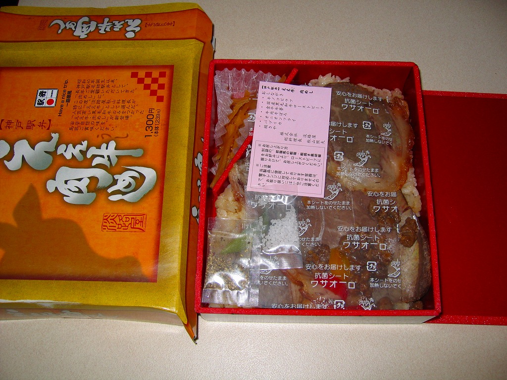 2005(平成17)年の新作か。真っ黒で中身は赤い容器を、駅弁の名前と売り文句を描いたボール紙のパッケージに入れる。中身はキノコピラフに淡路屋秋山総料理長が選んだ面積のある国産黒毛和牛ローストビーフが貼られ、きんぴらごぼうなどを添えるもの。