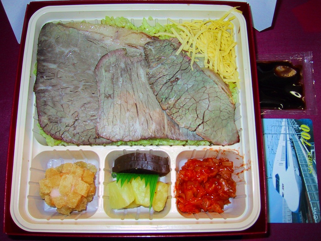 上記の駅弁「肉めし」の、2002(平成14)年時点の姿。2020年までこの姿。リニューアルしたとは思えないくらい、見た目の差異はほとんどない。当時は牛肉が広く薄いもので、見た目に乾燥していても噛み締めると味が湧いてくる赤身で、タレを別添していた。付合せも海老クルトン団子やキャベツソテーがあり、少し異なる。価格は2002年の購入時で1,000円、2014年4月の消費税率改定で1,030円。