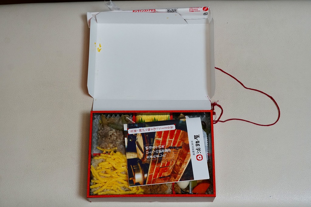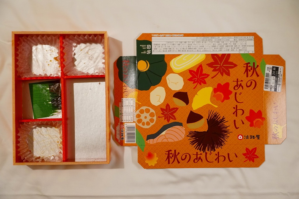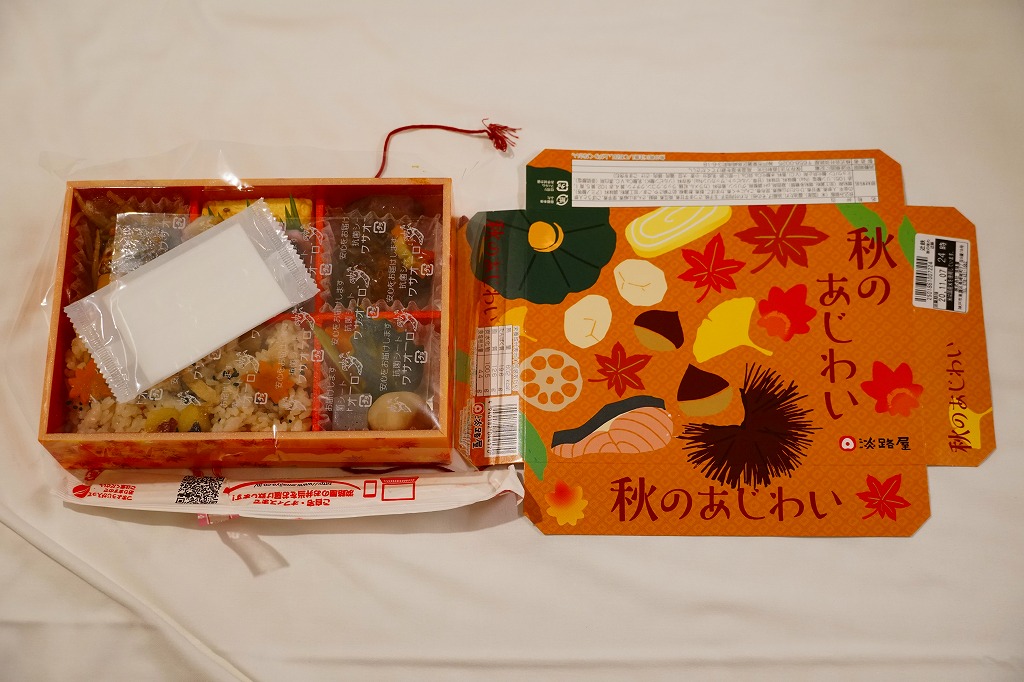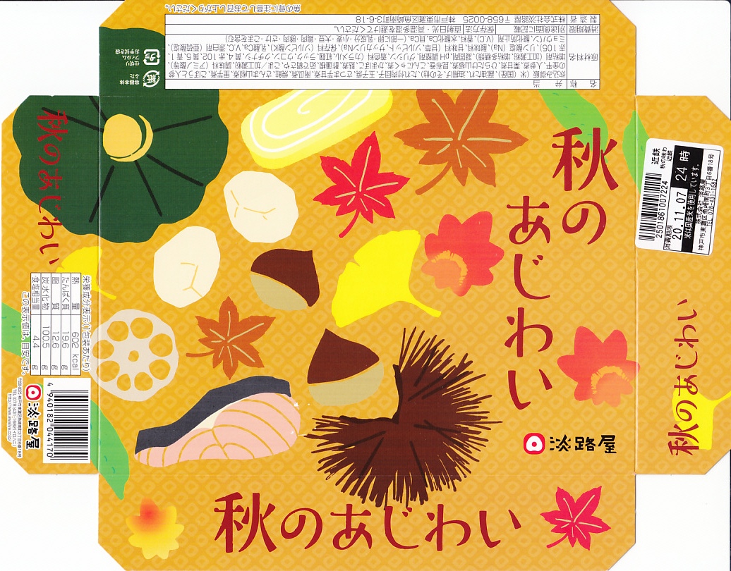 2014(平成26)年9月に「秋の味わい幕の内弁当」の名前で、京阪神エリアで発売か。おそらく9月から11月までの販売。中身は炊込飯にサツマイモ、煮物、肉団子、焼鮭と蒲鉾と玉子焼、サンマ山椒煮など。秋の色と味がコンパクトに詰まっていた。中身の見栄えもふたの絵柄も、秋らしい彩り。淡路屋には駅弁マークを付ける駅弁と、このそうでない弁当があり、しかし駅では両者を一緒に販売。何か区別があるのだろうか。価格は2014年時点で880円、2020年時点で900円、2022年秋には950円。