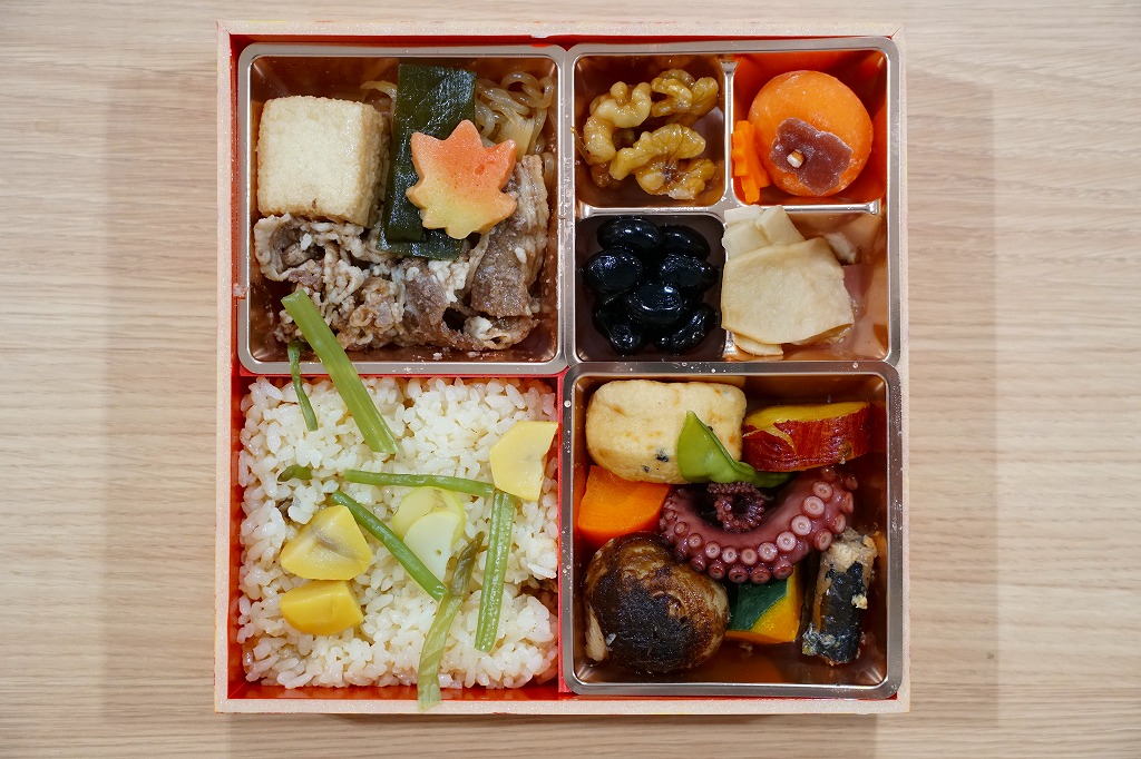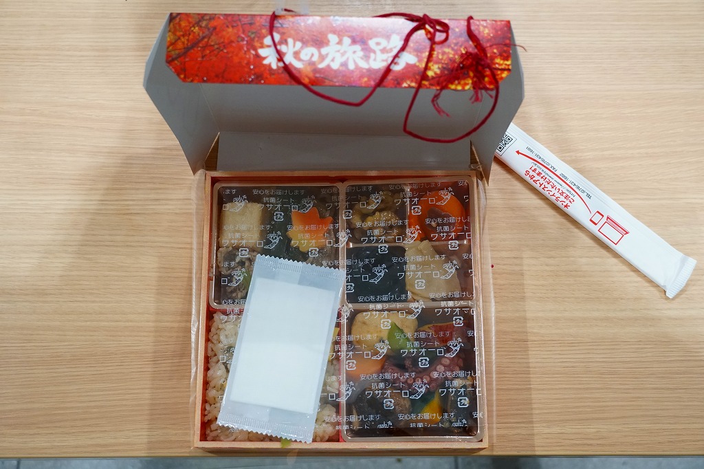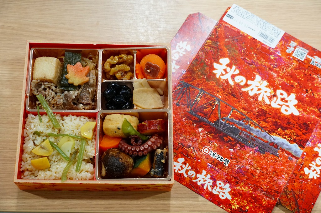 2019(令和元)年の9月に発売の秋駅弁か。ふたには紅葉の鉄橋を走る汽車を描いた。中身は松花堂弁当のような4区画に、山菜栗飯、牛すきやき、タコやサトイモやサツマイモなどの煮物、くるみと黒豆と和菓子と漬け物。1,300円もする高級な弁当には見えない、秋らしさをそこそこ含んだ、普段使いの駅弁か。2020年3月には春駅弁「春の旅路」も発売。