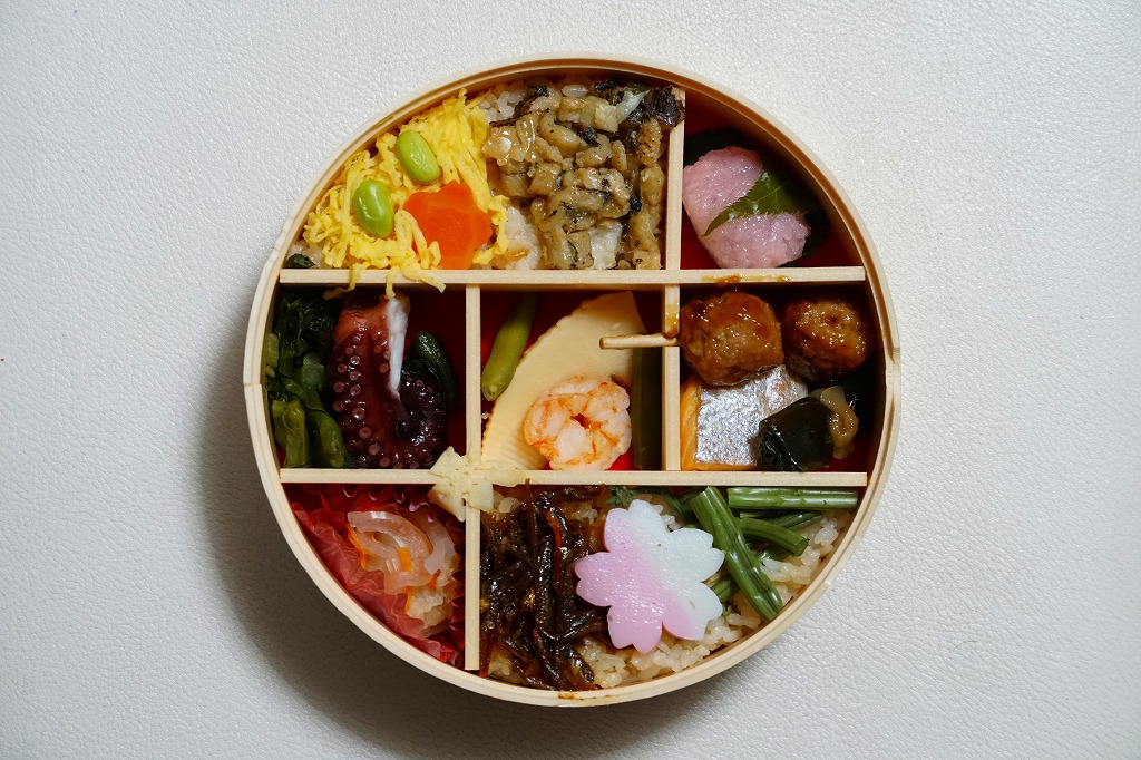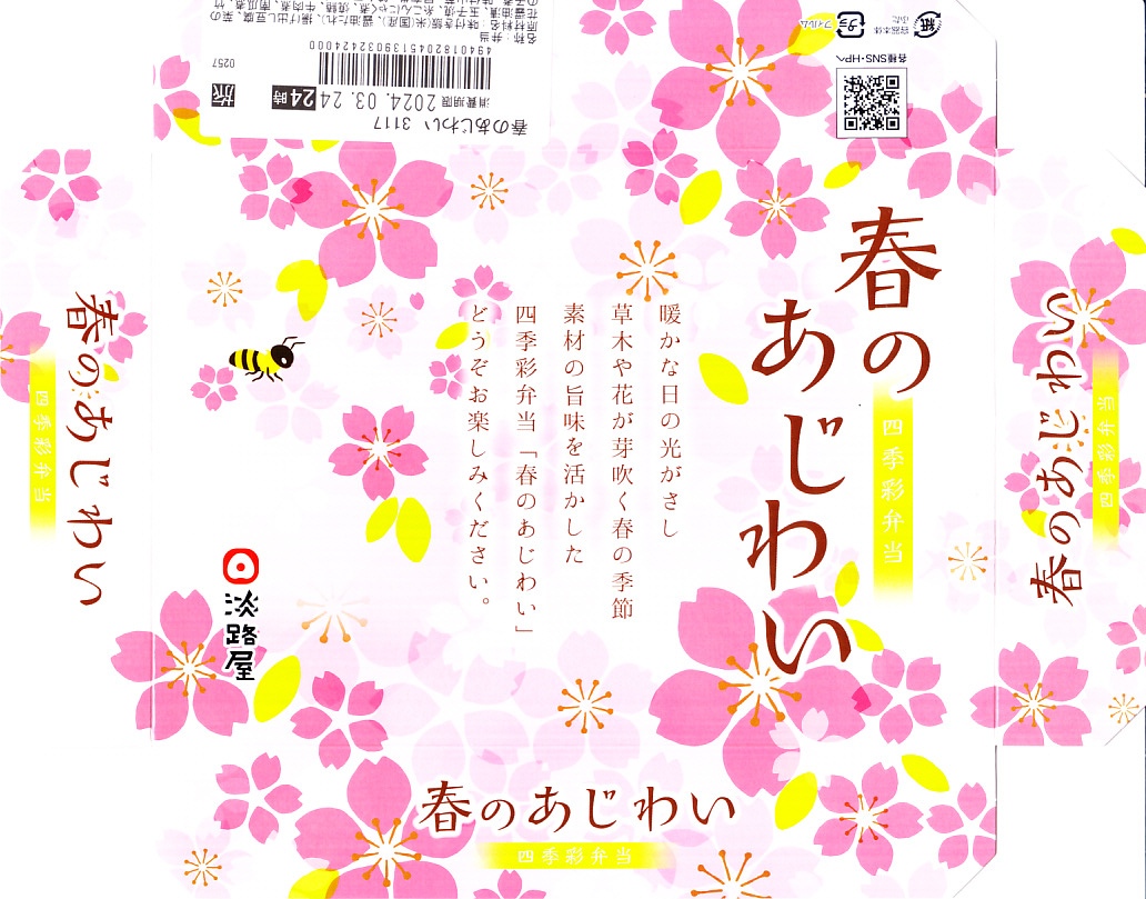 2015(平成27)年の春に発売か。中身は錦糸卵と山菜などで覆う茶飯、焼サバと玉子焼と花れんこんと昆布巻、牛肉煮、揚げ出し豆腐、菜の花とカボチャとタケノコなどの煮物。しっかりした中身に少しだけ、桜花のふたの絵柄でたっぷりと、春を感じさせている、機能的なお弁当。その前年の秋からの「秋のあじわい」や、冬からの「冬のあじわい」と同じく、京阪神エリアの直営店と駅弁売店で、手広く売られる。価格は2015年時点で880円、2020年時点で900円、2022年時点で950円、2024年時点で980円。