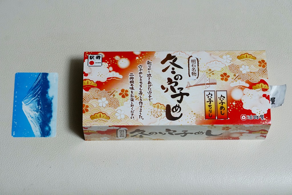 2020(令和2)年の9月頃に発売の「秋の穴子めし」、翌2021(令和3)年の3月頃に発売の「春の穴子めし」に続き、2022(令和4)年の12月頃に発売か。スリーブは橙色の暖房色をしており、アナゴのイラストを使う商品名や内容や明石海峡大橋を描く。中身は「穴子ちらし」と「穴子めし」ということで、四角い容器の一方でタレ御飯をアナゴの蒲焼きで覆い奈良漬を添え、他方で酢飯を煮アナゴとネギとうずら卵に人参と黒豆と甘酢生姜で覆う。御飯と御飯の内容で、かき込んで食べる食事に向く。12月から2月までの販売か。価格は2022年時点で1,200円、2024年時点で1,380円。