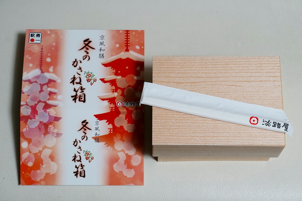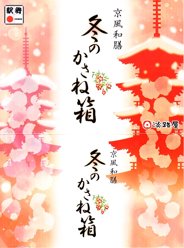 春と秋の「かさね箱」に追加して、2021(令和3)年からの冬に発売か。「京風和膳」の副題があるとおり、主に京都駅で輸送販売される駅弁、あるいは催事向けの商品かもしれない。小柄な長方形の容器をふたつ重ね、五重塔をシルエットにした赤いスリーブに収める。中身は下段が帆立と生姜を載せたご飯、上段がおかずで焼鮭、玉子焼、かまぼこ、野菜の炊き合わせ、黒豆煮、くるみ甘煮。華美でない姿に上質な食事を詰めた折箱のよう。価格は2022年時点で1,180円、2023年時点で1,380円、2024年時点で1,480円。