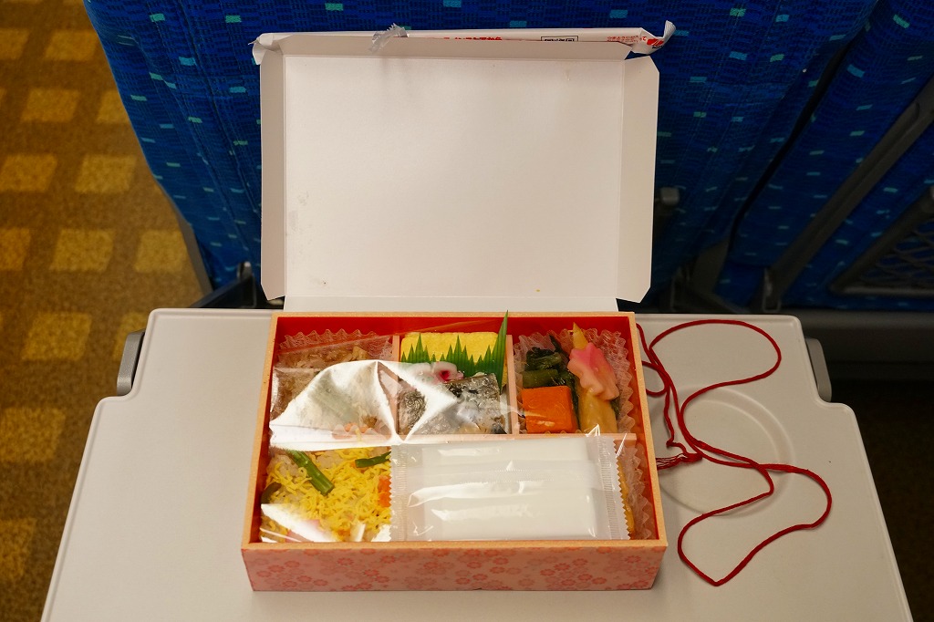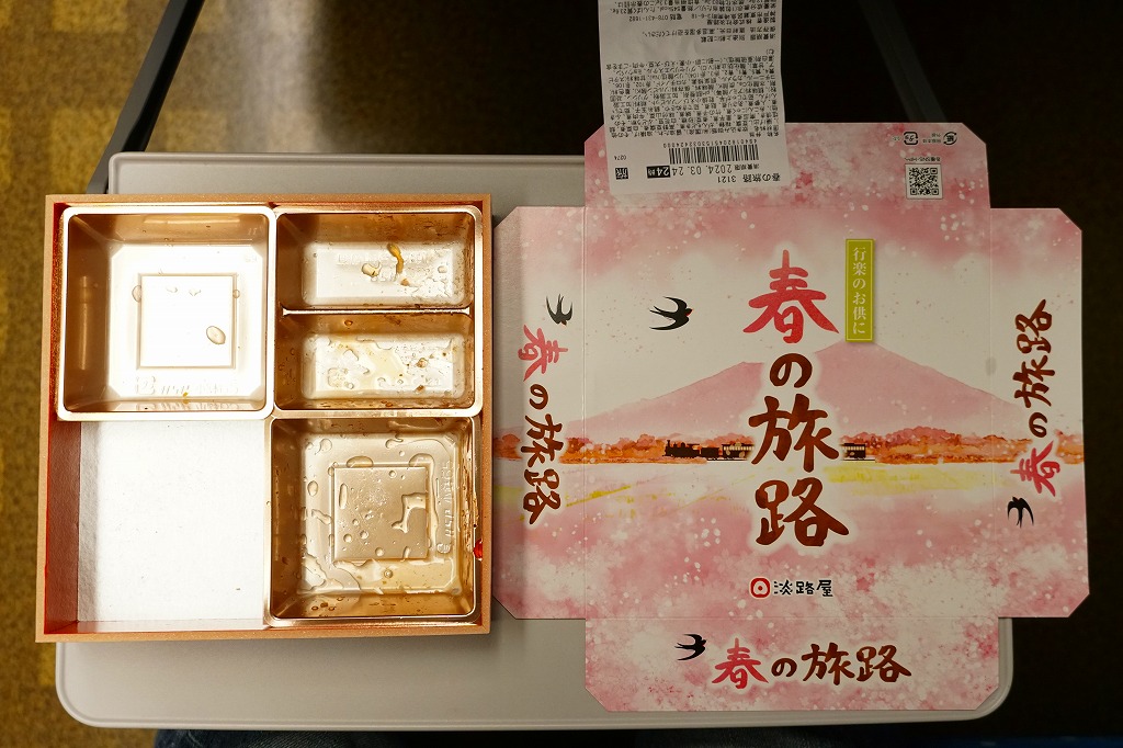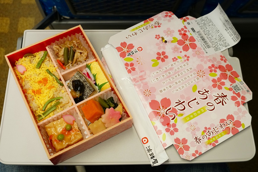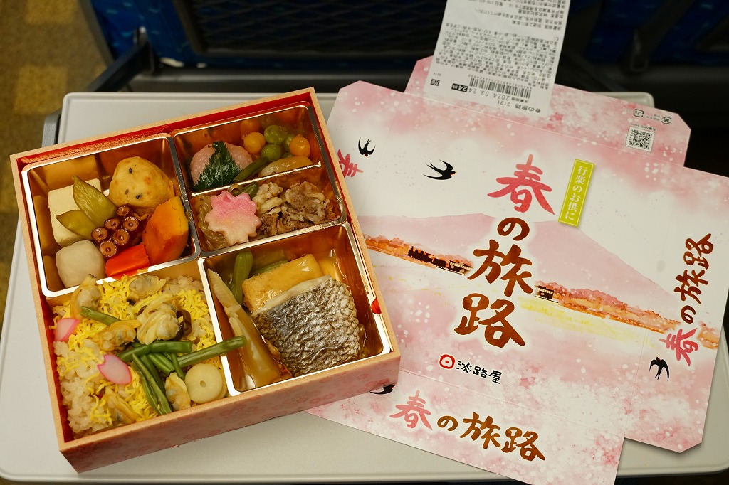2020(令和2)年の3月に発売の春駅弁。ふたには100年くらい前の汽車とツバメと桜並木を描いたのだろうか。中身は松花堂弁当のような4区画に、アサリや山菜などを載せた炊き込み御飯、焼き魚と揚げ出し豆腐とフキやタケノコ、タコにカボチャやサトイモなどの煮物とがんもどきと高野豆腐、牛すき焼き、煮豆と桜餅。1,380円もする高級な弁当には見えない、春らしさをそこそこ含んだ、普段使いの駅弁か。価格は2020年時点で1,200円、2023年時点で1,300円、2024年時点で1,380円。