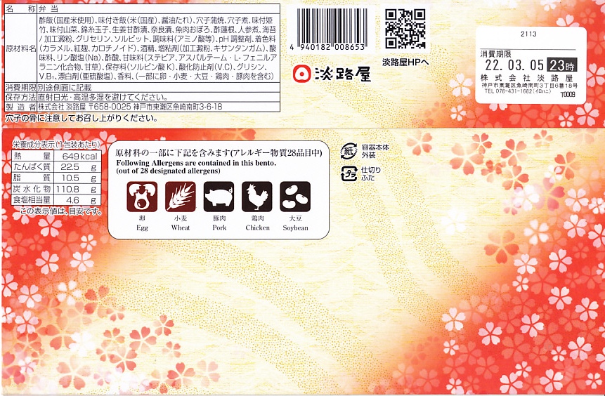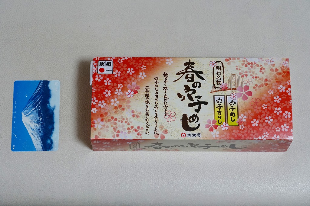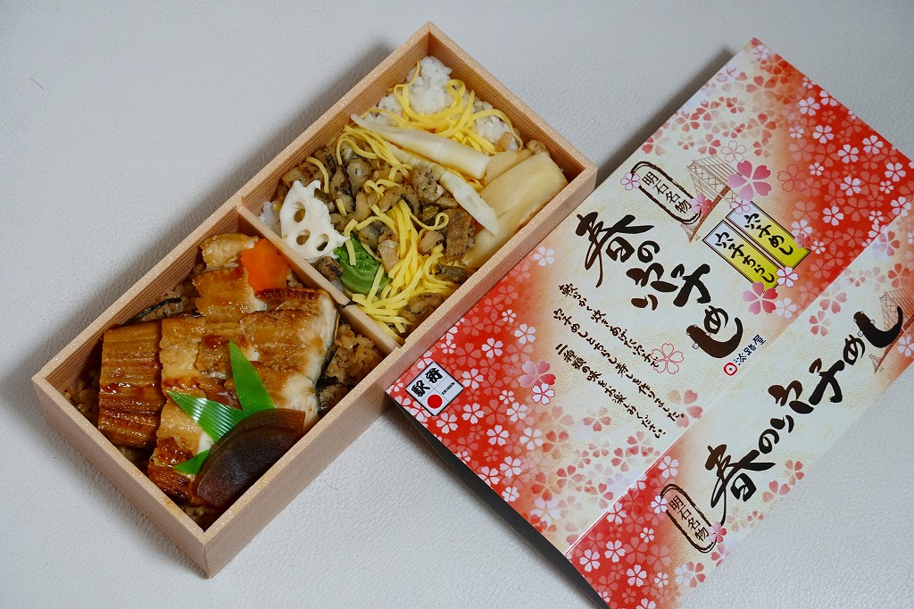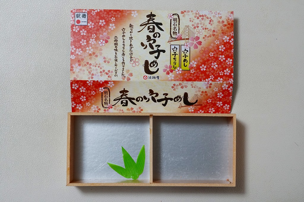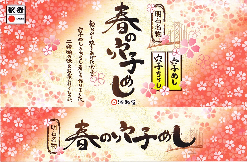 2020(令和2)年の9月頃に発売の「秋の穴子めし」に続き、2021(令和3)年の3月頃に発売。スリーブは赤の濃い春色あるいはサクラ色をしており、アナゴのイラストを使う商品名や内容や明石海峡大橋を描く。中身は「穴子ちらし」と「穴子めし」ということで、四角い容器の一方でタレ御飯をアナゴの蒲焼きとニンジンと奈良漬で覆い、他方で酢飯を煮アナゴと山菜と甘酢生姜で覆う。御飯と御飯の内容で、かき込んで食べる食事に向く。3月から5月までの販売か。9月から11月までの「秋」になると、穴子ちらしの具がくりやしめじなどの秋の味になるらしい。価格は2022年時点で1,150円、2023年時点で1,200円。