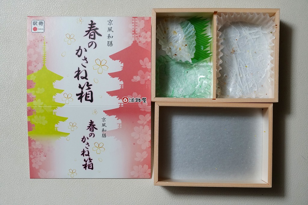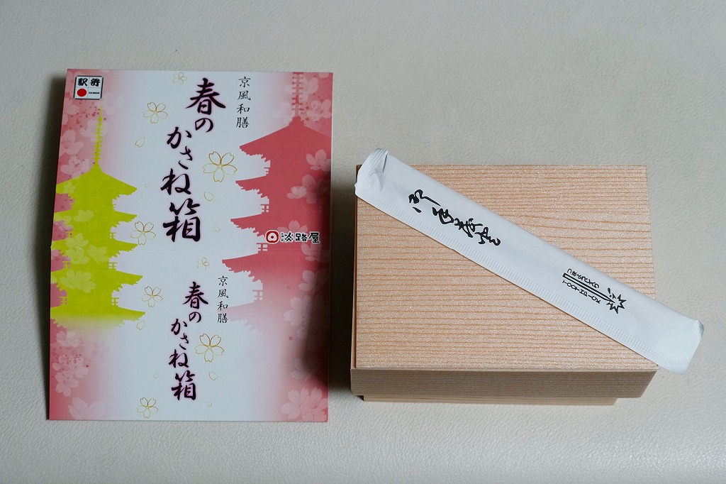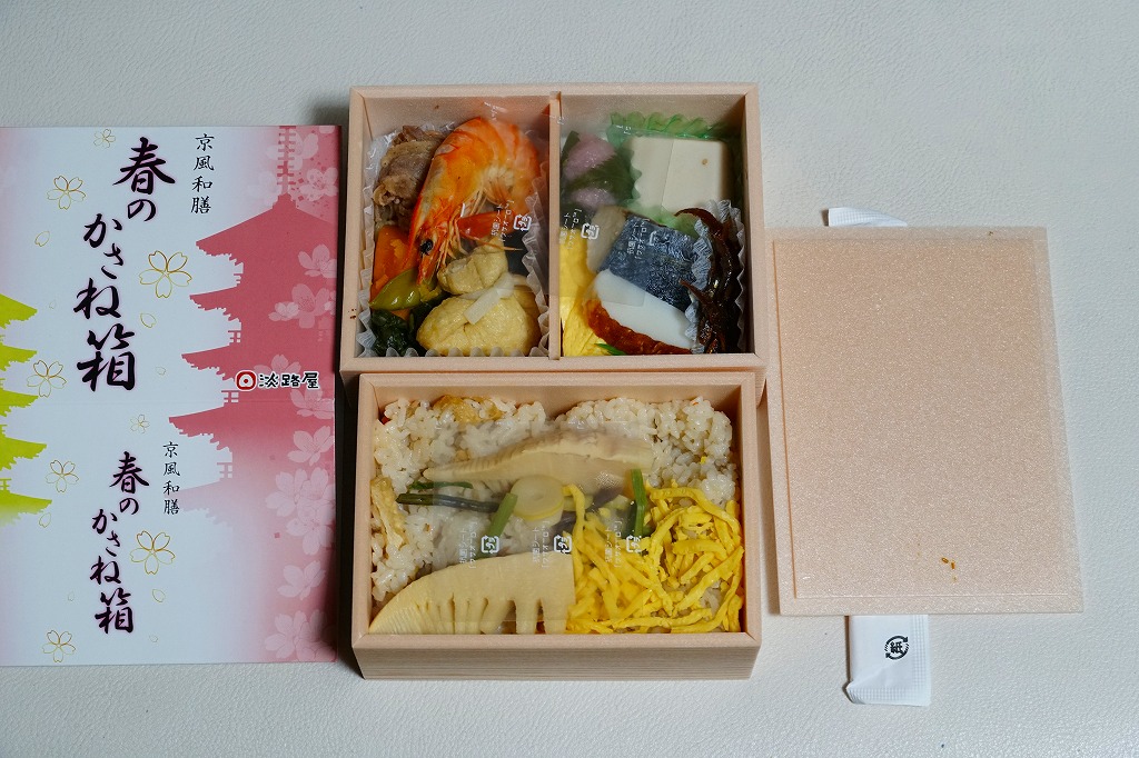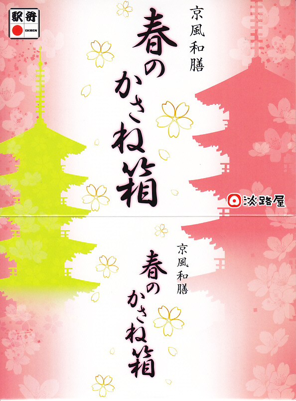 2021(令和3)年の春に発売か。2018(平成30)年の春にも売られたか。「京風和膳」の副題があるとおり、主に京都駅で輸送販売される駅弁、あるいは催事向けの商品かもしれない。小柄な長方形の容器をふたつ重ね、五重塔をシルエットにしたサクラ色のスリーブに収める。中身は下段が油揚げ御飯にタケノコと山菜、上段がおかずで、エビやカボチャや牛肉などの煮物、焼サワラ、かまぼこ、ごま豆腐、菜の花、桜餅など。華美でない姿に上質な食事を詰めた折箱のよう。価格は2022年時点で1,300円、2023年時点で1,380円。