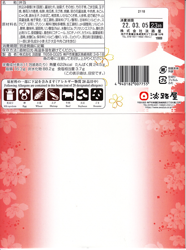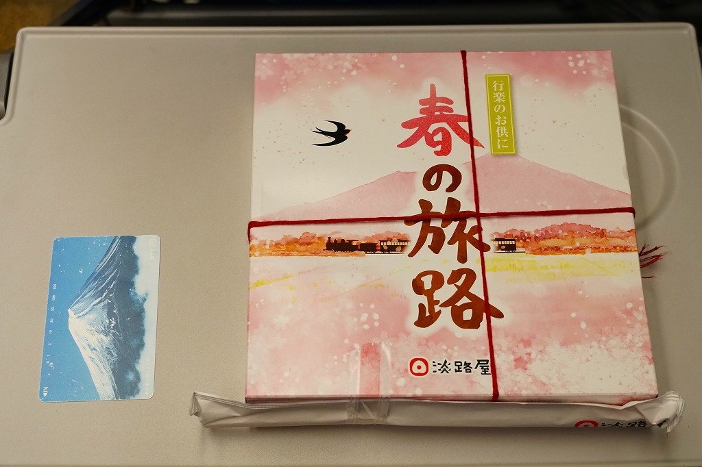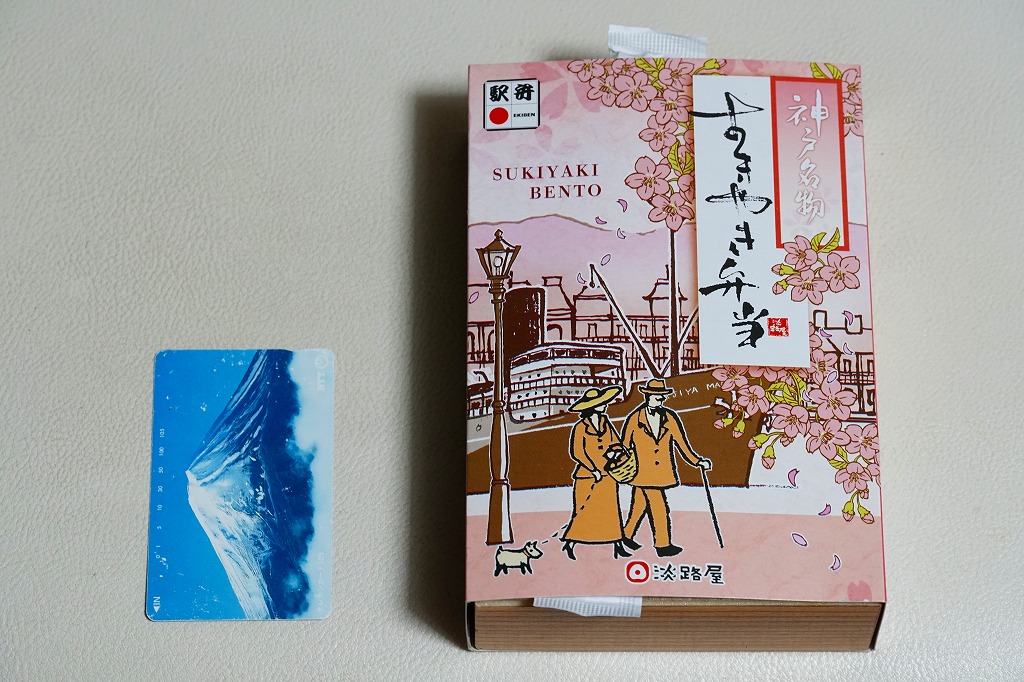 2022(令和4)年3月に発売か。丸い容器を収める四角いスリーブには、神戸市街に六甲山やポートタワーのような神戸の風景らしきものが、桜花とサクラ色に描かれる。7区画に仕切られた中身は、炊き込み御飯をくぎ煮とワラビで覆い、茶飯を錦糸卵と煮穴子で覆い、桜餅、鶏つくねと焼鮭と昆布巻、タケノコとエビといんげん、タコ煮と菜の花、きす甘酢漬。神戸の駅弁で定評のあるおかずが、少しずつ入る感じ。「旅のお供の幕の内」の副題があり、幕の内弁当という感じは受けなくも、機能としては幕の内駅弁と同じように使えそう。この春のみの販売か。