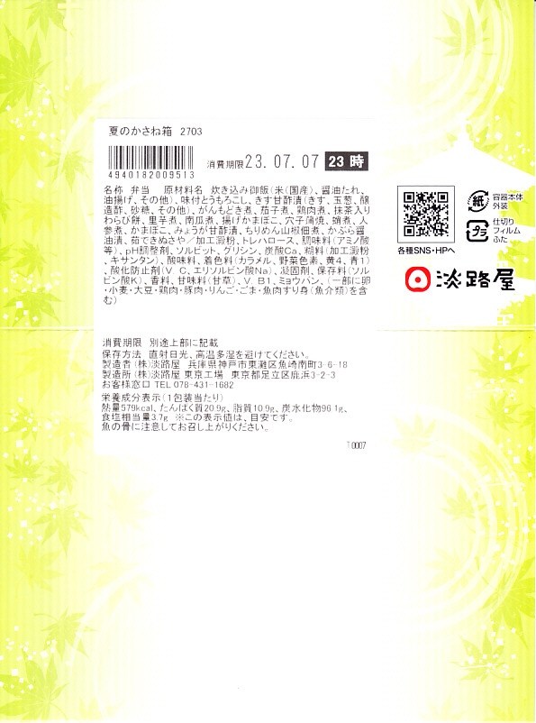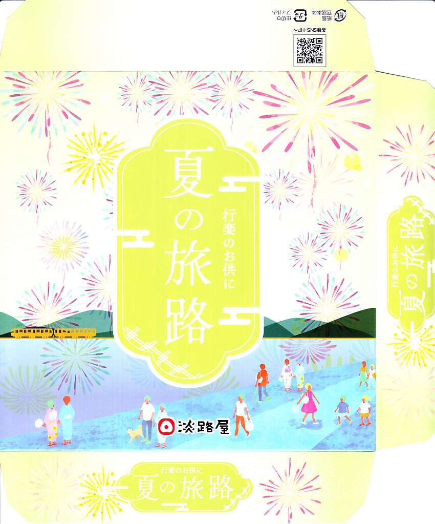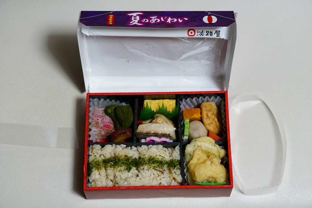 2017(平成29)年の夏までには発売か。中身はあおさ粉を塗った生姜ご飯、焼アジに鶏肉煮に玉子焼、カボチャやサトイモなどの煮物、サツマイモとえびとししとうの天ぷら、サツマイモ甘煮と抹茶入りわらび餅。しっかりした中身に少しだけ、夜景と祭りと花火のふたの絵柄でたっぷりと、夏を感じさせている、機能的なお弁当。これで「秋のあじわい」から冬と春を経て夏までの四季が揃い、関西や関東の駅弁売店で手広く売られる。価格は2018年時点で880円、2021年時点で900円、2022年時点で950円、2024年時点で980円。