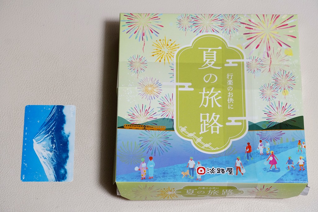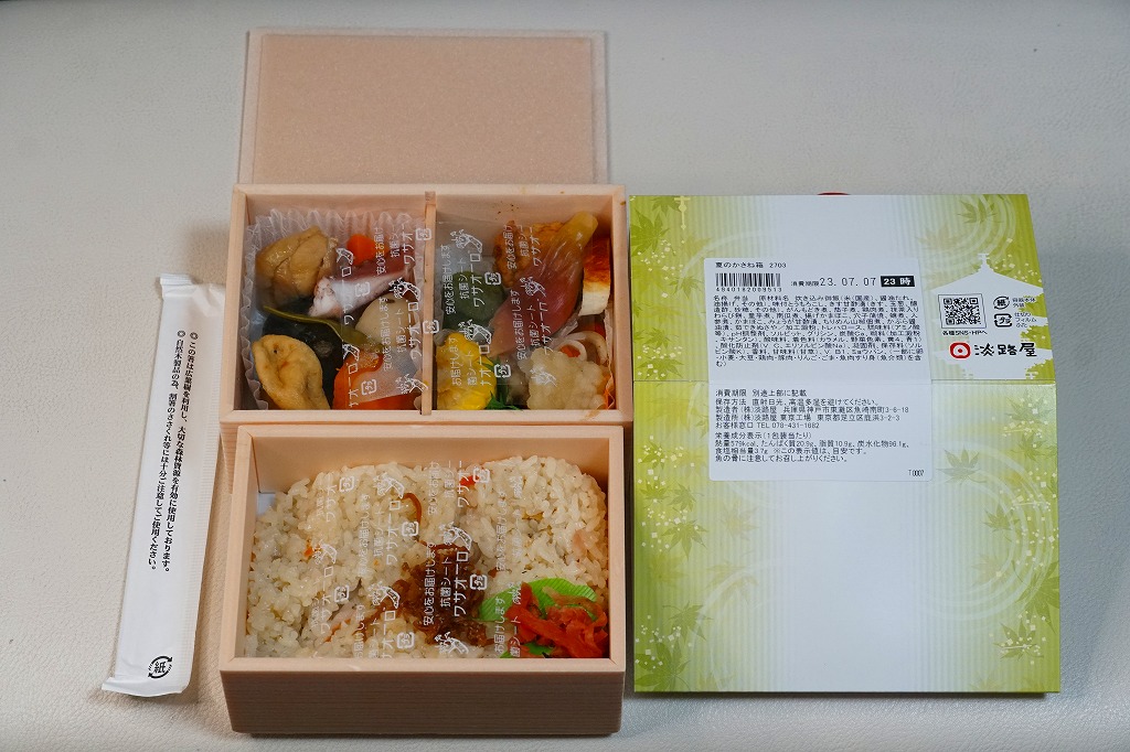 2022(令和4)年の6月に発売の夏駅弁か。ふたには海岸と花火と列車などのイラストを載せた。中身は松花堂弁当のような4区画に、みょうがと枝豆とちりめん山椒佃煮を載せて錦糸卵で覆った炊き込み御飯、牛肉煮と生姜甘酢にタコやカボチャなどの煮物、焼アジに玉子焼に鶏肉煮にサツマイモや抹茶入りわらび餅など、くるみとマリネとえび煮や煮豆などを詰める。1,300円もする高級な弁当には見えない、夏らしさがあるようなないような、普段使いの駅弁か。関西や関東の駅弁売店で手広く売られる。