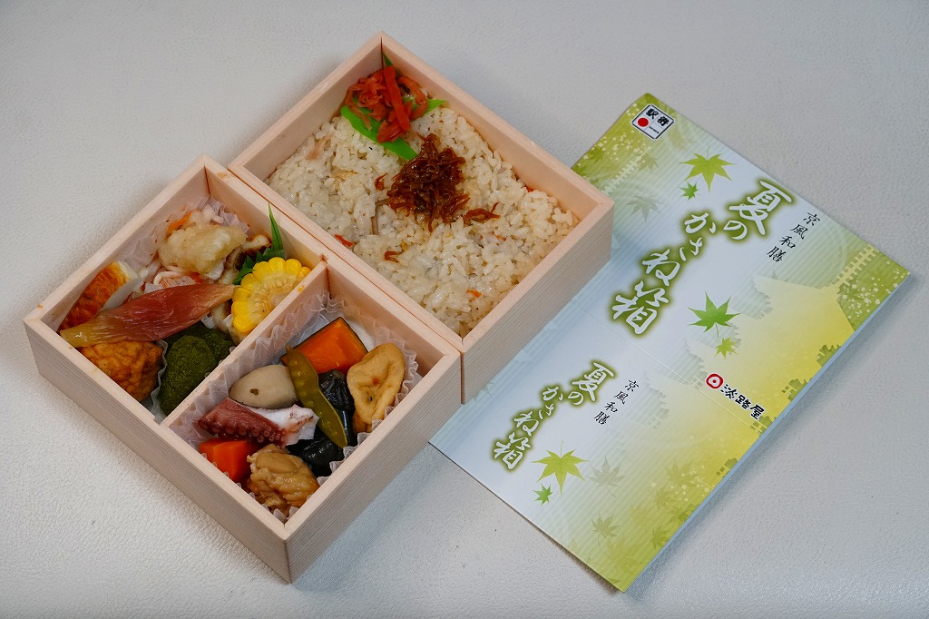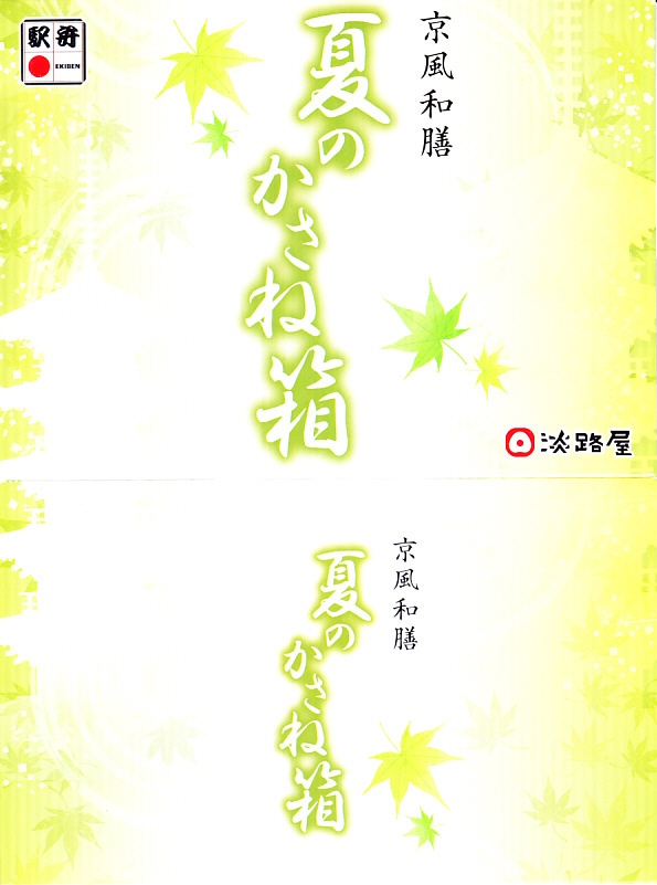 春と秋の「かさね箱」に追加して、2022(令和4)年の夏に発売か。「京風和膳」の副題があるとおり、主に京都駅で輸送販売される駅弁、あるいは催事向けの商品かもしれない。小柄な長方形の容器をふたつ重ね、五重塔をシルエットにした黄緑色のスリーブに収める。中身は下段がちりめん山椒を載せたかやくご飯、上段がおかずで、タコと鶏肉と根菜などの炊き合わせ、キス天ぷらのマリネ、ミョウガ甘酢漬、とうもろこし、あなご、揚げかまぼこ、かぶら醤油漬、抹茶わらび餅など。華美でない姿に上質な食事を詰めた折箱のよう。価格は2022年は1,350円、2023年は1,380円。