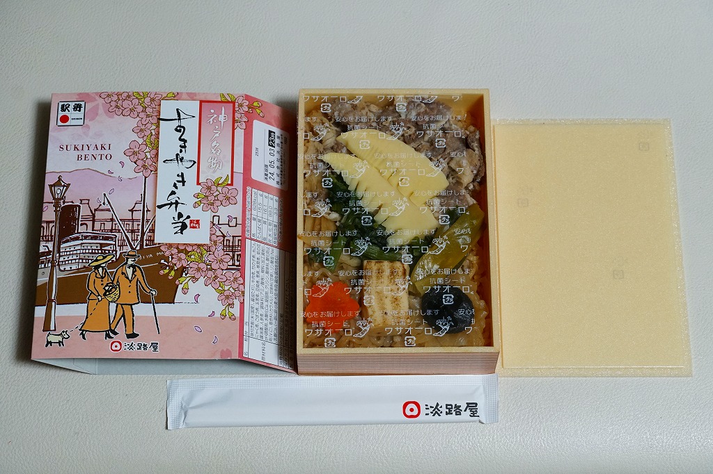 2023(令和5)年3月に発売か。5月のゴールデンウィーク明けまで売られる春駅弁で、2018年発売の「神戸名物すきやき弁当」の春バージョン。容器や中身のつくりはそれと同じで、スリーブは春と桜の色になり、牛すき焼きの具にタケノコ煮と菜の花醤油漬を加えた。引き続き、漬物などの付合せやタレなどの袋を添付しない、すきやきだけのお弁当。