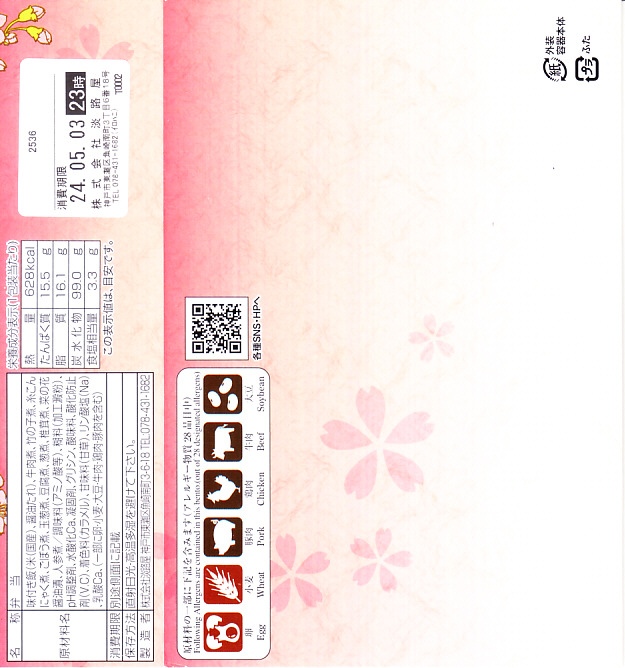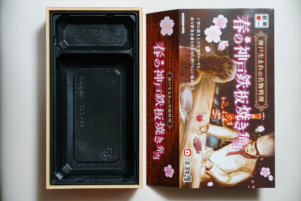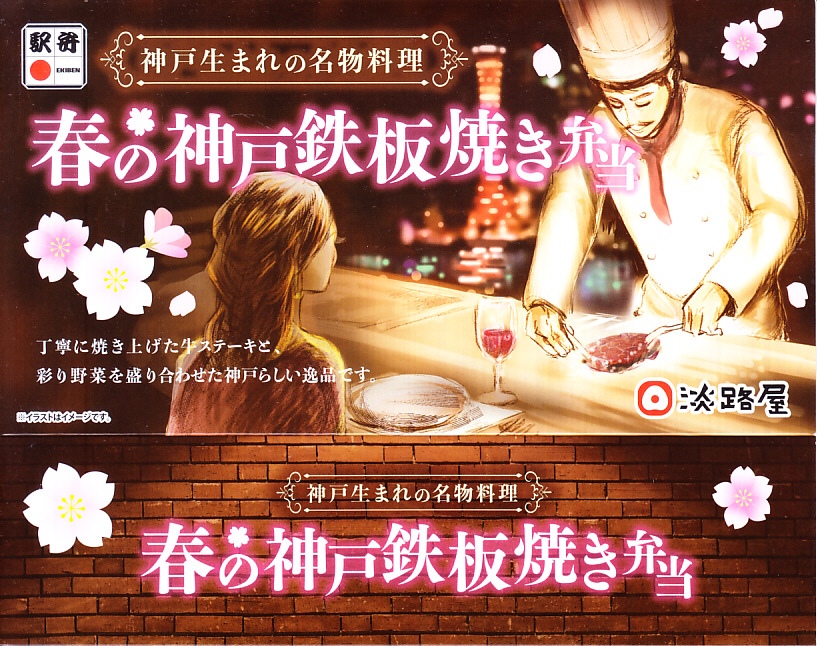 2024(令和6)年4月までに発売か。5月まで売られる春駅弁で、2022年発売の「神戸鉄板焼き弁当」の春バージョン。容器や中身のつくりはそれと同じで、スリーブの文字が春と桜の色になり、牛ステーキ弁当の具からコーンとパプリカを抜き、タケノコの素揚げとにんじんを加えた。春らしさは無いと思う、ガーリックのステーキ丼。