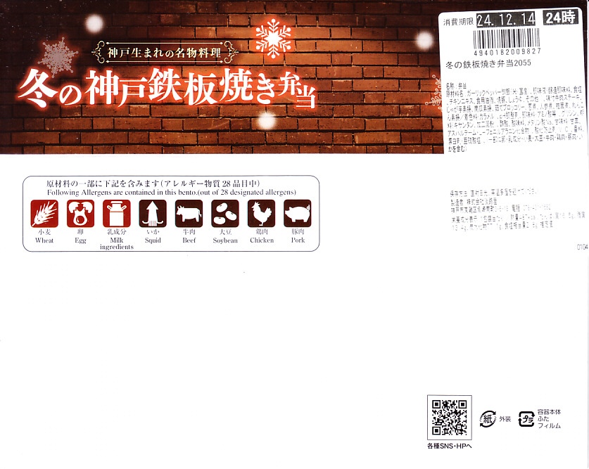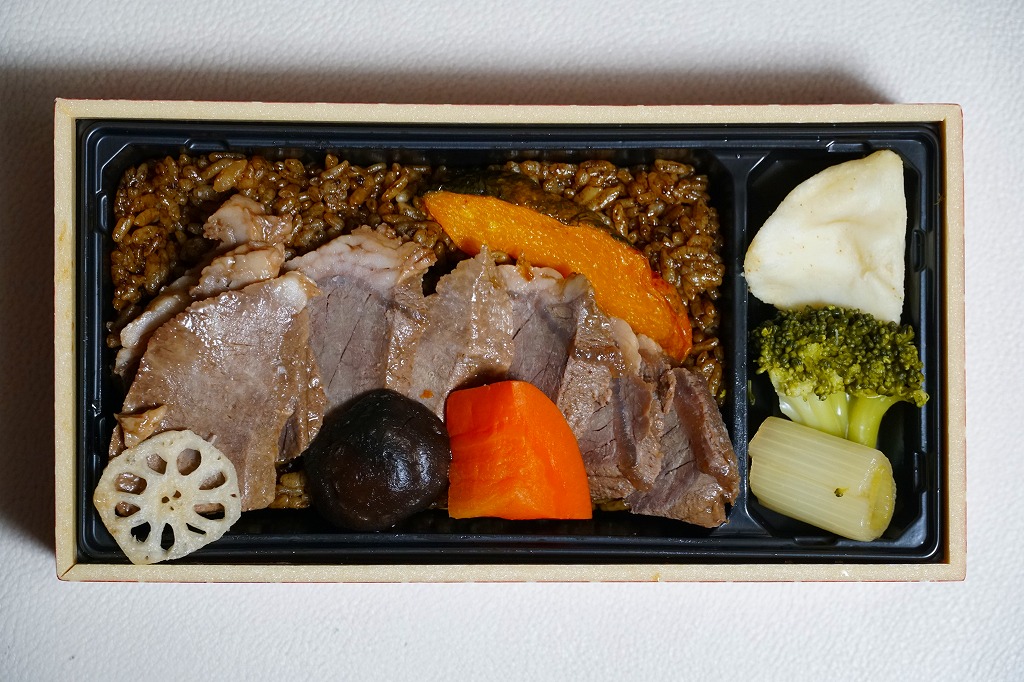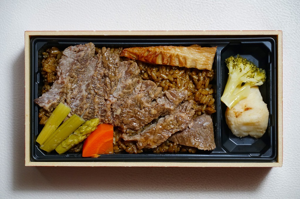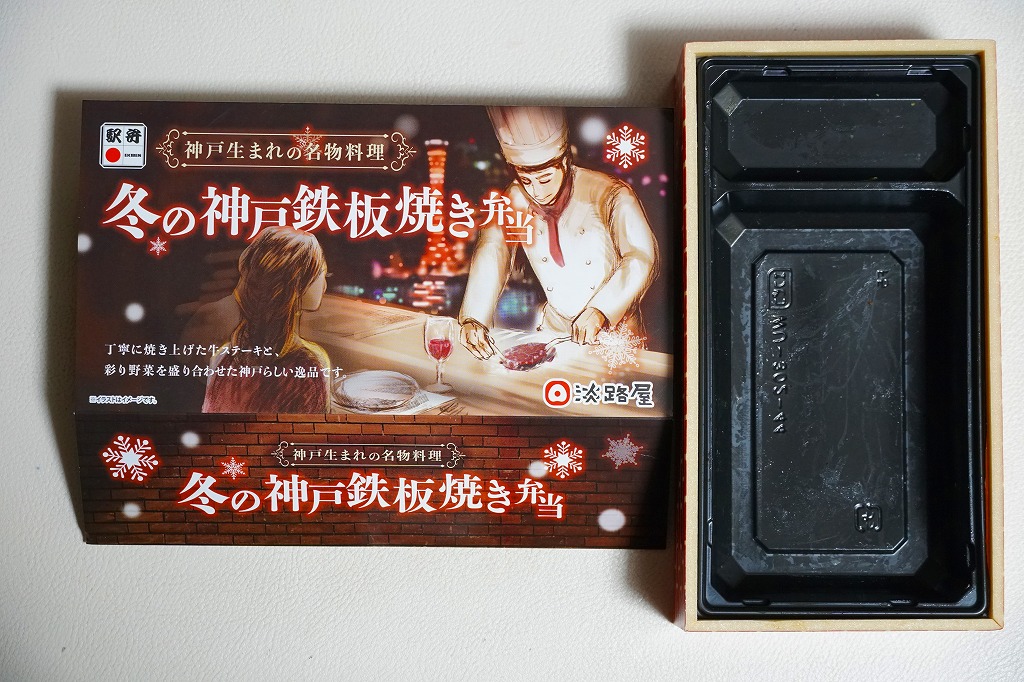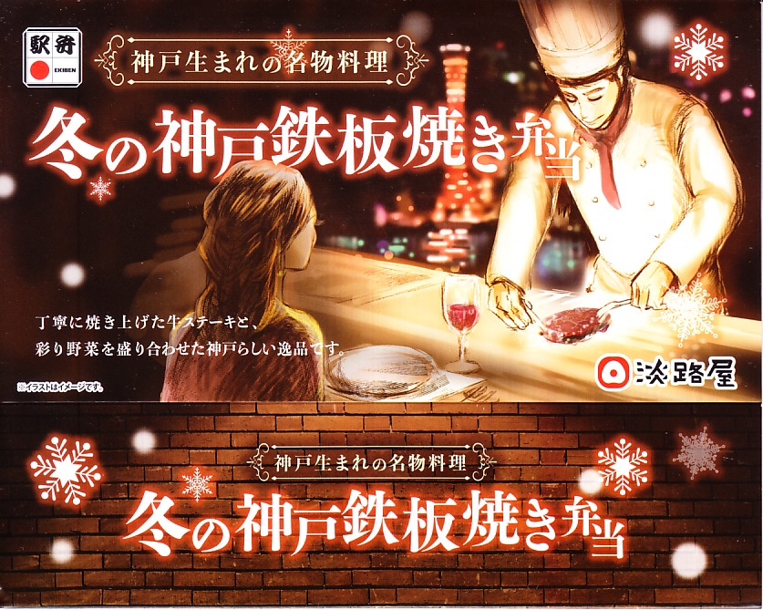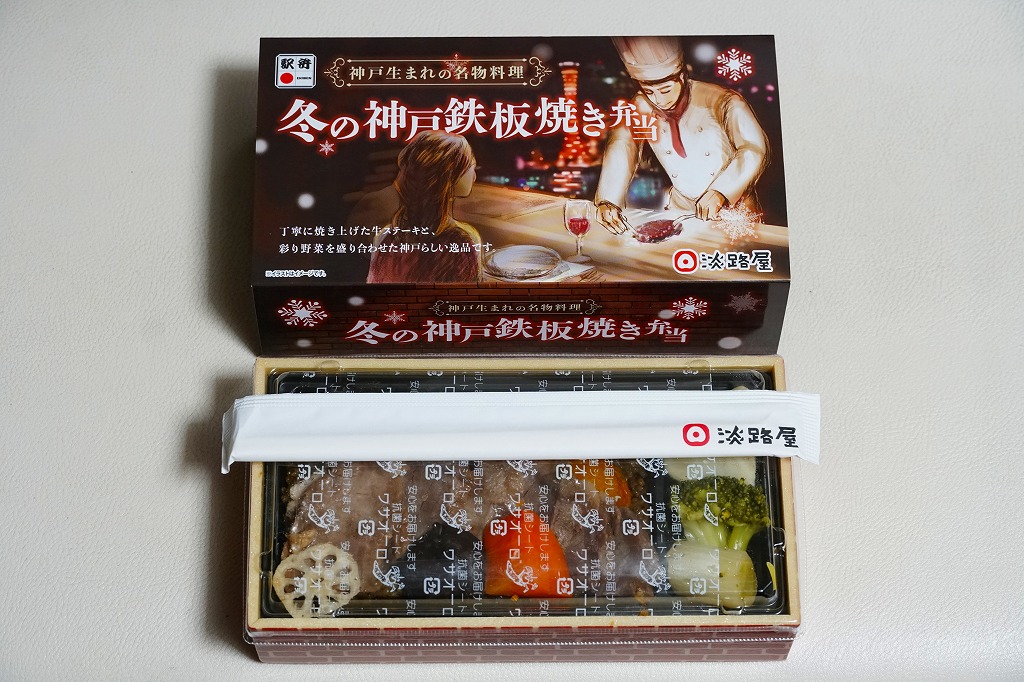 2024(令和6)年12月までに発売か。2月まで売られる冬駅弁で、2022年発売の「神戸鉄板焼き弁当」の冬バージョン。容器や中身のつくりはそれと同じで、スリーブの文字が冬と光の色になり、牛ステーキ弁当の具をかぼちゃ、れんこん、しいたけ、にんじん、ねぎ、ブロッコリー、じゃがいもの素揚げとしたもの。通常版と変わらない、特に冬というわけではない感じの、ガーリックのステーキ丼。価格は「秋」まで1,380円、この「冬」から1,480円。