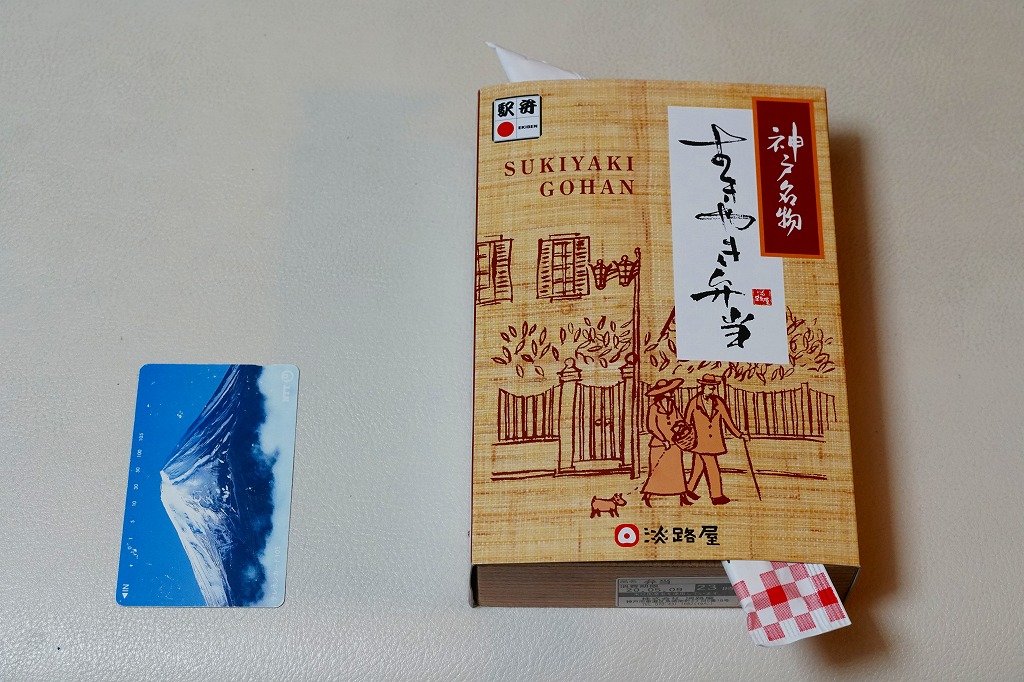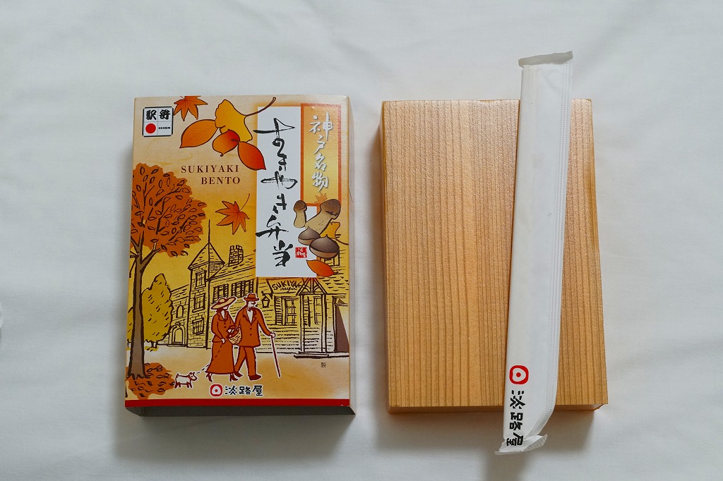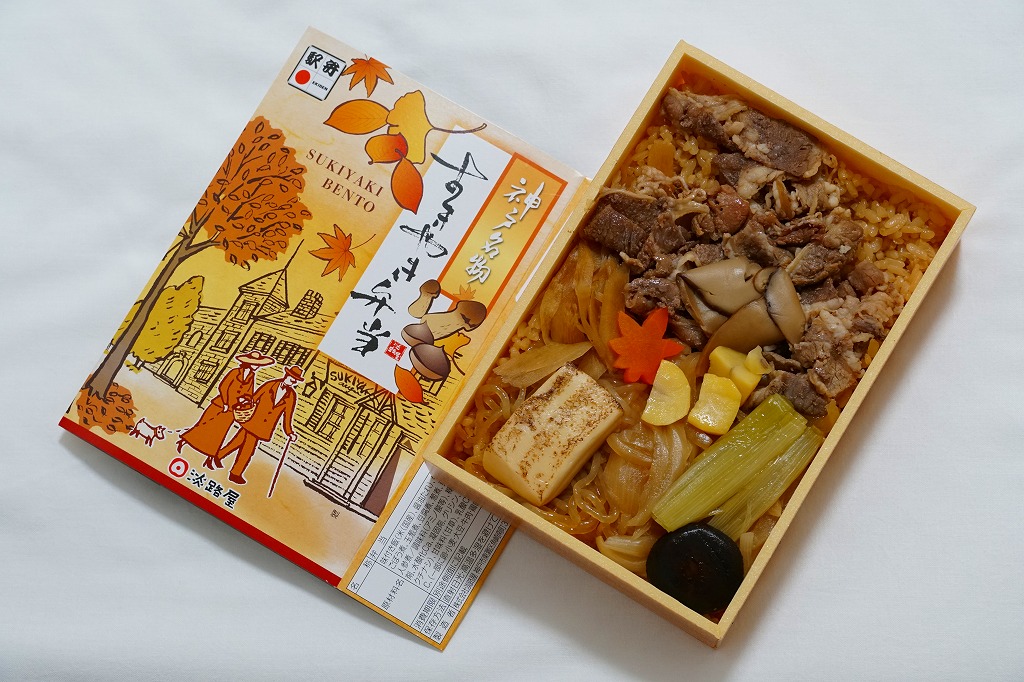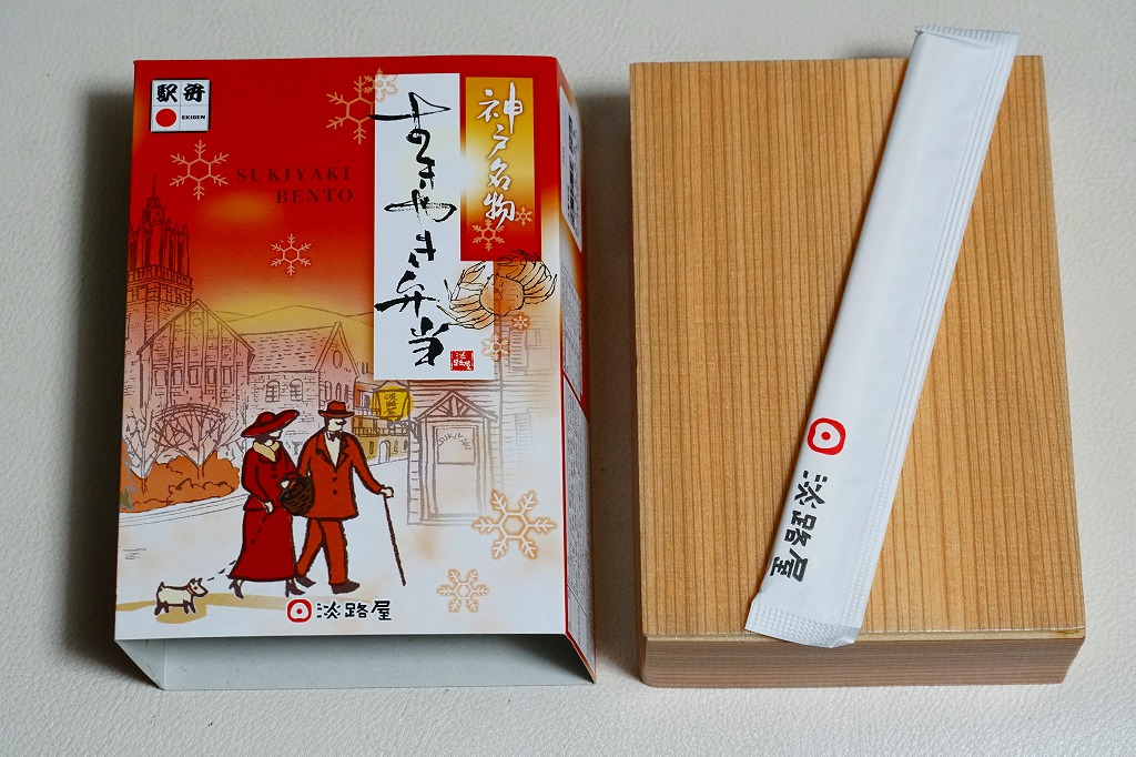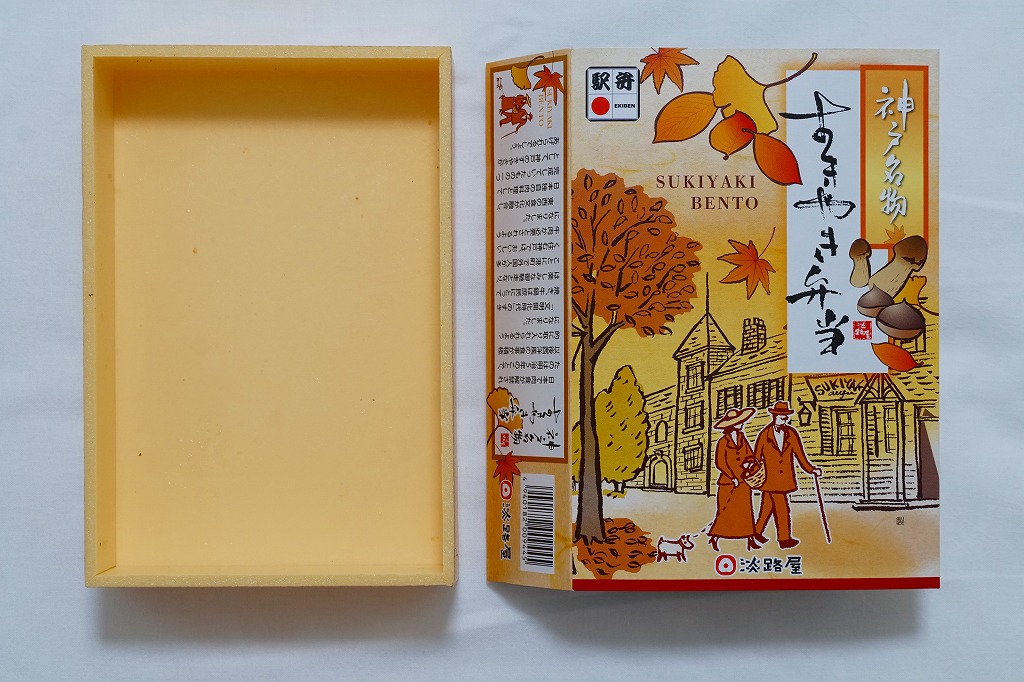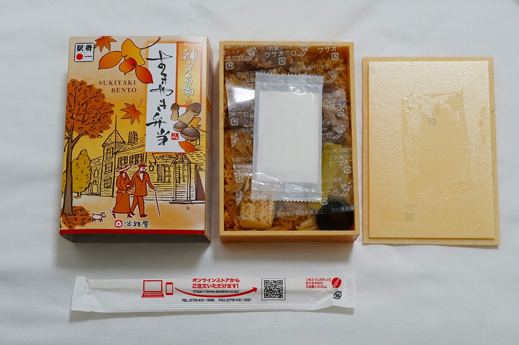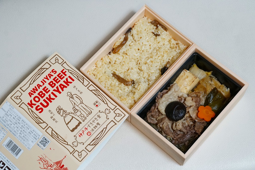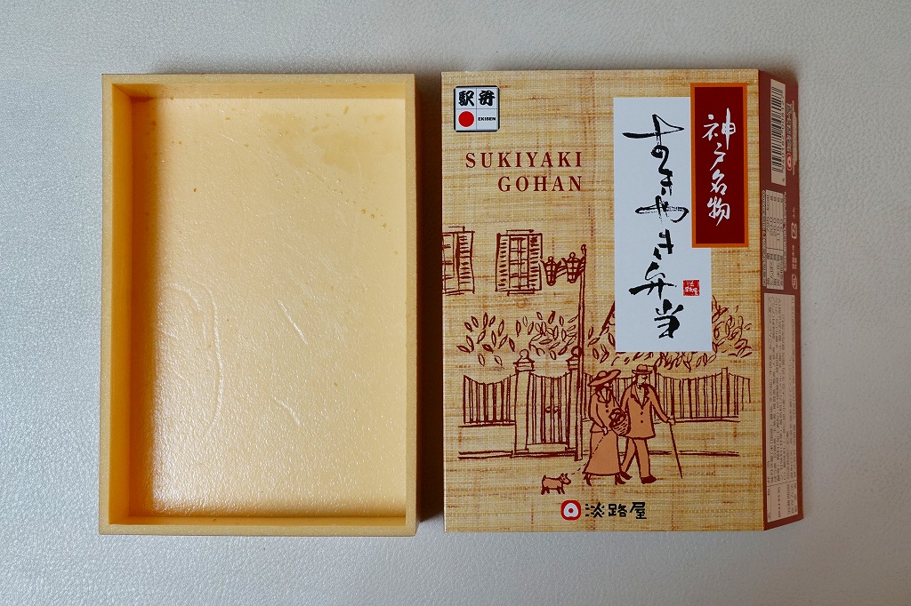 昭和時代から何度も何度も出続ける、新神戸駅弁のすきやき弁当の、2023年時点での姿のひとつ。この容器と内容では、2022年1月までに発売か。2023年1月までに絵柄を変えたスリーブには、赤い太字で大きく「AWAJIYA’S KOBE BEEF SUKIYAKI」と書かれ、これが駅弁の名前のようにも見える。ふたつ重ねた長方形の容器の、下段にきのこピラフを詰め、上段に神戸牛すきやきを、牛肉、糸こんにゃく、とうふ、ごぼう、白菜、たまねぎ、しいたけ、ねぎ、にんじんの煮物を詰める。常温でいただける、水気のある牛すき焼き。温めればもっと、おいしくなりそう。
