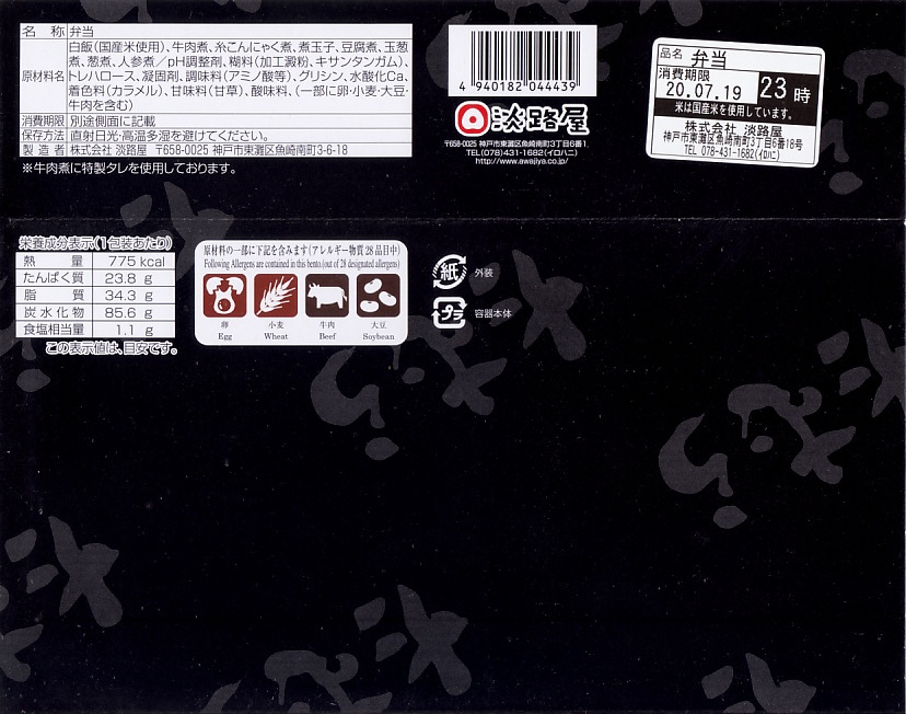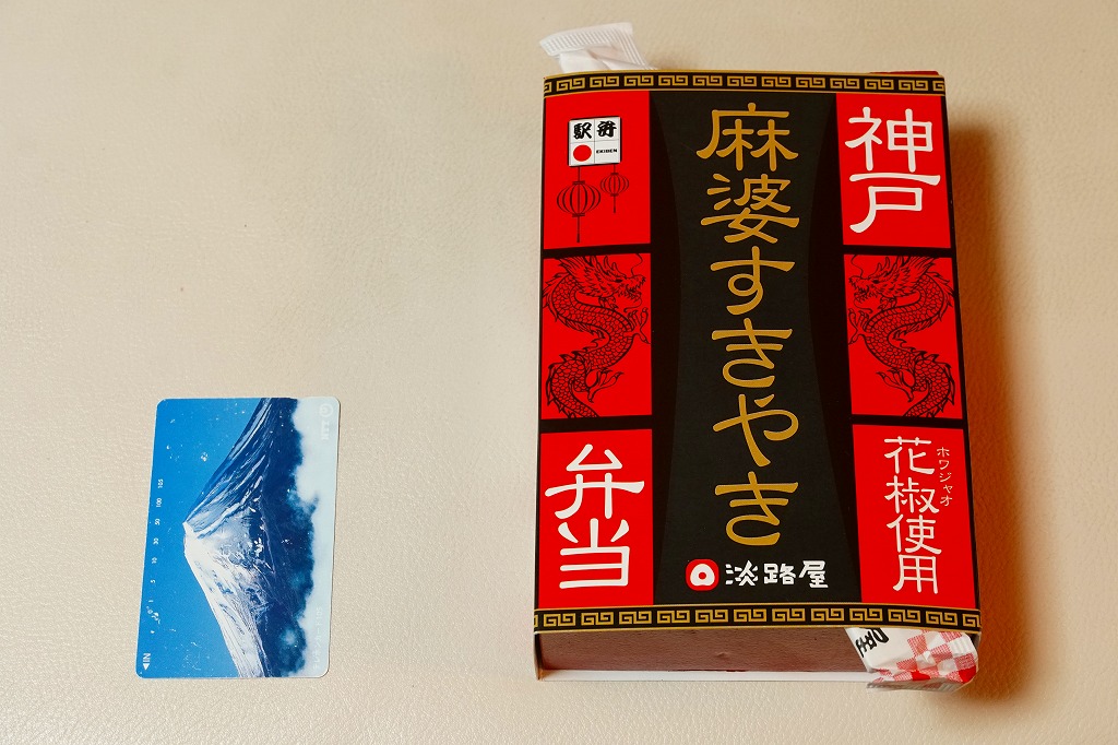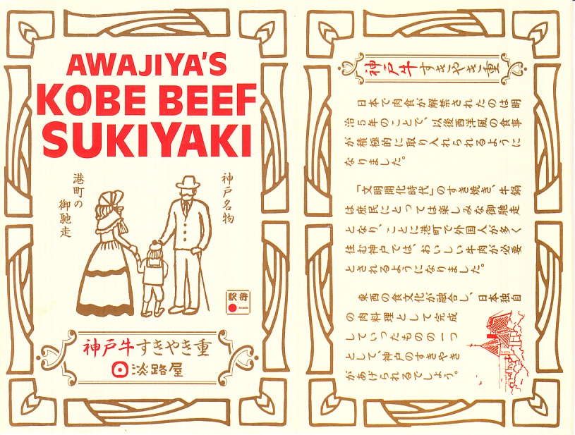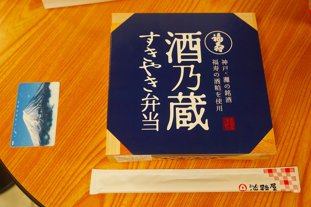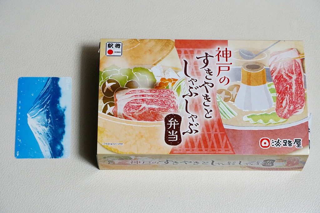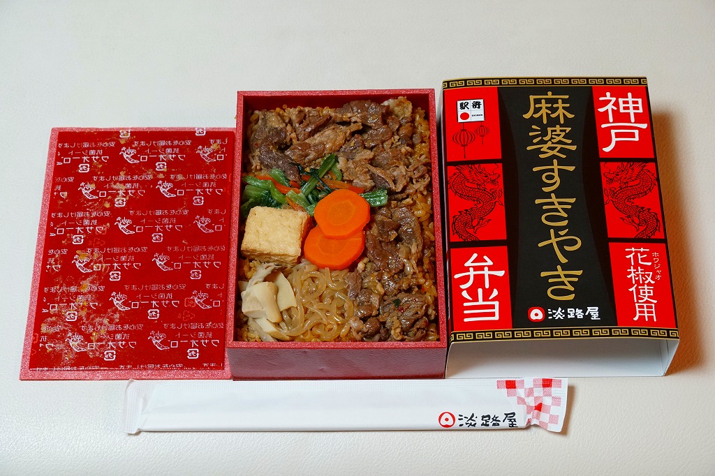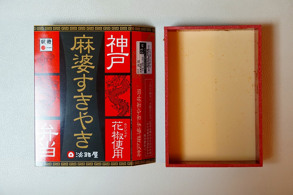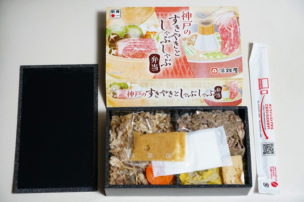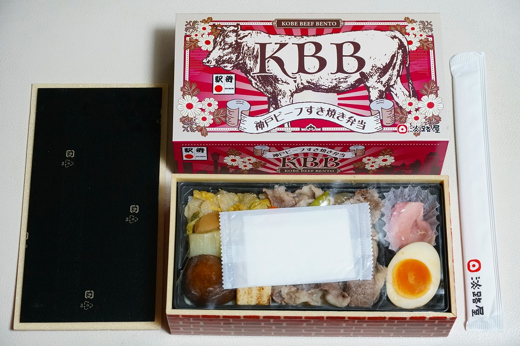昭和時代から何度も何度も出続ける、新神戸駅弁のすきやき弁当の、2023年時点での姿のひとつ。この容器と内容では、2022年1月までに発売か。2023年1月までに絵柄を変えたスリーブには、赤い太字で大きく「AWAJIYA’S KOBE BEEF SUKIYAKI」と書かれ、これが駅弁の名前のようにも見える。ふたつ重ねた長方形の容器の、下段にきのこピラフを詰め、上段に神戸牛すきやきを、牛肉、糸こんにゃく、とうふ、ごぼう、白菜、たまねぎ、しいたけ、ねぎ、にんじんの煮物を詰める。常温でいただける、水気のある牛すき焼き。温めればもっと、おいしくなりそう。