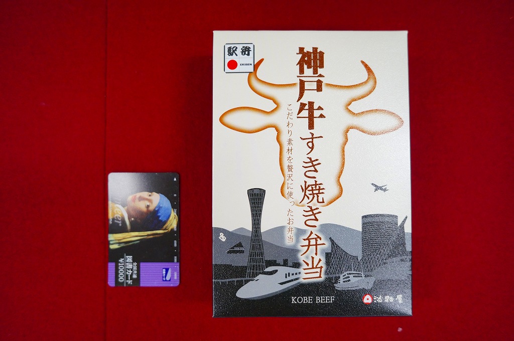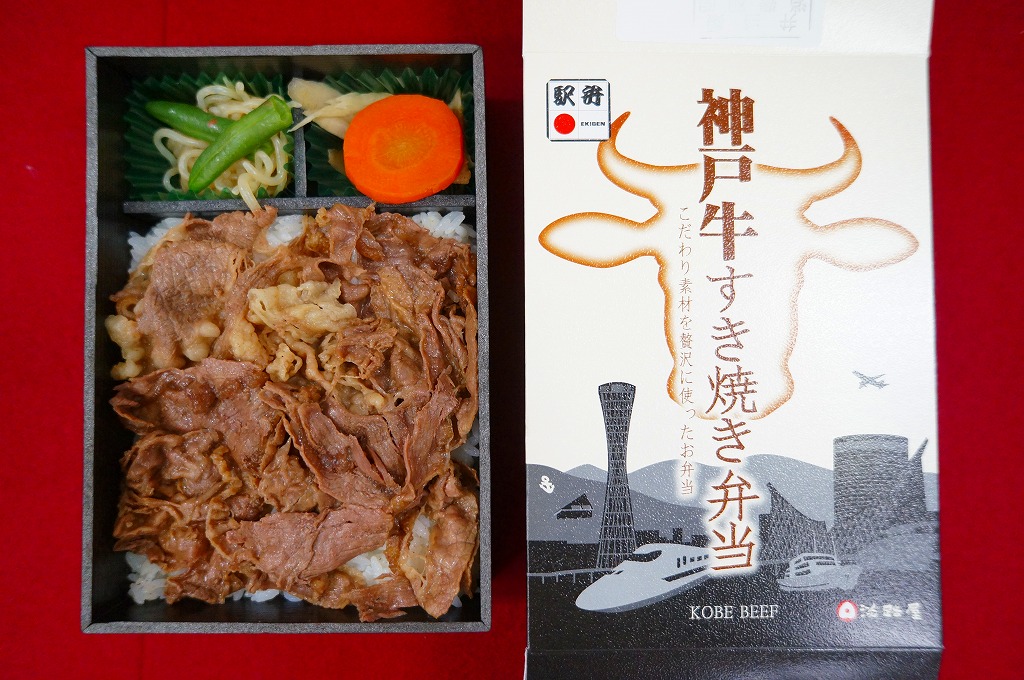 下記の新神戸駅限定の注文販売駅弁「黒毛和牛神戸すき焼き弁当」を、2011(平成23)年の秋までにリニューアルか。これは京王百貨店の駅弁大会での実演販売で購入したもの。真っ黒な長方形の容器を、神戸や牛にちなむ絵柄をいろいろ描いたボール紙の箱に詰める。中身は白御飯に牛肉煮を載せ、ニンジン、ごぼう、インゲン、糸こんにゃくを添えるもの。牛肉は薄く引き延ばされた感じで、そのためにジューシーでビーフの香りが感じられる。現地で買った前作とは違い、これは見ても食べてもうまい。価格は2012年の購入時で1,300円、2014年4月の消費税率改定で1,330円。2017年までの販売か。