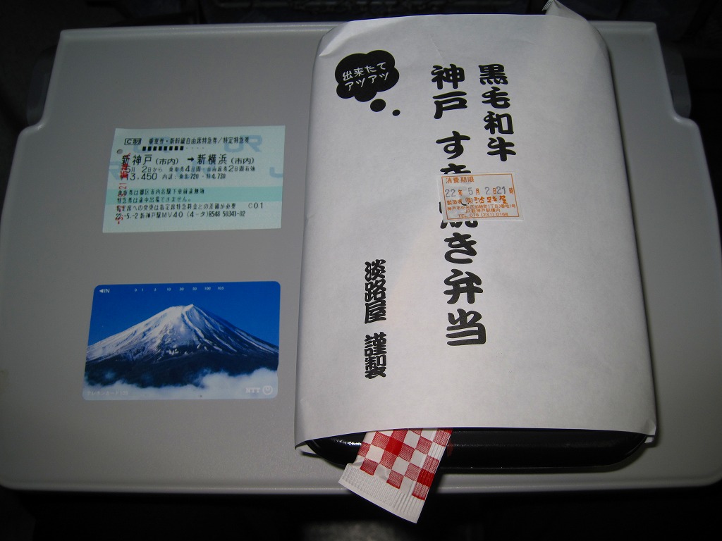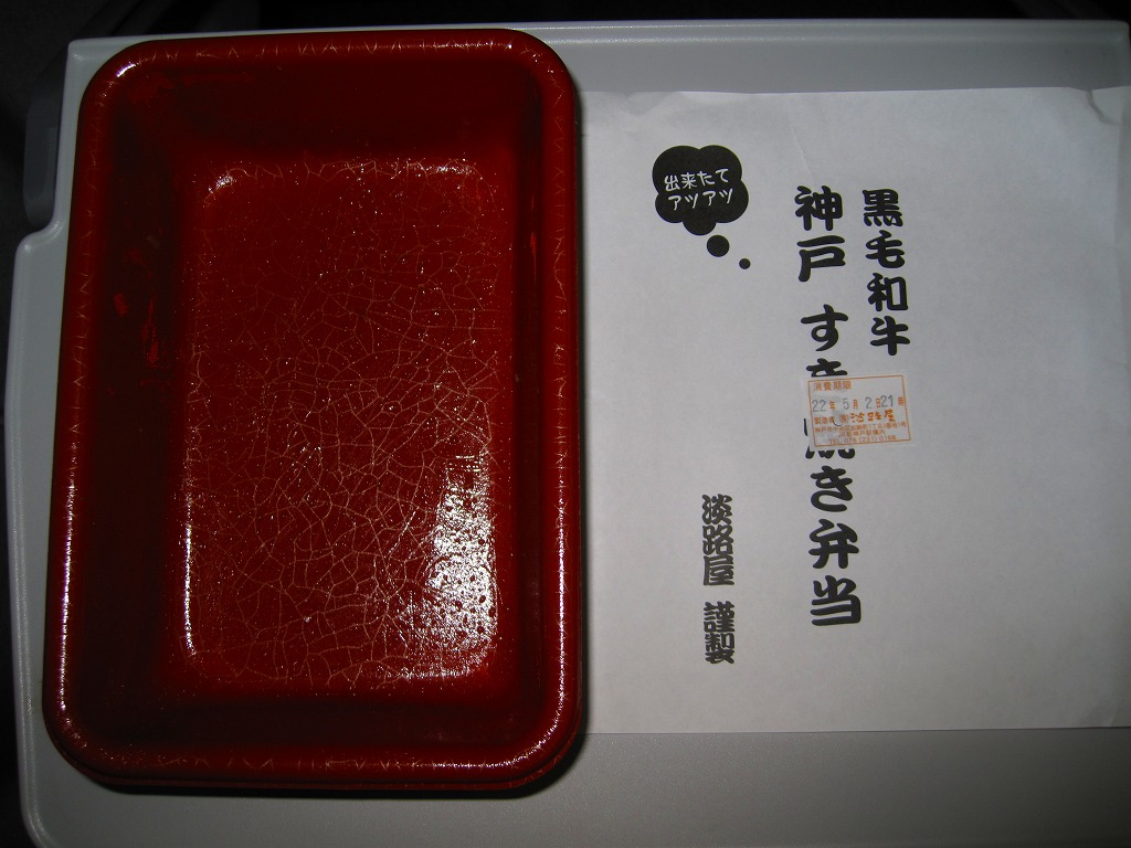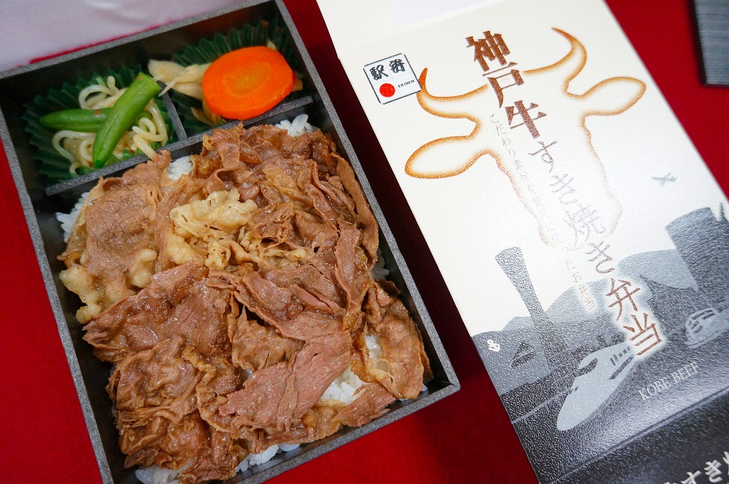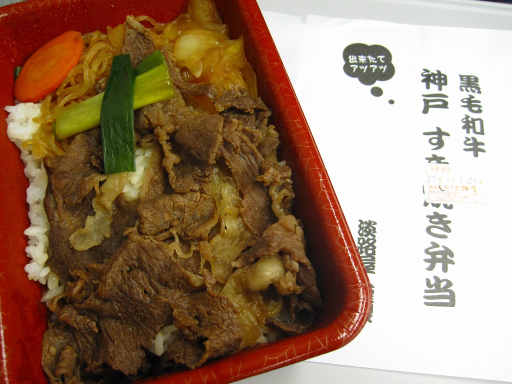 掛紙でも販売員からも一押しされたとおり、確かに出来たてでアツアツなのだが、中身は暖かいだけであまり美味いとは思えない牛丼だった。この調製元の「肉めし」その他の常温駅弁での牛肉の旨さを考えると、掛紙のデザインや容器の選定ともども、駅弁屋の実力が出ていない駅弁だと思う。2011年までに上記の「神戸牛すきやき弁当」(1,300円)へリニューアルされた模様。