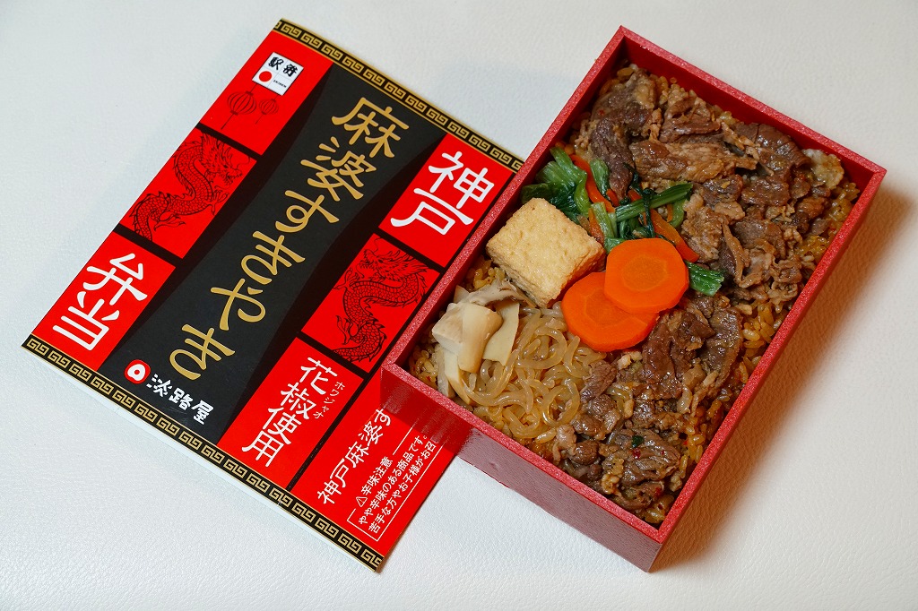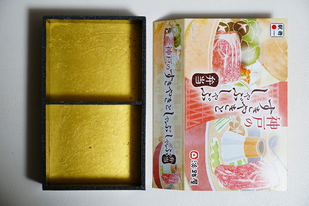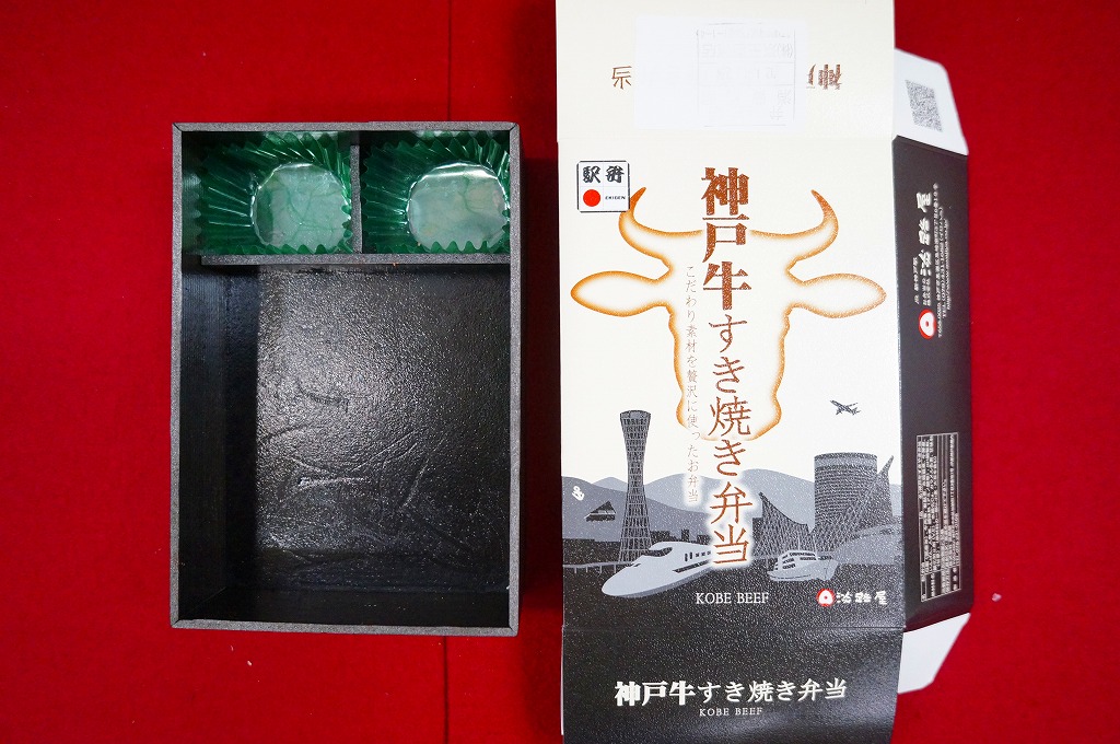 秋冬の駅弁大会シーズンに向けた、2023(令和5)年秋の新商品。淡い絵柄のスリーブには、神戸ポートタワーとすきやきとしゃぶしゃぶを描く。黒い長方形の容器の2区画に味付飯を詰め、一方を牛肉と白菜と豆腐の煮物で覆いインゲンとお麩で彩り、他方を茹で牛肉と糸こんにゃくで覆いネギとにんじんで彩る。見た目も内容も、すきやきとしゃぶしゃぶの組合せ。神戸の駅弁を昔から知りすぎていると、すき焼きなのに加熱機能付き容器でない、しゃぶしゃぶなのに冷しゃぶの高額駅弁でない、と昭和時代の先進事例での固定観念が邪魔をして、謎の駅弁に見える。