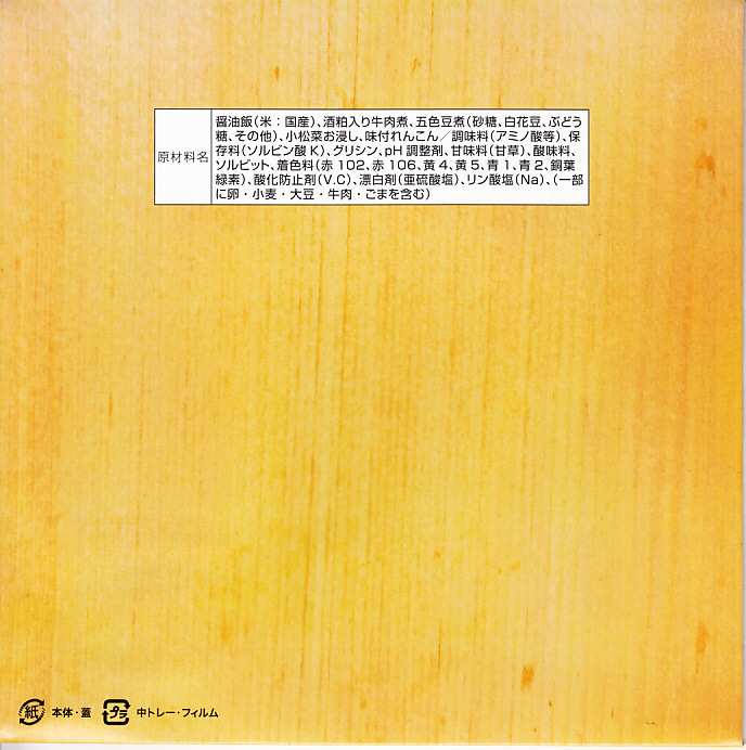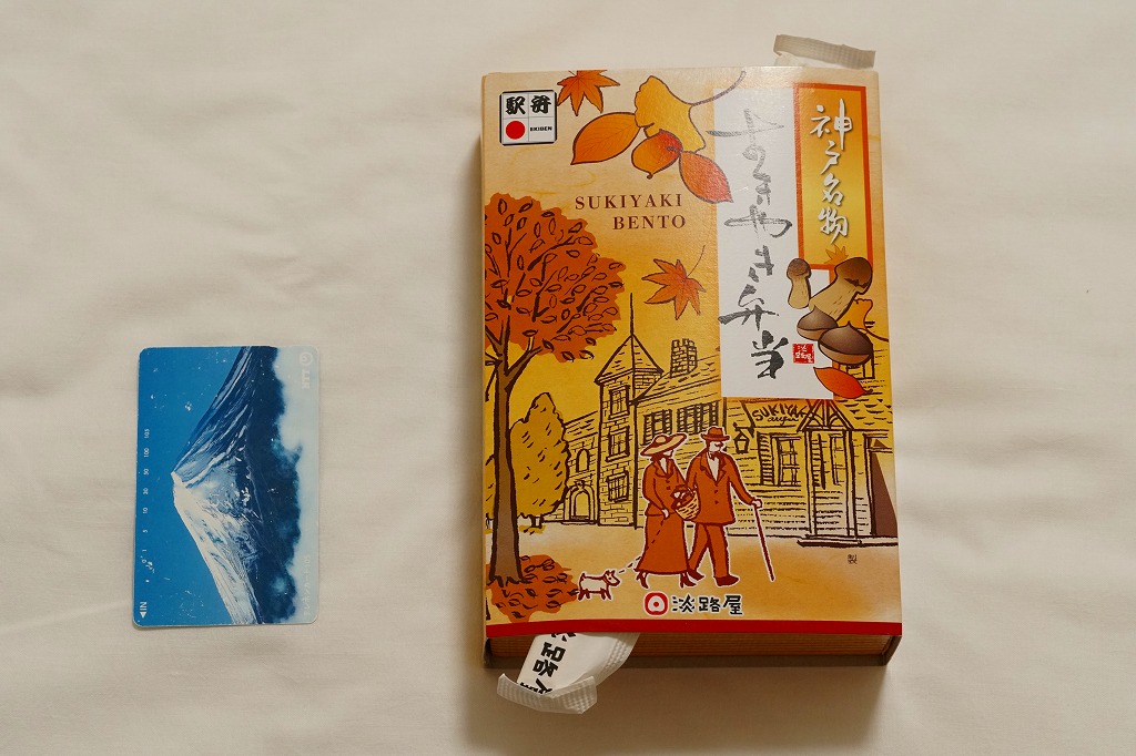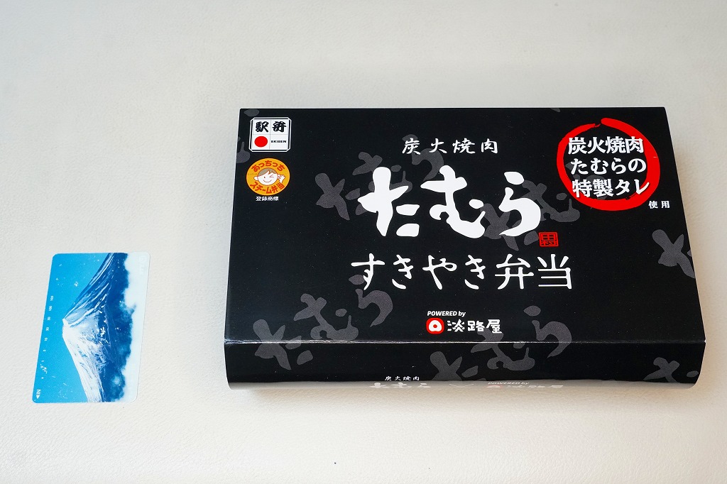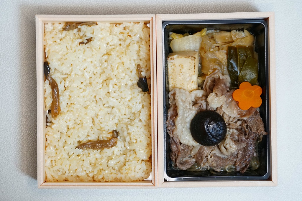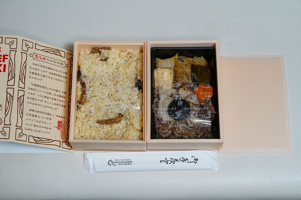 この姿と名前では、2018(平成30)年9月の発売。1988(昭和63)年の発売で、ひもを引くと温まる「あっちっちすきやき御飯」の、30年の時を経て出てきた常温版。味付き飯を、牛肉、糸こんにゃく、ごぼう、豆腐、タマネギ、シイタケ、ネギ、ニンジンの煮物、つまり牛すき焼きで覆うもの。漬物などの付合せを中身にも別添にも持たない、すきやき弁当だけの駅弁は、珍しいかもしれない。玉子は入らない。価格は2020年の購入時で950円、2022年3月から980円。