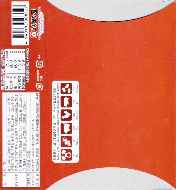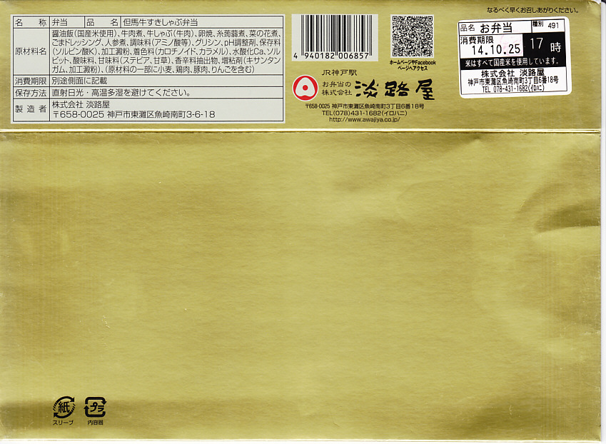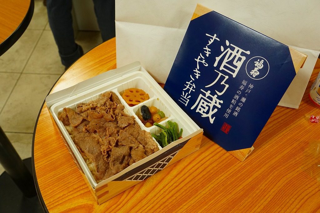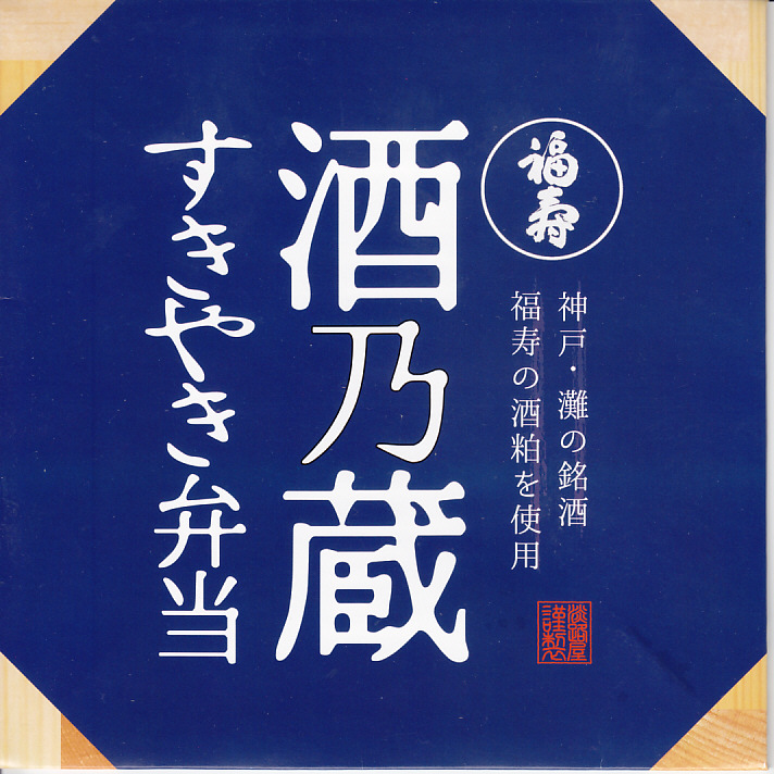 2018(平成30)年1月1日の発売。同月の京王百貨店の駅弁大会でデビューした下記の駅弁「酒乃蔵牛肉弁当」の親戚かと思ったら、調製元のフェイスブックによると「昨夏に発売した商品をグレードアップ」だそうで、こちらが先だった。神戸・灘の銘酒「福寿」の酒粕の使用を共通に、こちらは駅弁の名前のとおり白飯を牛すき焼き肉で覆い、れんこん、煮豆、和え物の付合せ。こういう味が今の関西でうけているのかと思ったら、この日の満員の催事場では客が付いていなかった。駅でも売られたが、半年以内に売り止めたと思われる。