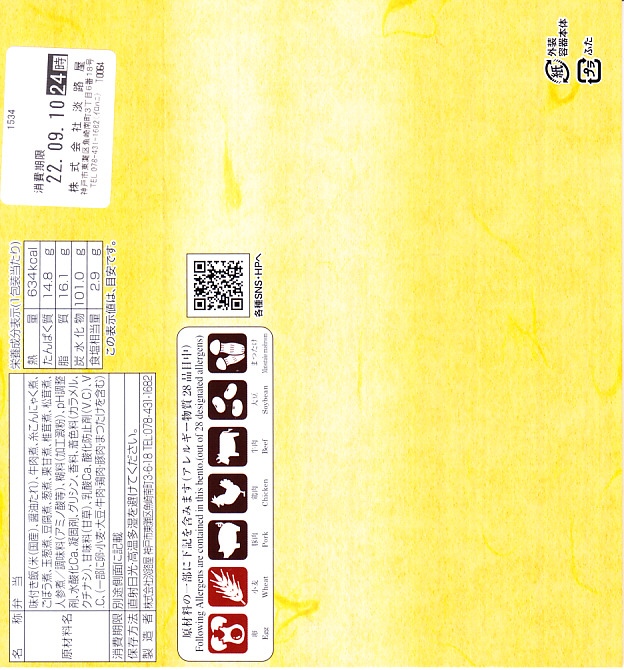 この姿と名前では、2022(令和4)年9月の発売か。駅弁催事での商品名は「秋のすきやき弁当」であり、下記の駅弁「神戸名物すきやき弁当」を四季の駅弁に変えたものだと思われる。スリーブの絵柄と宣伝文は従前を踏襲するが、くり、松茸、紅葉と、秋らしい絵柄を加えた。