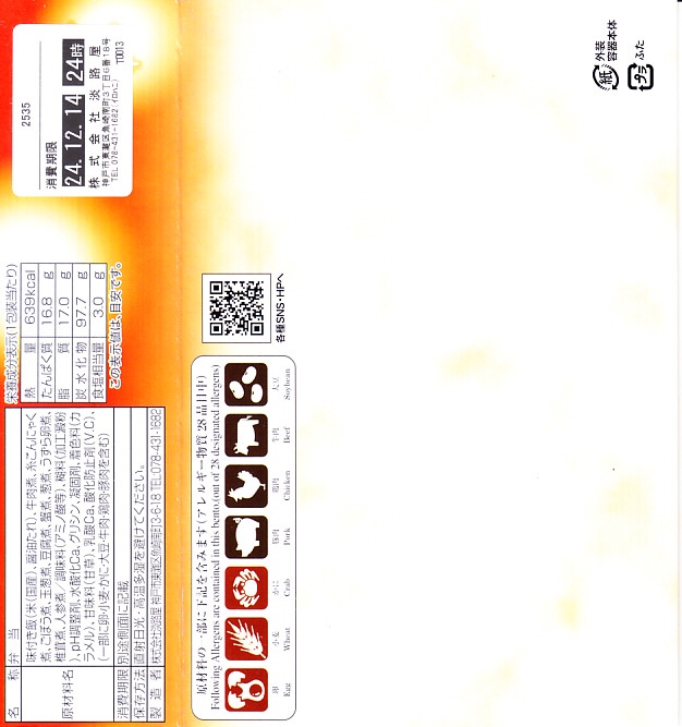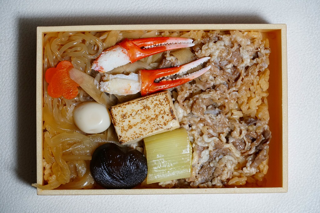 中身は味付き飯を牛肉煮、糸こんにゃく煮、ごぼう煮、タマネギ煮、豆腐煮、ネギ煮、カニ爪、しいたけ、ニンジン、うずら卵で覆うもので、これもやはり従前どおりのすきやき弁当。カニ爪とうずら卵を入れて、冬なのだろう。