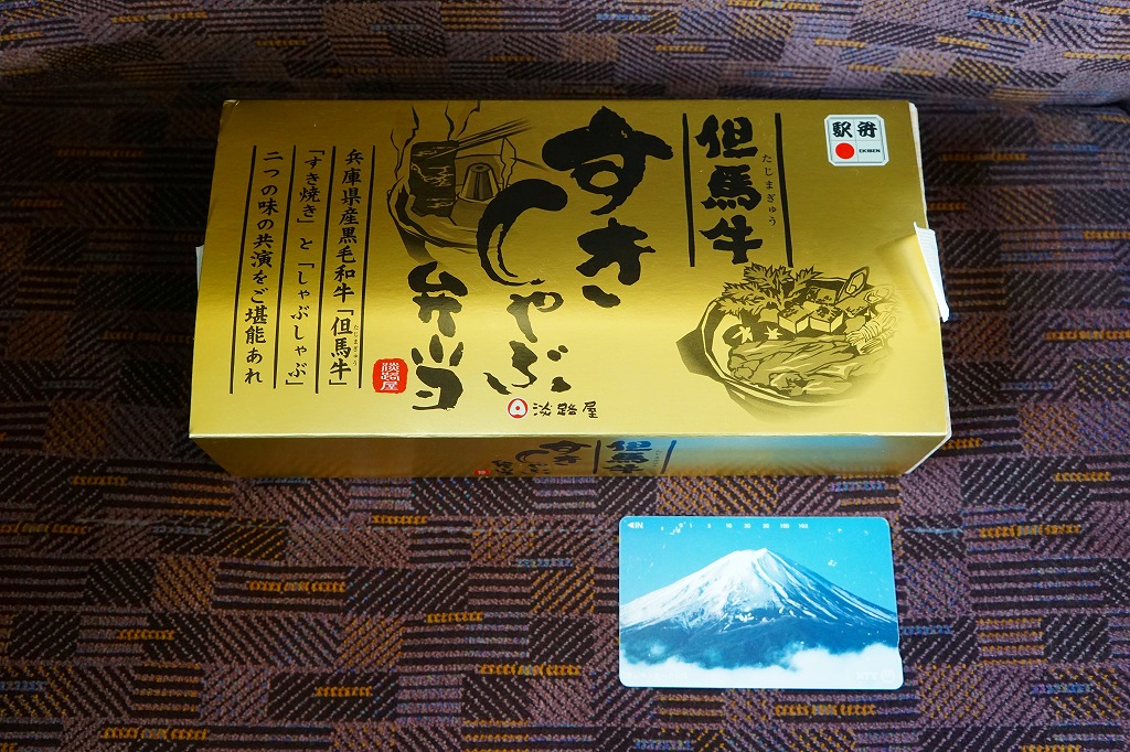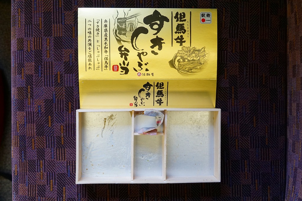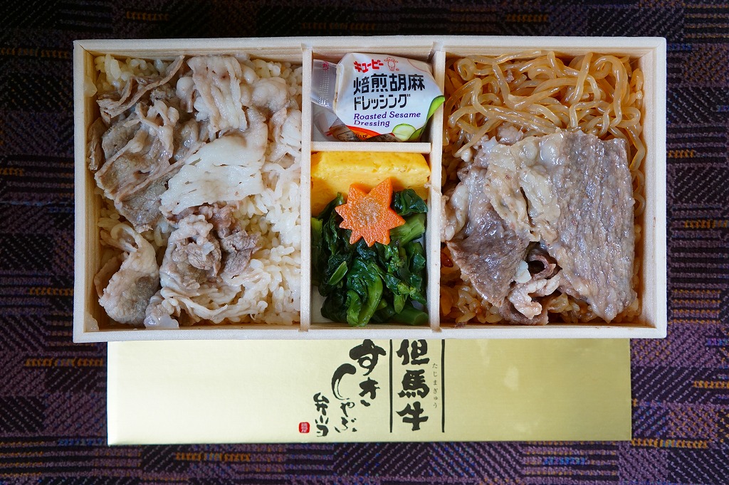 2013(平成25)年10月に1,200円で発売。駅弁の名前のとおり、但馬牛のしゃぶしゃぶ弁当と、但馬牛のすき焼き弁当の詰め合わせ。容器の左側で白飯を薄手の牛肉煮で覆い、右側で白飯を左より厚手の牛肉煮と糸こんにゃくで覆い、真ん中に菜の花と玉子焼とニンジンとドレッシングを据える。2015年の初頭までの販売か。