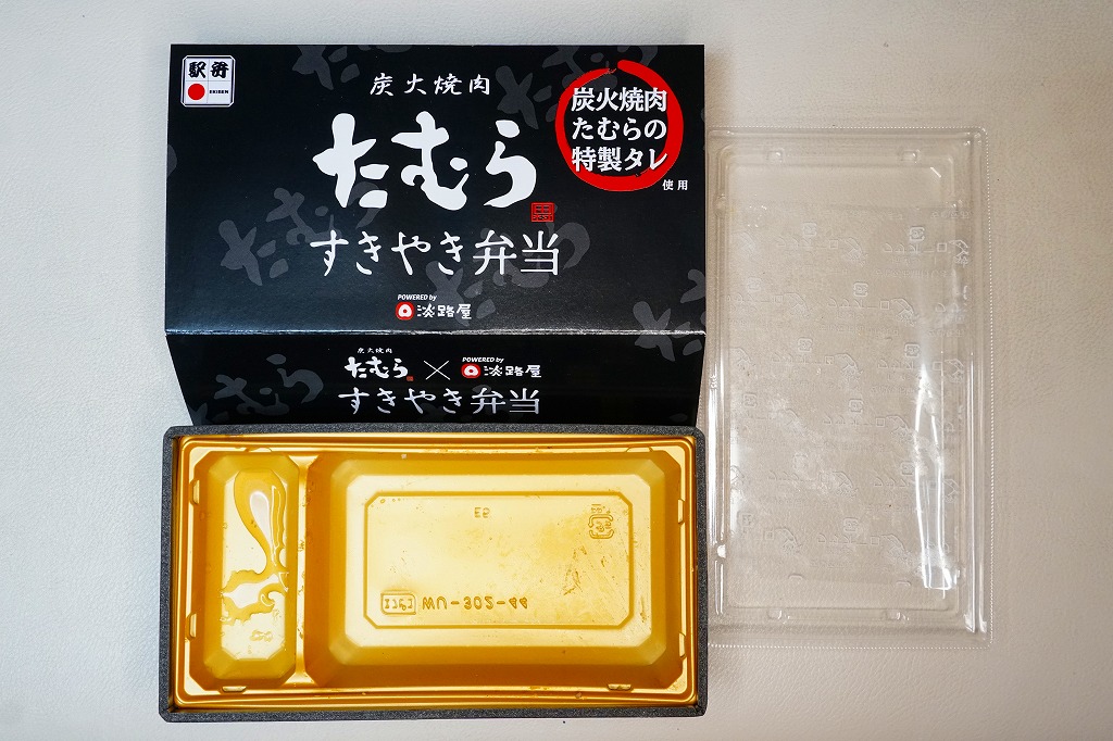 焼肉店のロゴと黒い色をしたスリーブに収めた黒い容器に、味付き飯を詰め、糸こんにゃくを敷いて牛肉煮で覆い、半身の煮玉子、ネギ炒めとタマネギ炒め、ニンジン、焼き豆腐を添える。関西でよく知られた名前を持つ、駅弁屋が常温向けにカスタマイズしたすき焼き弁当。2020年内までの販売か。