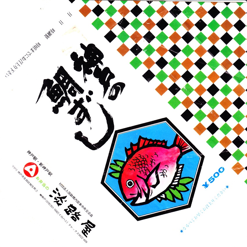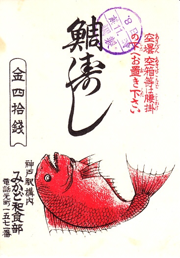 おそらく1920年代の調製と思われる、昔の神戸駅弁の掛紙。現在の神戸やその周辺にタイの駅弁は残っていないが、明石などの瀬戸内海は今もタイの産地であり、かつて東海道・山陽本線の大阪駅から上郡駅までの各駅でタイの駅弁が売られた。全国共通の赤いタイのイラストが鮮やか。