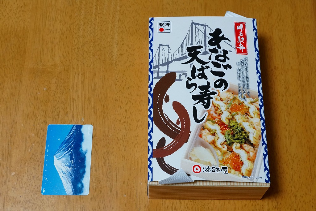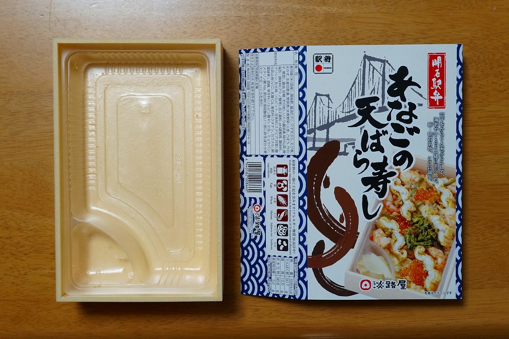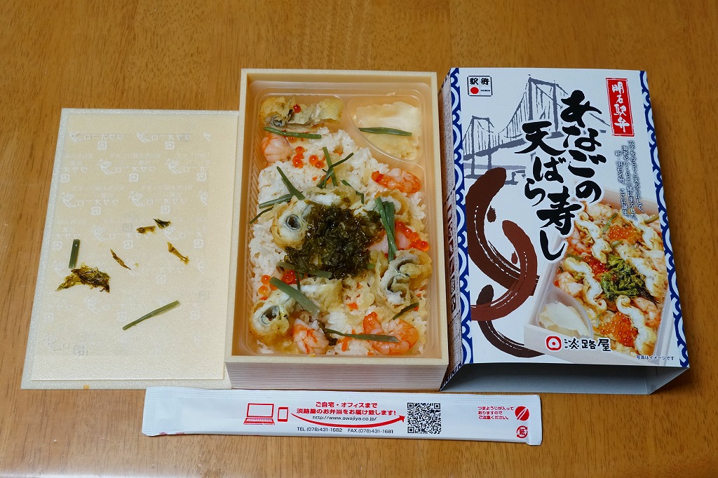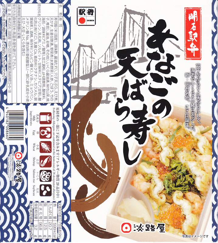 2021(令和3)年1月の京王百貨店の駅弁大会で輸送販売。「たこの天ばら寿し」と同時に発売か。明石海峡大橋とは明らかに異なる吊り橋とアナゴと中身の写真を印刷したスリーブには「明石駅弁」と書いてあり、しかしJR明石駅や山陽明石駅では駅弁は売られていないはずで、催事の駅弁リストでは西明石駅の駅弁としていた。中身は酢飯にアナゴ天とエビ煮を散らし、イクラ、焼き海苔、山菜で彩り、甘酢生姜を添えるもの。酢飯と常温により、風味が独特な天丼。2022年までの販売か。
