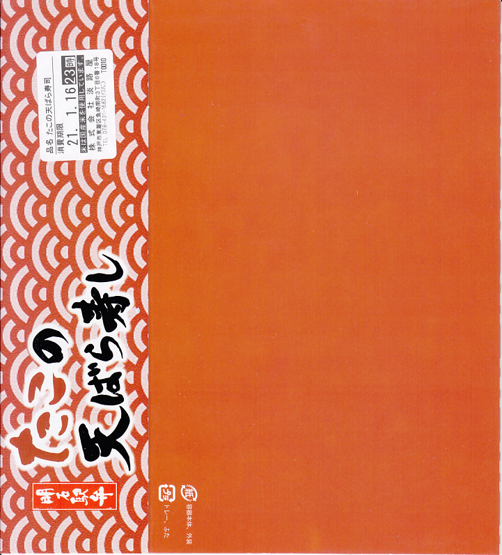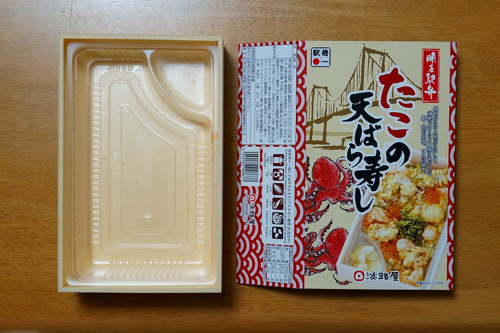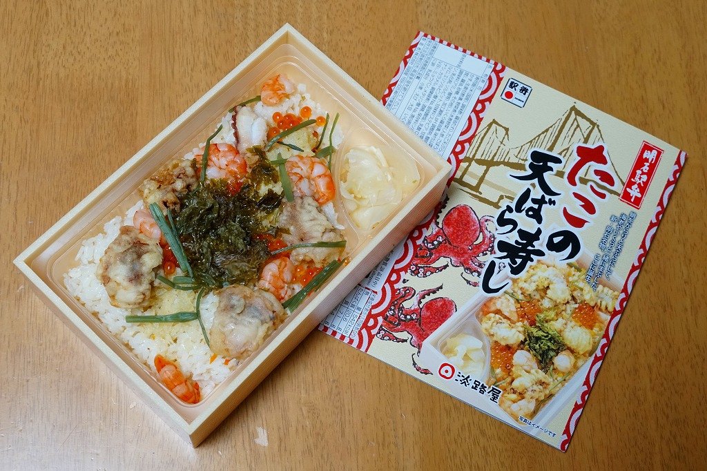 2021(令和3)年1月の京王百貨店の駅弁大会で輸送販売。「あなごの天ばら寿し」と同時に発売か。明石海峡大橋とは明らかに異なる吊り橋とタコと中身の写真を印刷したスリーブには「明石駅弁」と書いてあり、しかしJR明石駅や山陽明石駅では駅弁は売られていないはずで、催事の駅弁リストでは西明石駅の駅弁としていた。中身は酢飯にタコ天とエビ煮を散らし、イクラ、焼き海苔、山菜で彩り、甘酢生姜を添えるもの。酢飯と常温により、風味が独特な天丼。京王以外で売られたかは不詳。