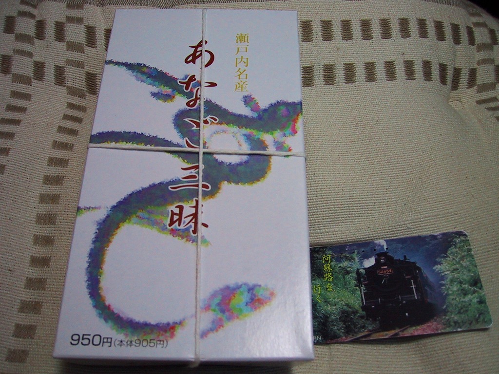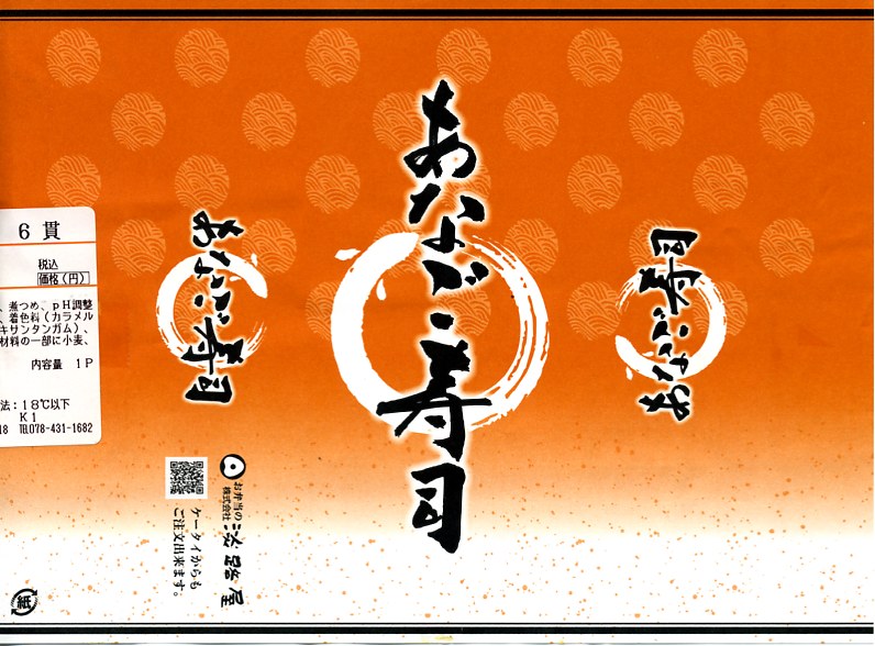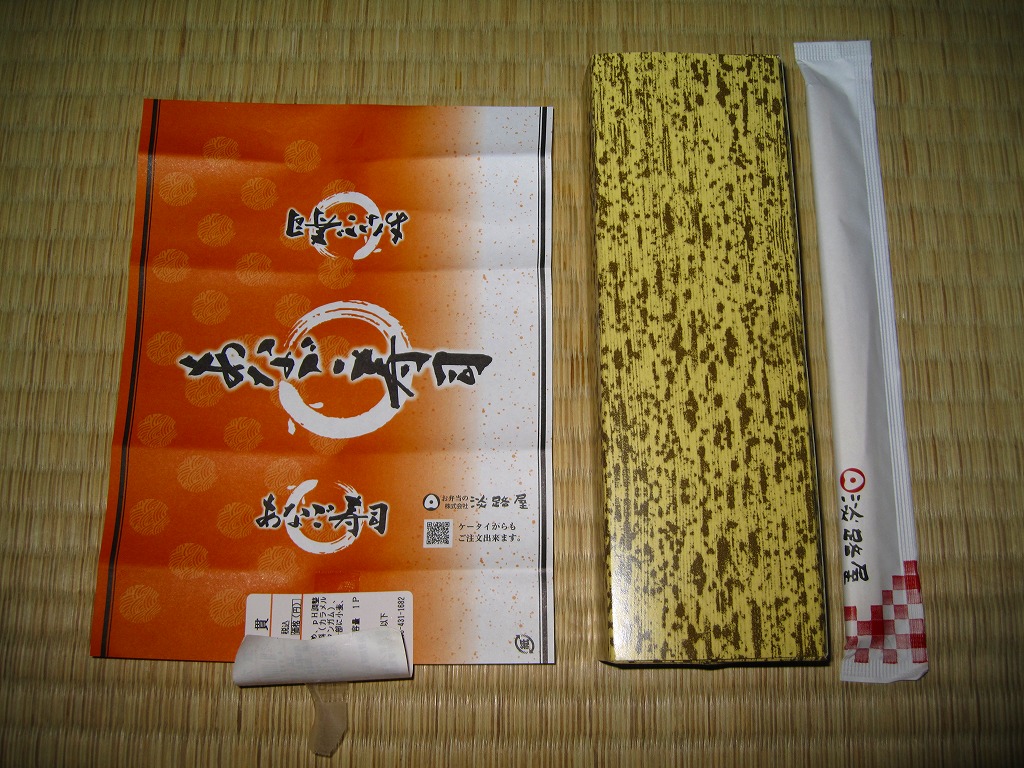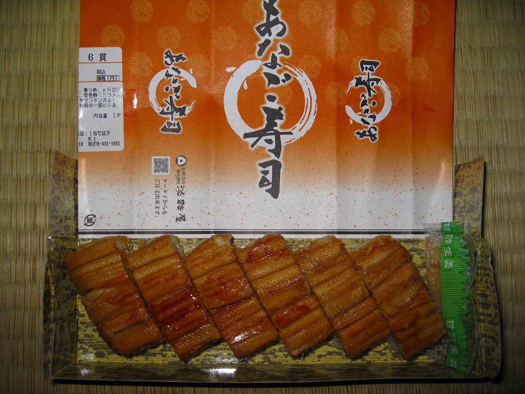 竹皮を模したボール紙の箱に、商品名だけを書いた橙色の掛紙を巻く。中身は箱に直接、バッテラ型の柔らか煮穴子を6切れ収めるもの。宮島口や高松や姫路などと異なり、神戸駅弁の穴子寿司は評判が聞かれず、そもそも紹介例や収穫報告さえ見られないところだが、味はなかなか負けていない。現在は販売されていない模様。