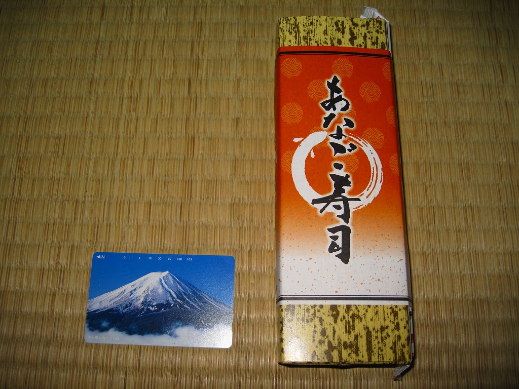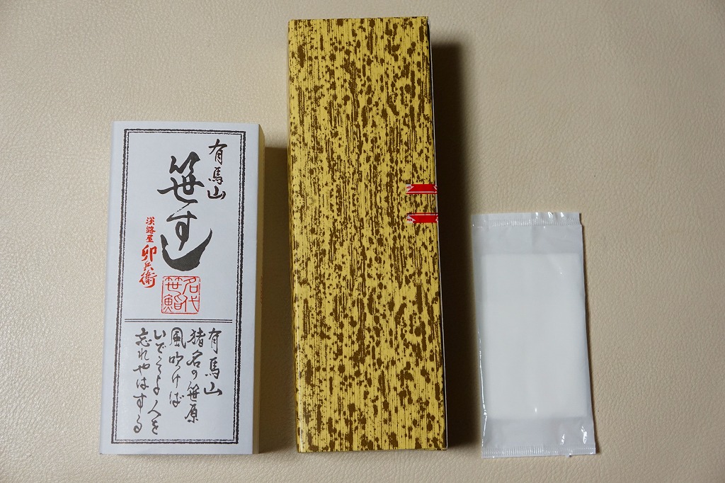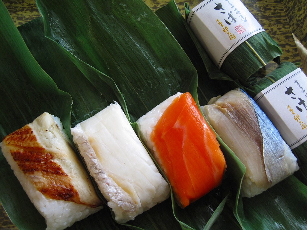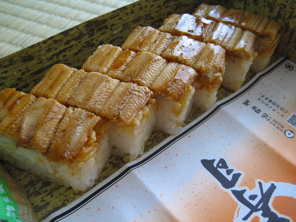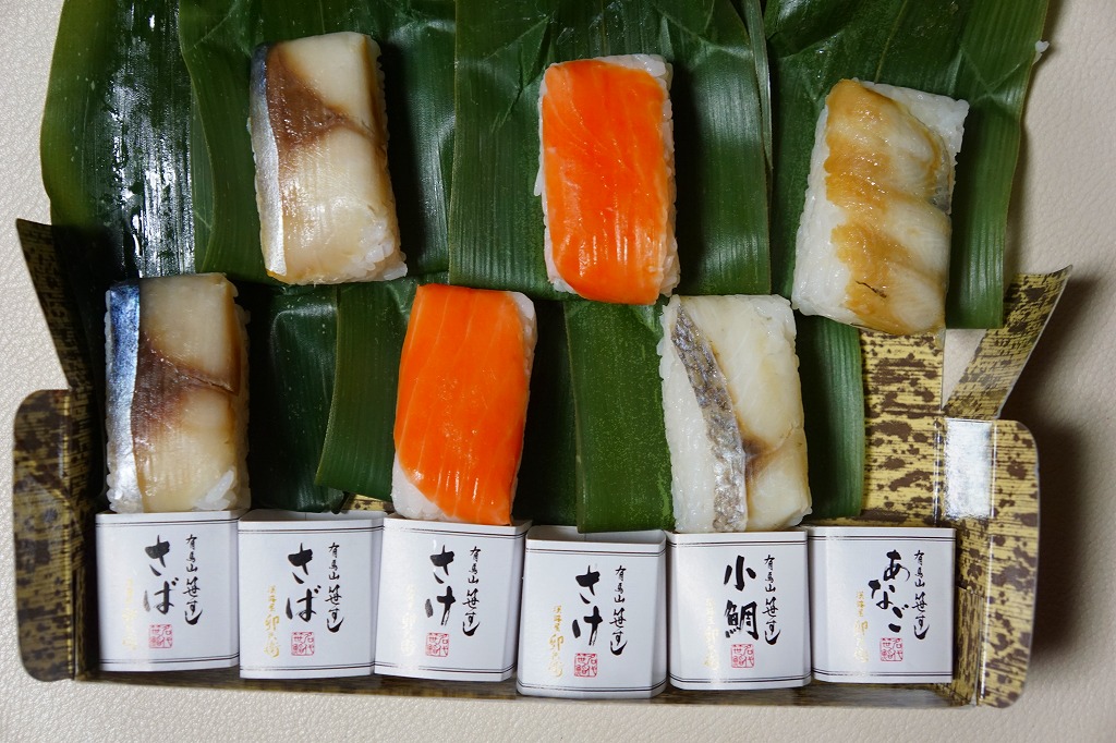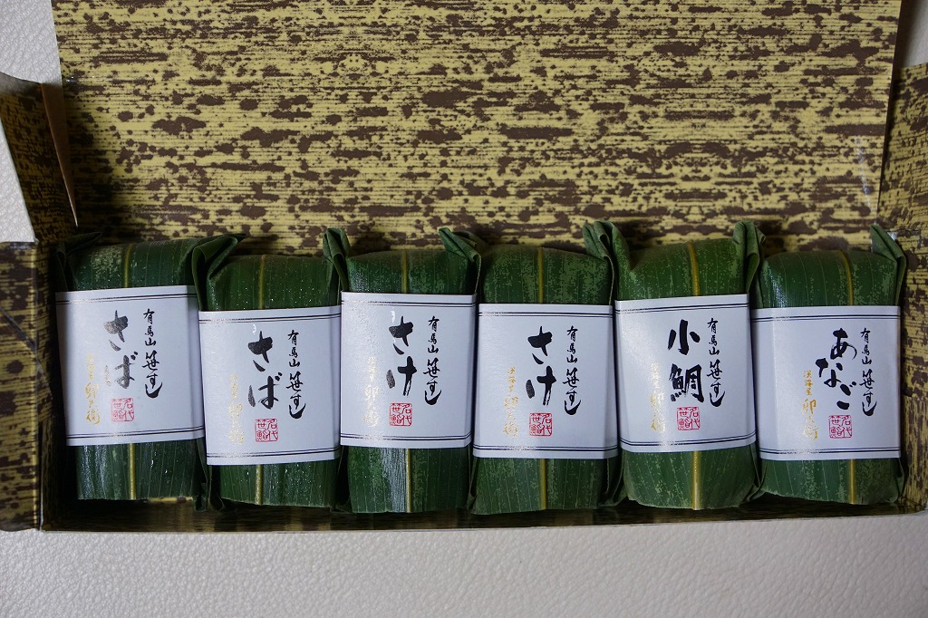 2008(平成20)年までに発売か。竹皮を模したボール紙の箱の中に、中身を書いた紙帯を締めた笹巻きのブロックが6個並ぶ。中身はあなごが1個、小鯛が1個、さけが2個、さばが2個、きゅっときっちり詰まった握り寿司タイプの押寿司がそれぞれに収まるもの。分量はとてもとても少ない。柿の葉寿司の地域で笹寿司とは、珍しいのではないかと思う。2017年までの販売か。