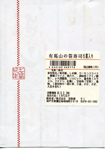 2010(平成22)年5月2日に購入した、新神戸駅弁の掛紙。上記の2017年のものと、まったく同じ。製造委託記号も同じものが付いている。